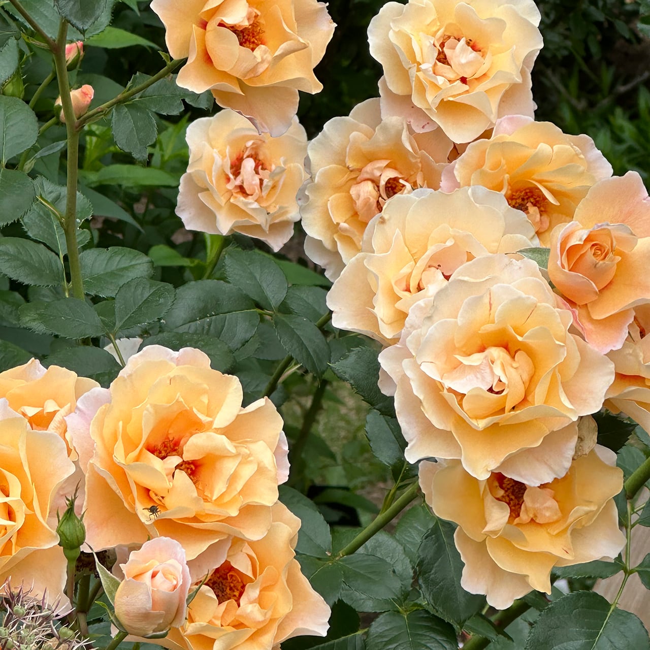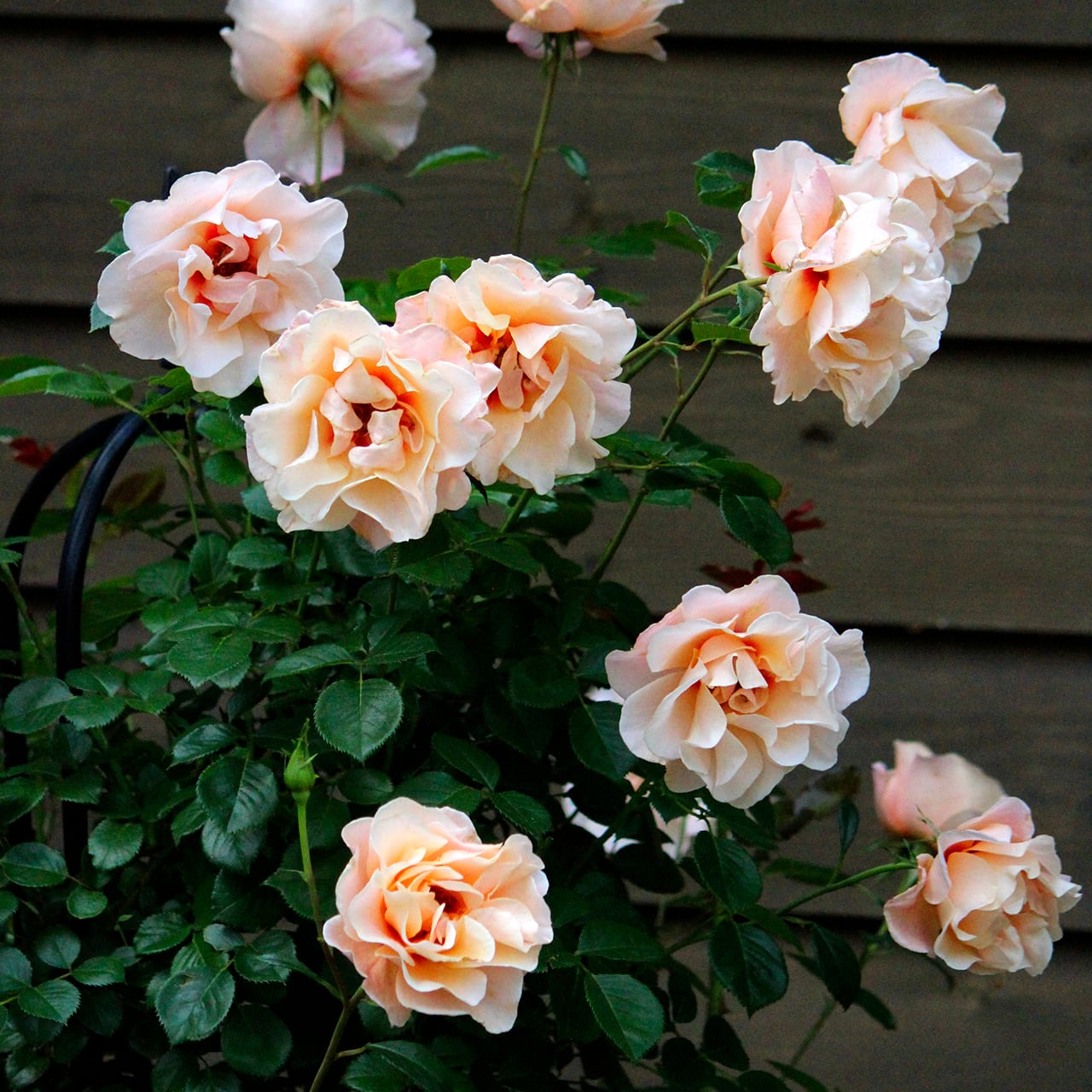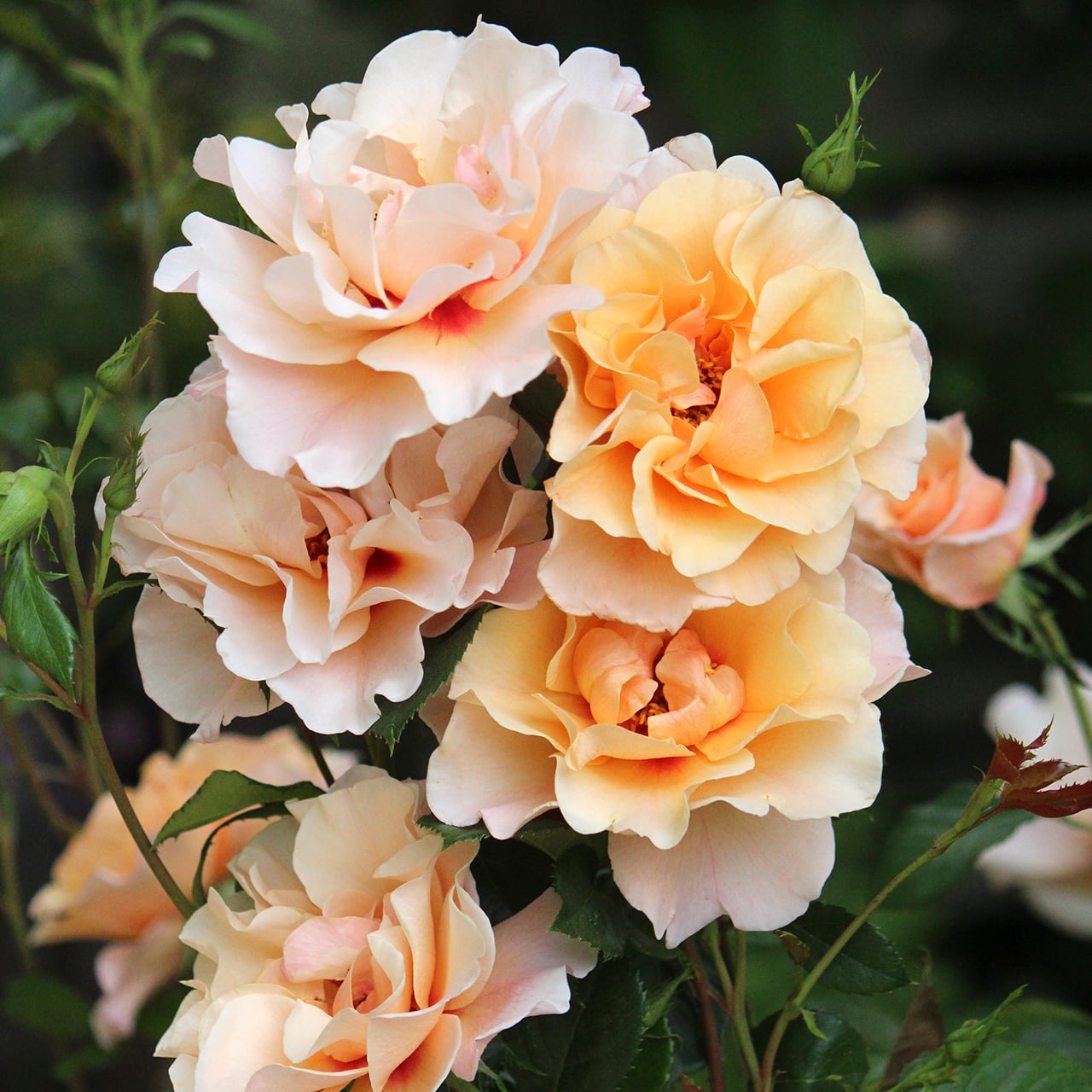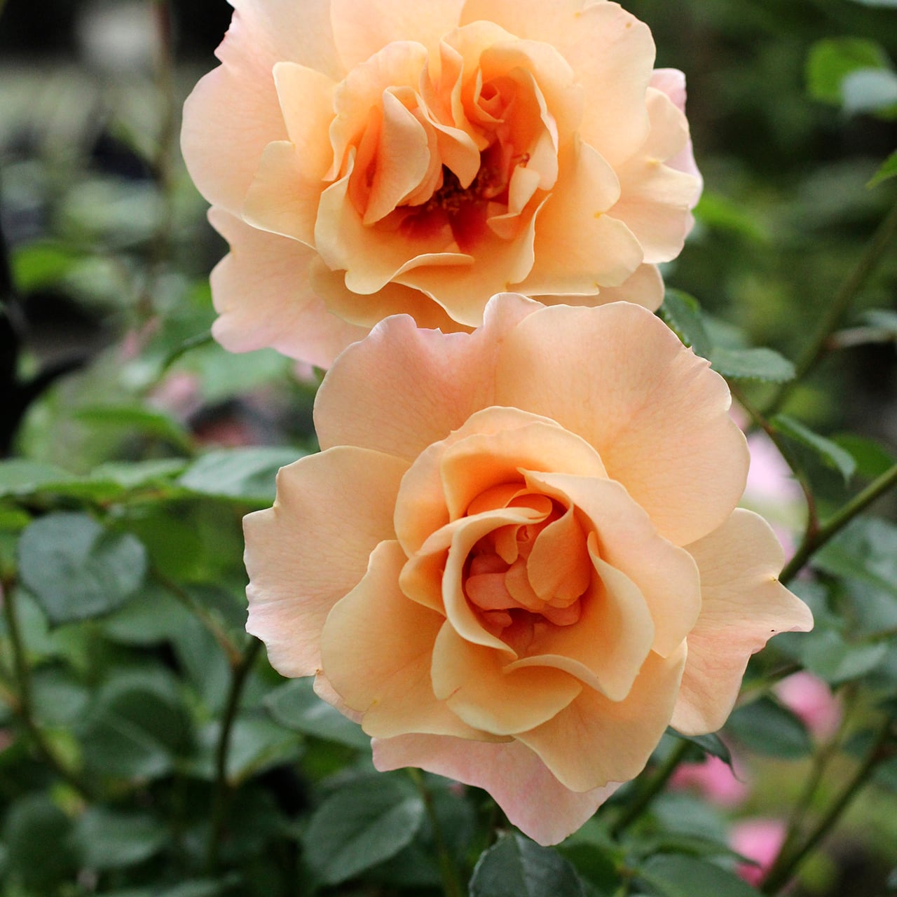 アプリコットピンクの花は、花弁の縁が柔らかく波打ち上品な印象。花の中心に入る鮮やかなローズピンクのアイが魅力。花付きが良く、数輪の房咲きになる。ダークグリーンの細かい葉は美しく、耐病性に優れる。コンパクトでまとまりが良く、鉢栽培にも向く。