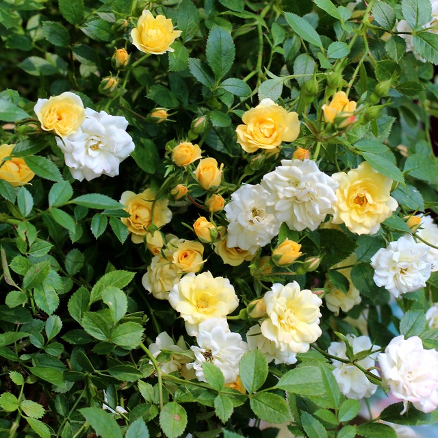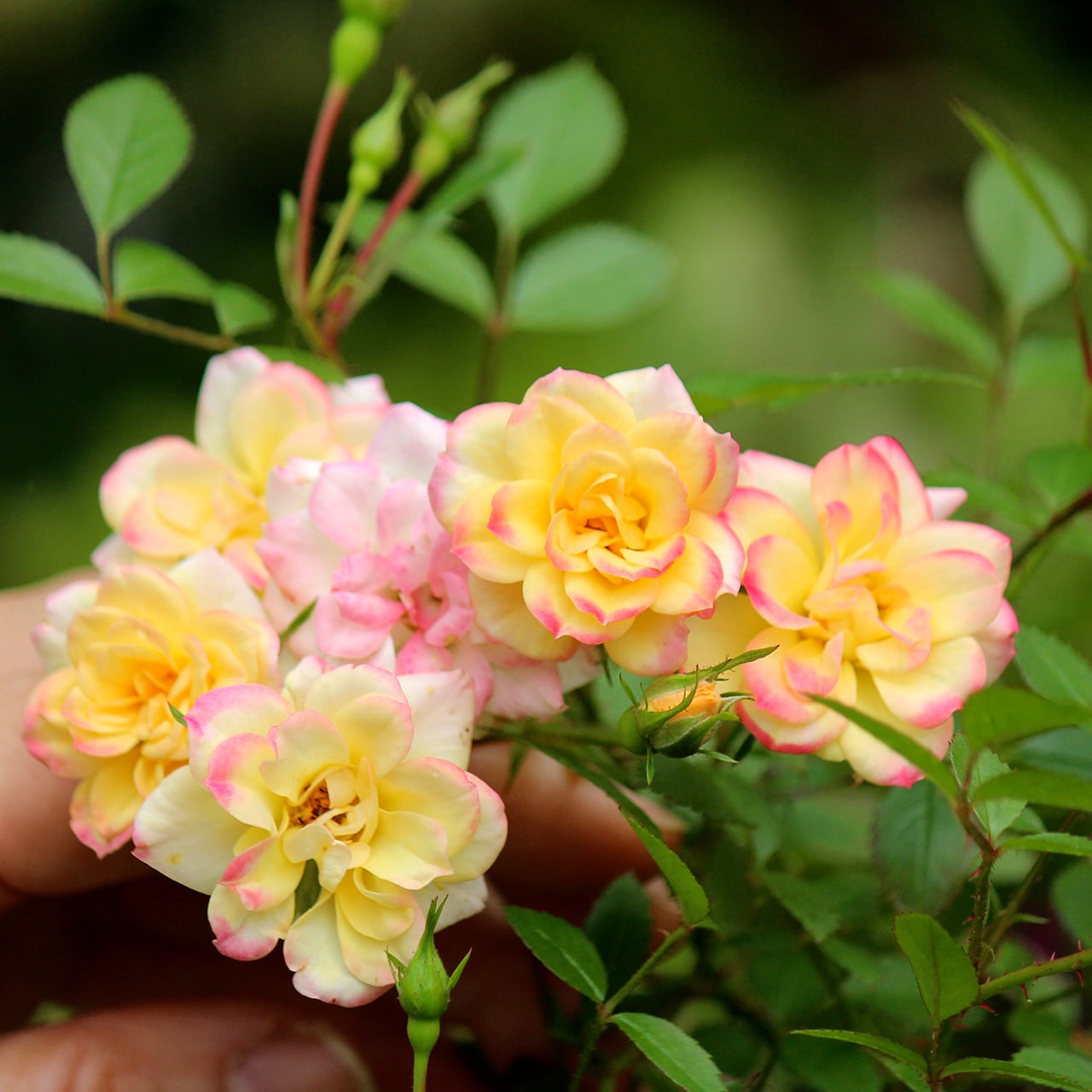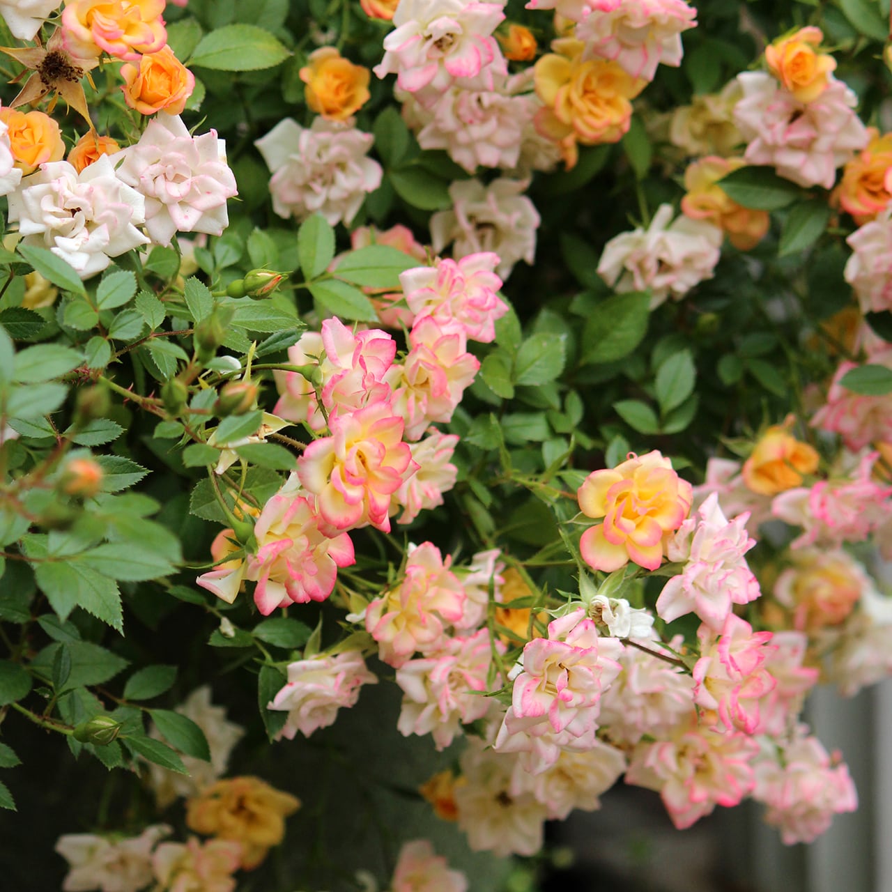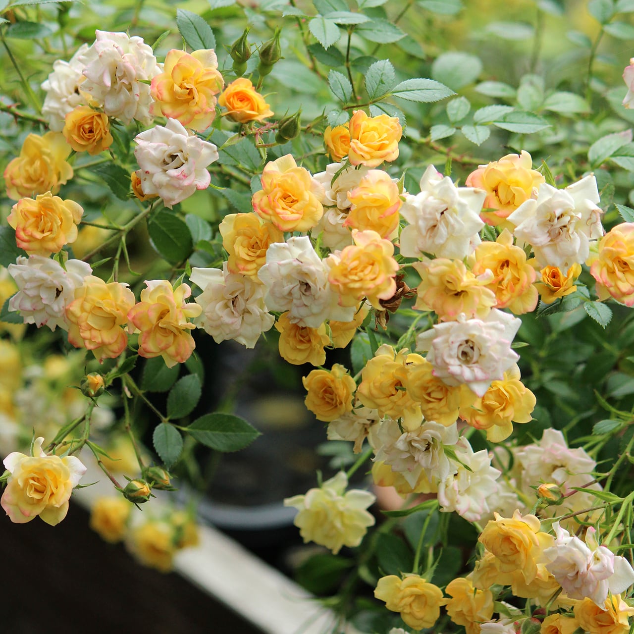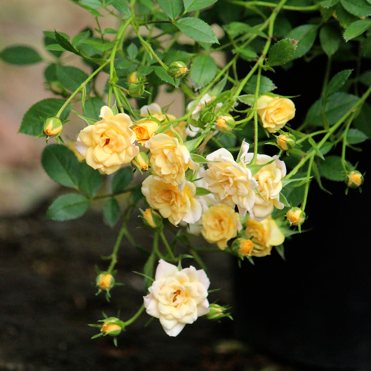 ところどころに赤みのさす黄色の小さな花が大きめの房咲きになる。枝は細くしなやかで分枝が多く、まとまりの良い株に生育する。春以降も初夏から秋にかけて時折返り咲く。ミニタイプのつるバラとしても扱うことができ、グランドカバーとしても利用できる。