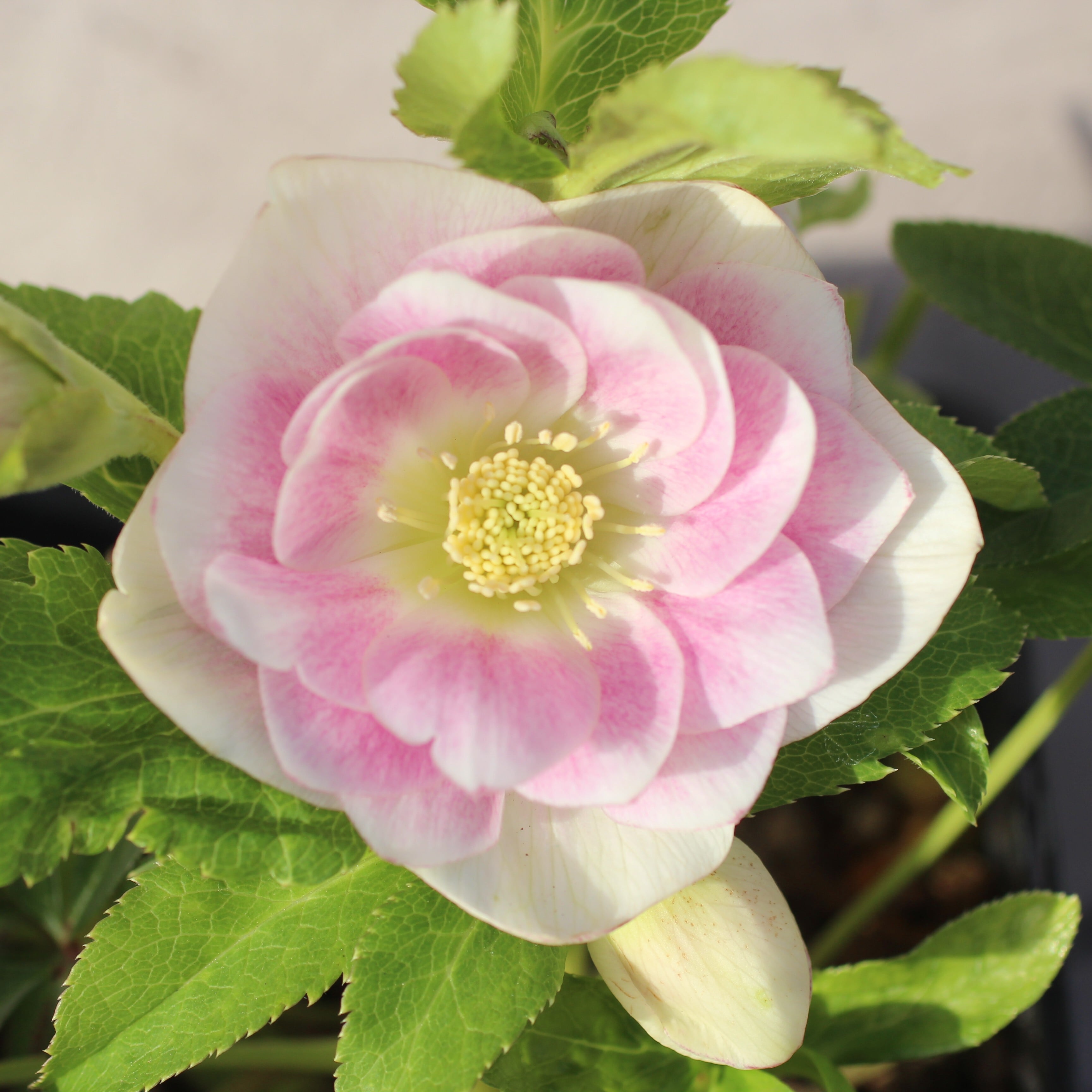ピンクの優しいかすり模様が美しいクレオンのダブル。草丈が低く、上向きな一番花が魅力。(12/13撮影)
