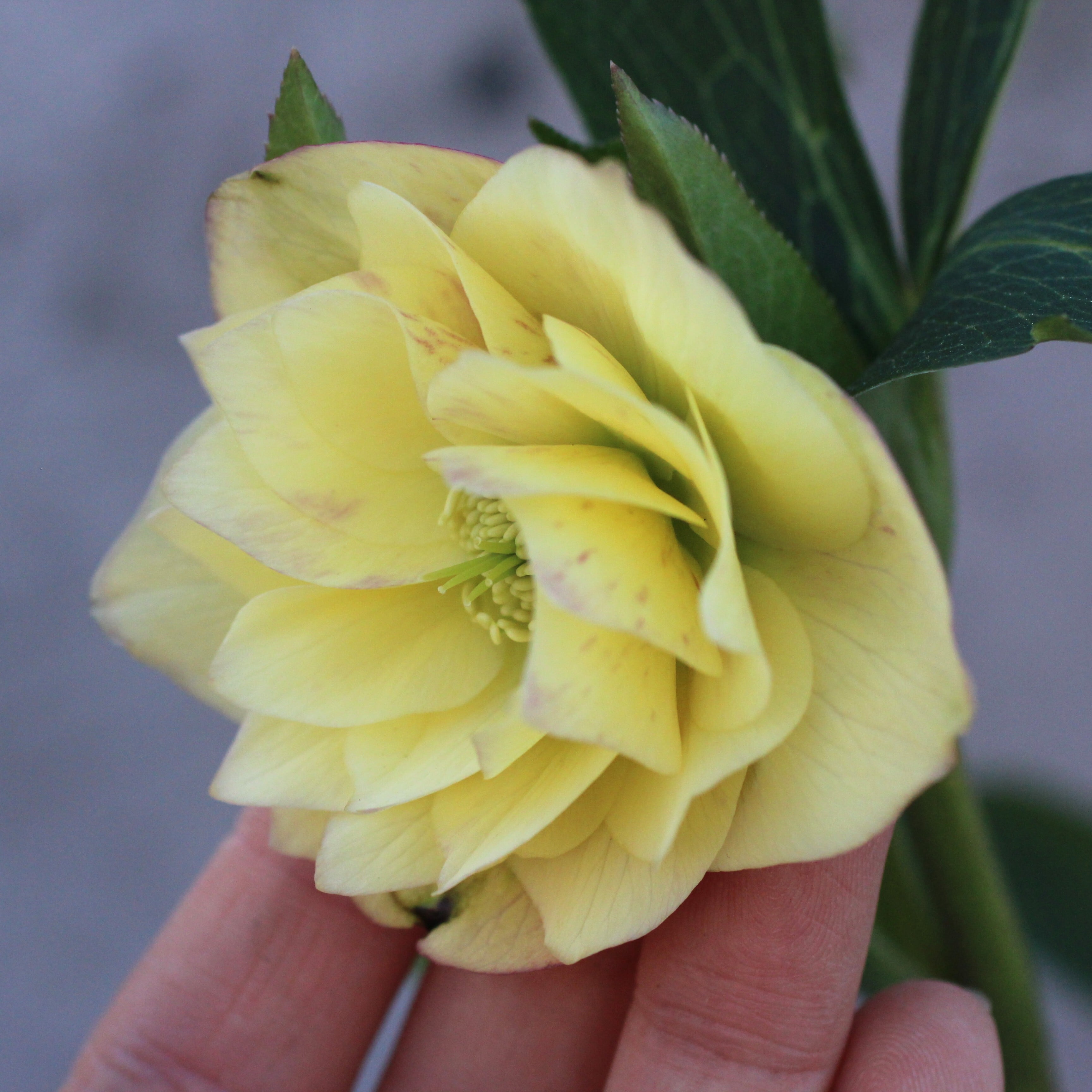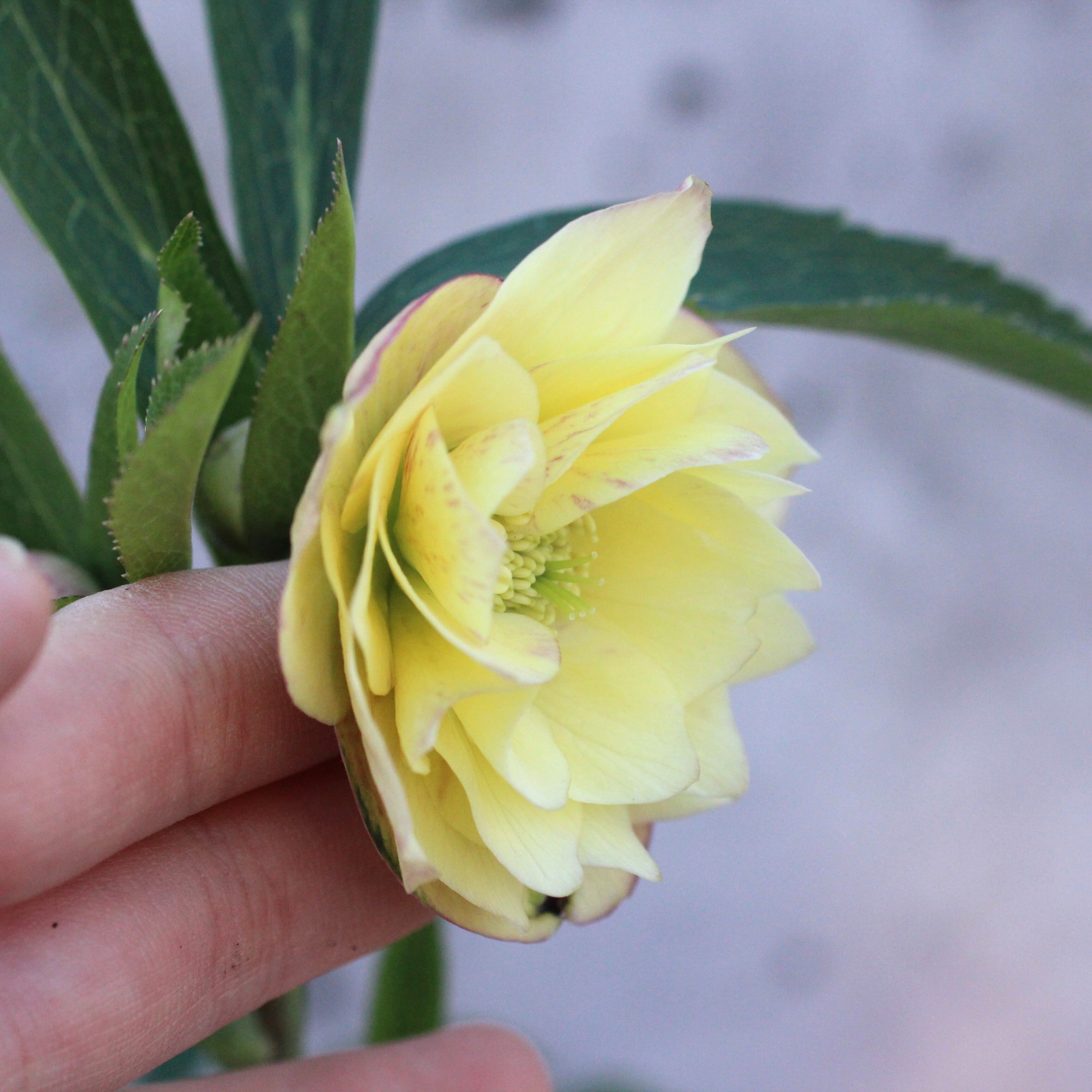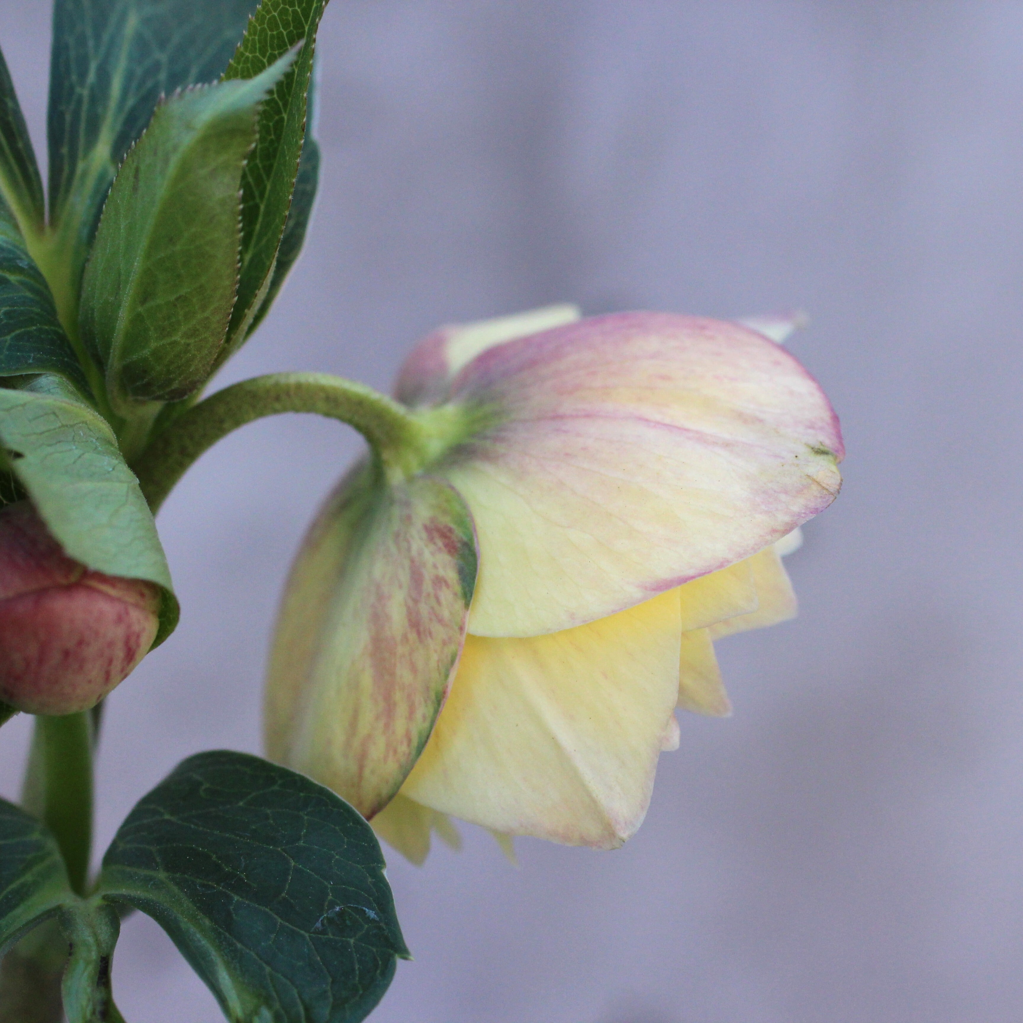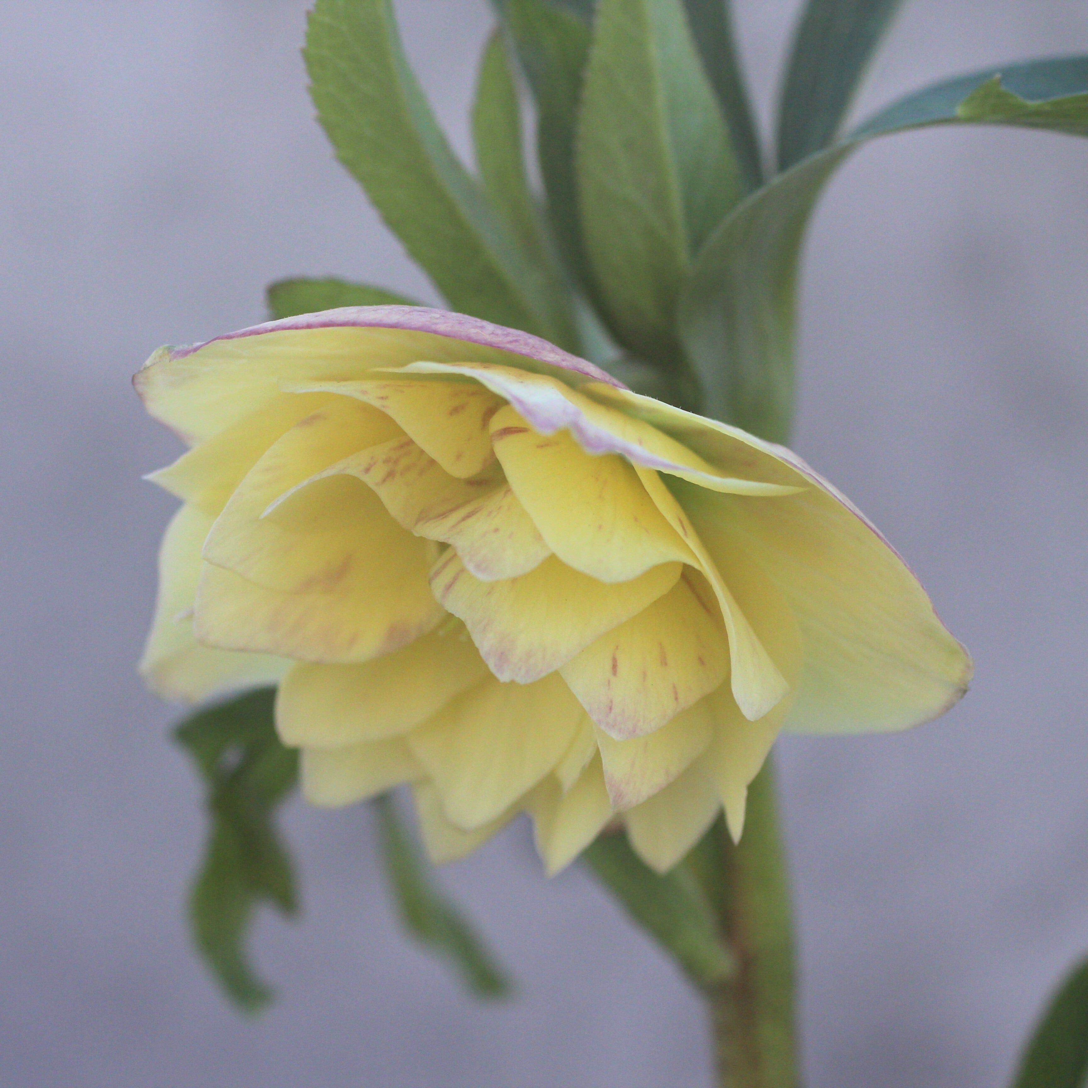 ほのかにピンクのしぼりが入るイエローのダブル。ピンクのつぼみはしぼりが濃く入り、美しい。花弁の一部に黒い汚れあり。つぼみ付き。(12/19撮影)