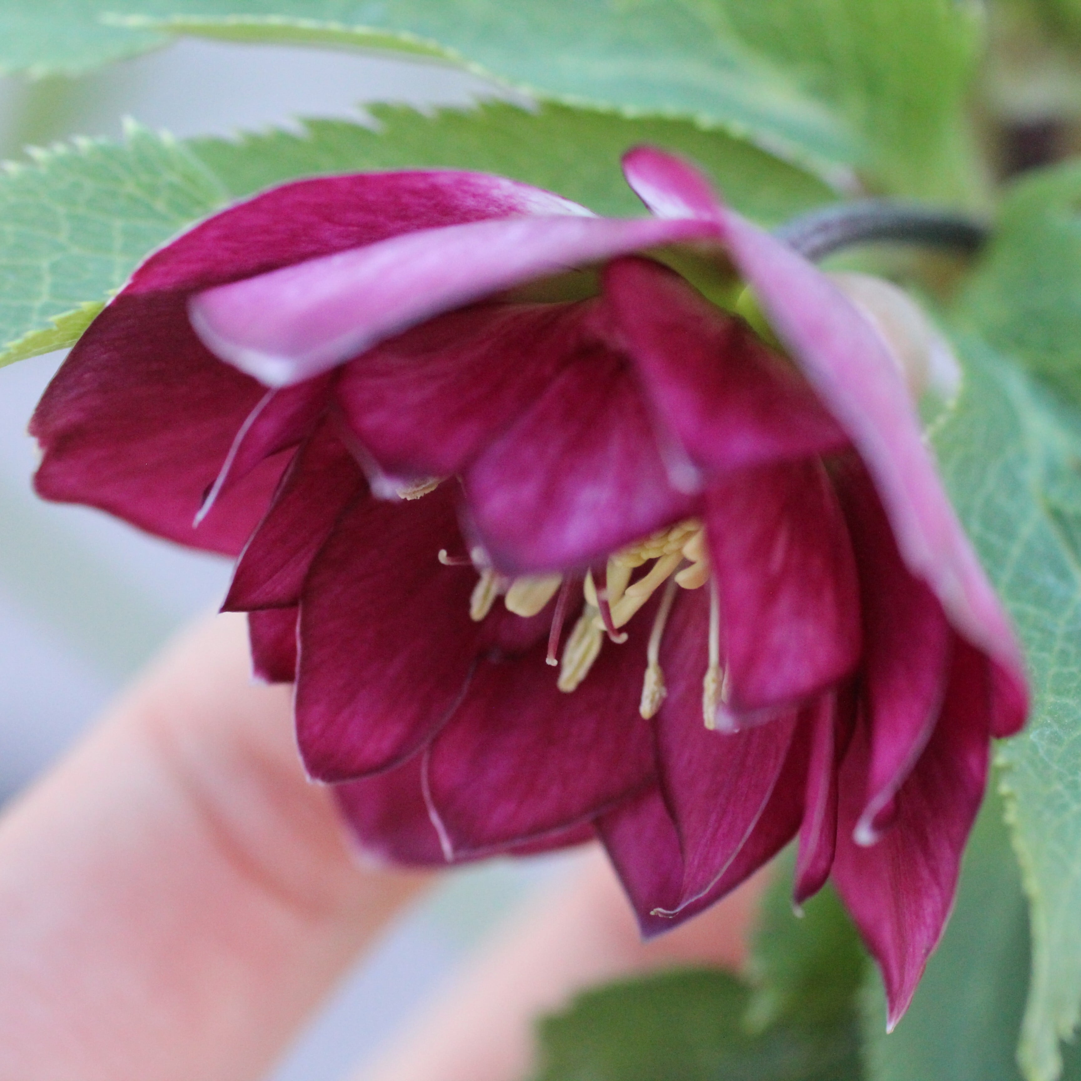 珍しいレッドのリバーシブルダブル。表は染めたような赤が大変美しい。花弁裏はシルバーがかり、花茎は黒軸でクールな一面も魅力。つぼみ付き。(12/19撮影)