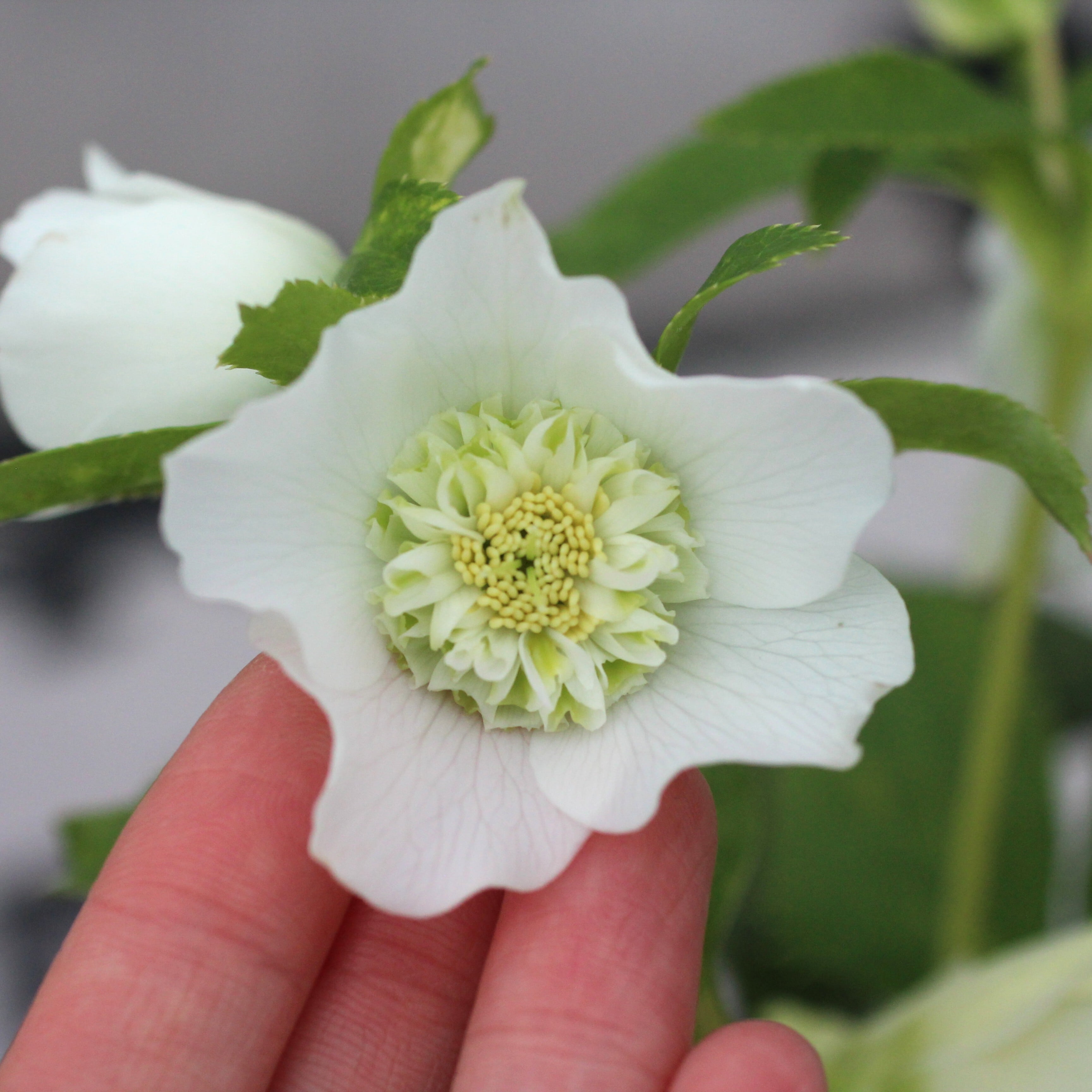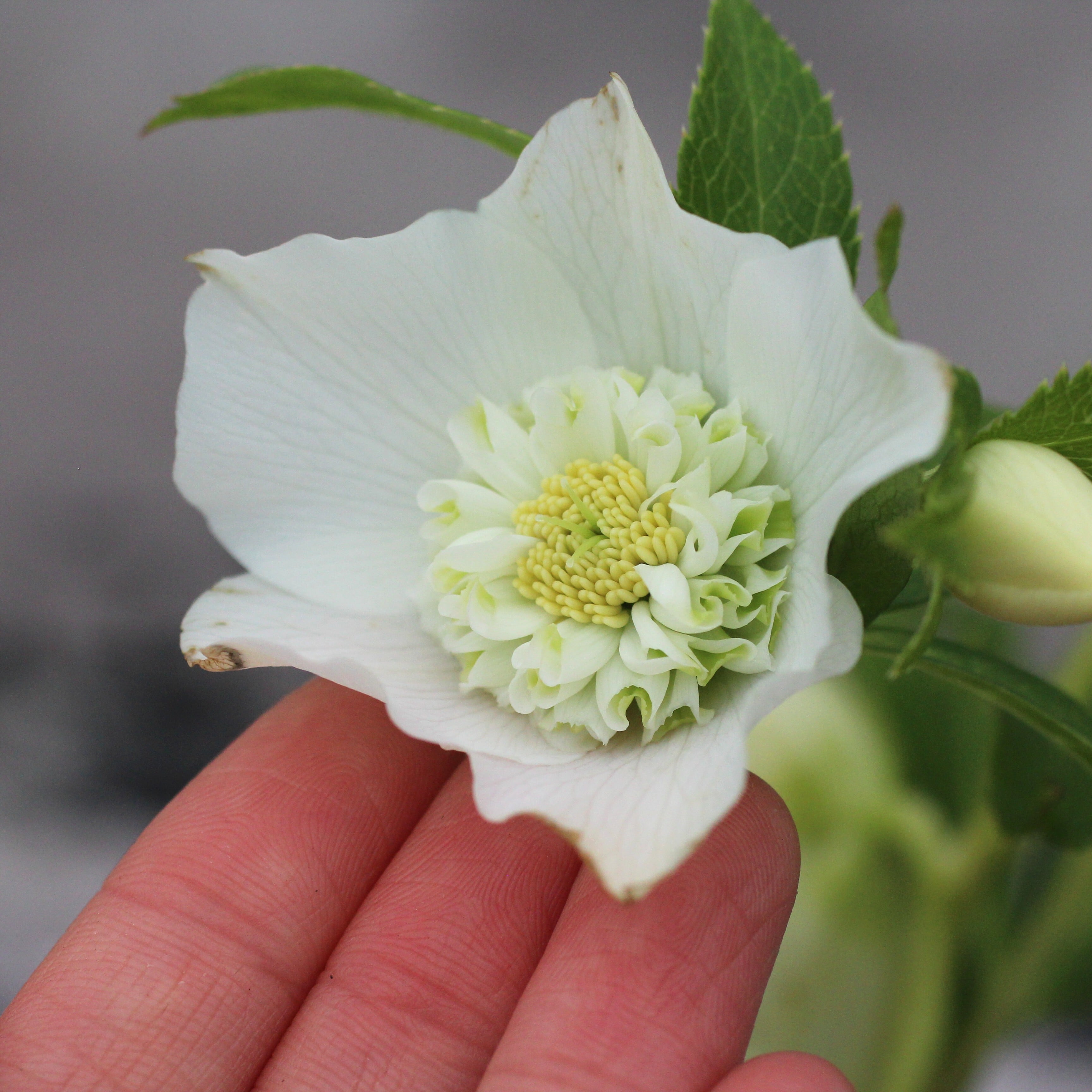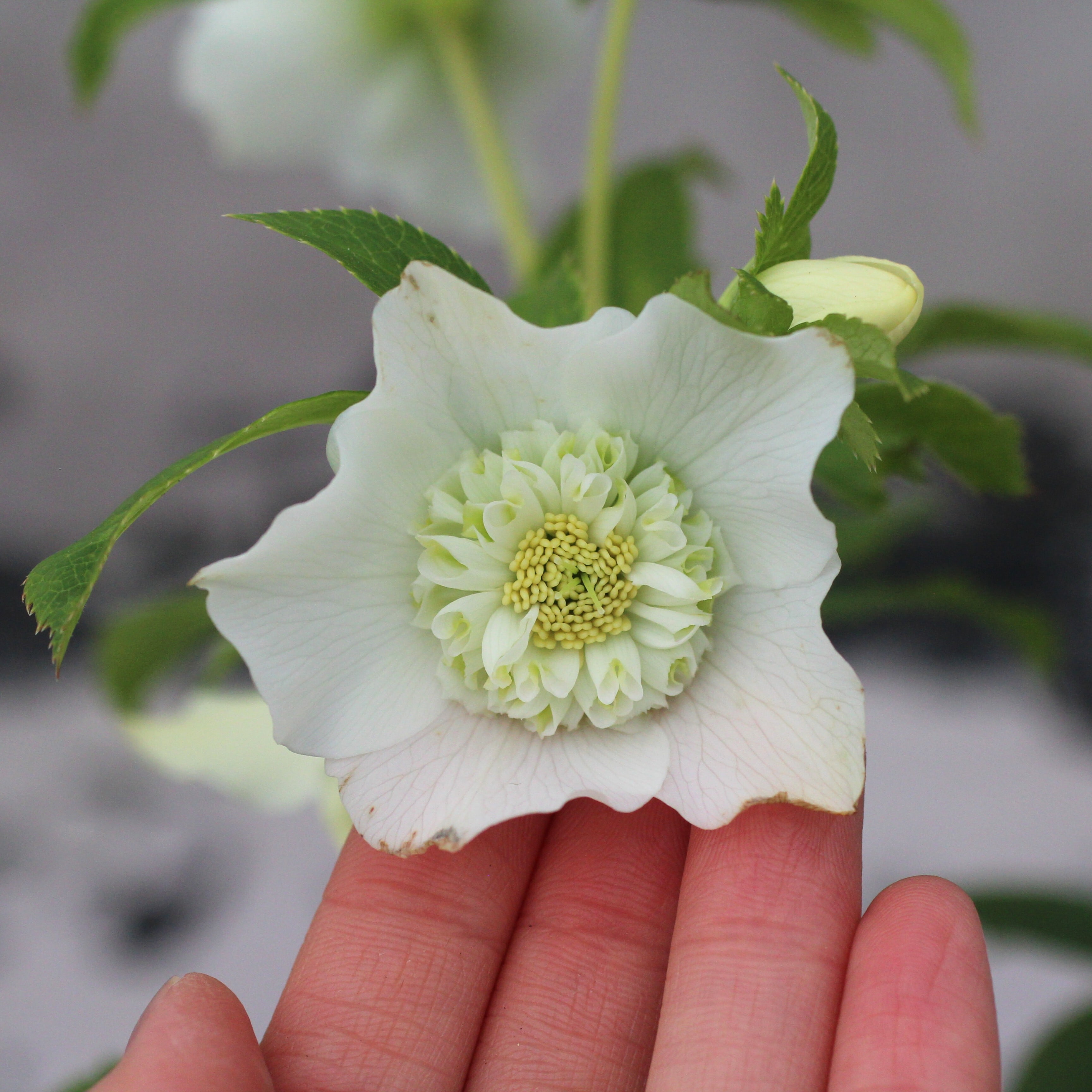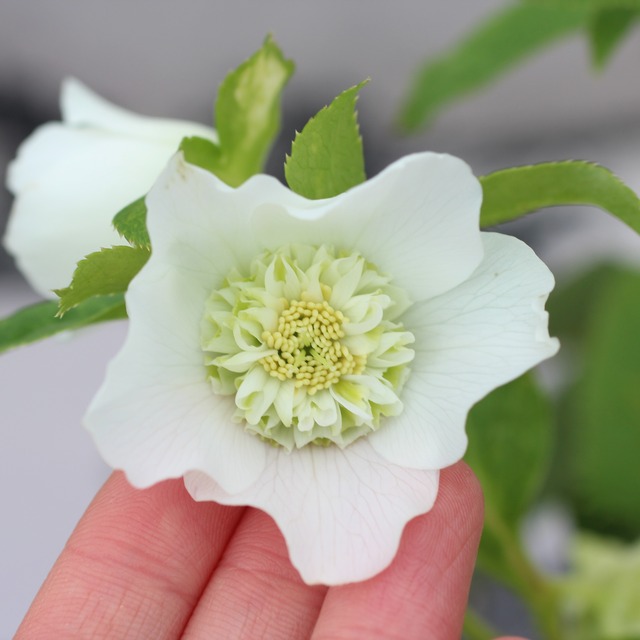 人気シリーズ「レ・フレール」のホワイトで珍しいセミダブル。幾重にも重なる緻密な筒状のネクタリーには、グリーンが入り美しい。一番花終わり、二番花に汚れあり。つぼみ付き。(12/25撮影)
