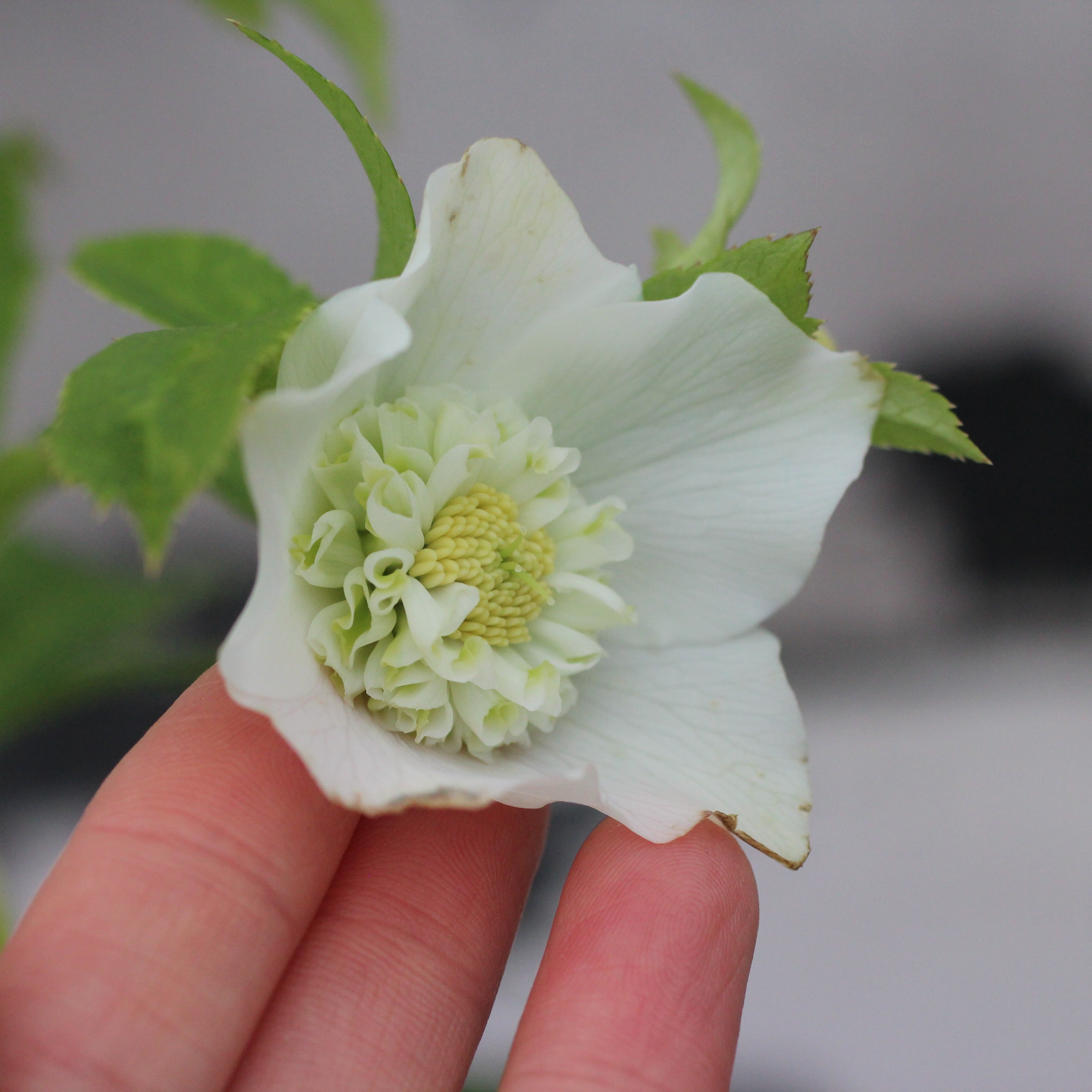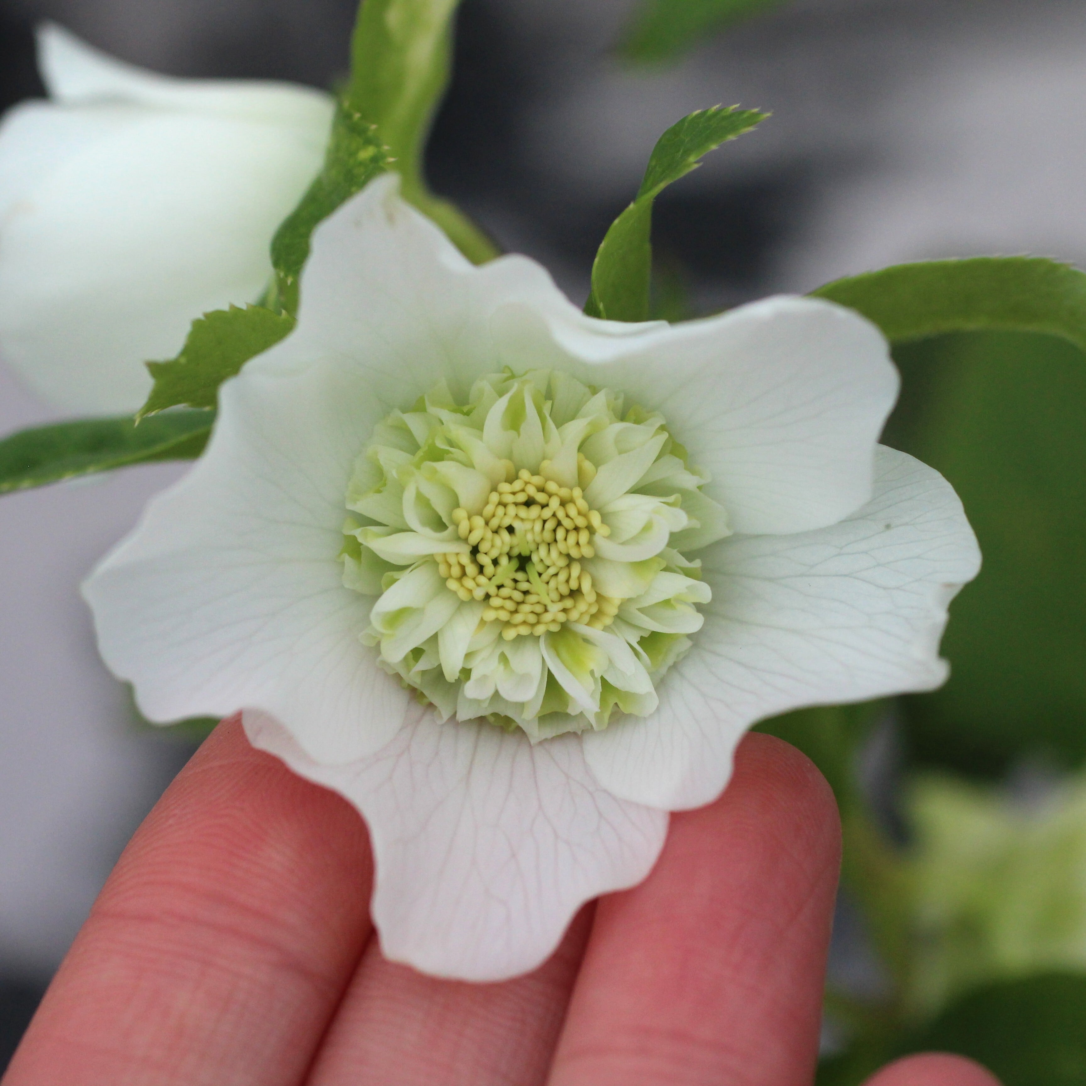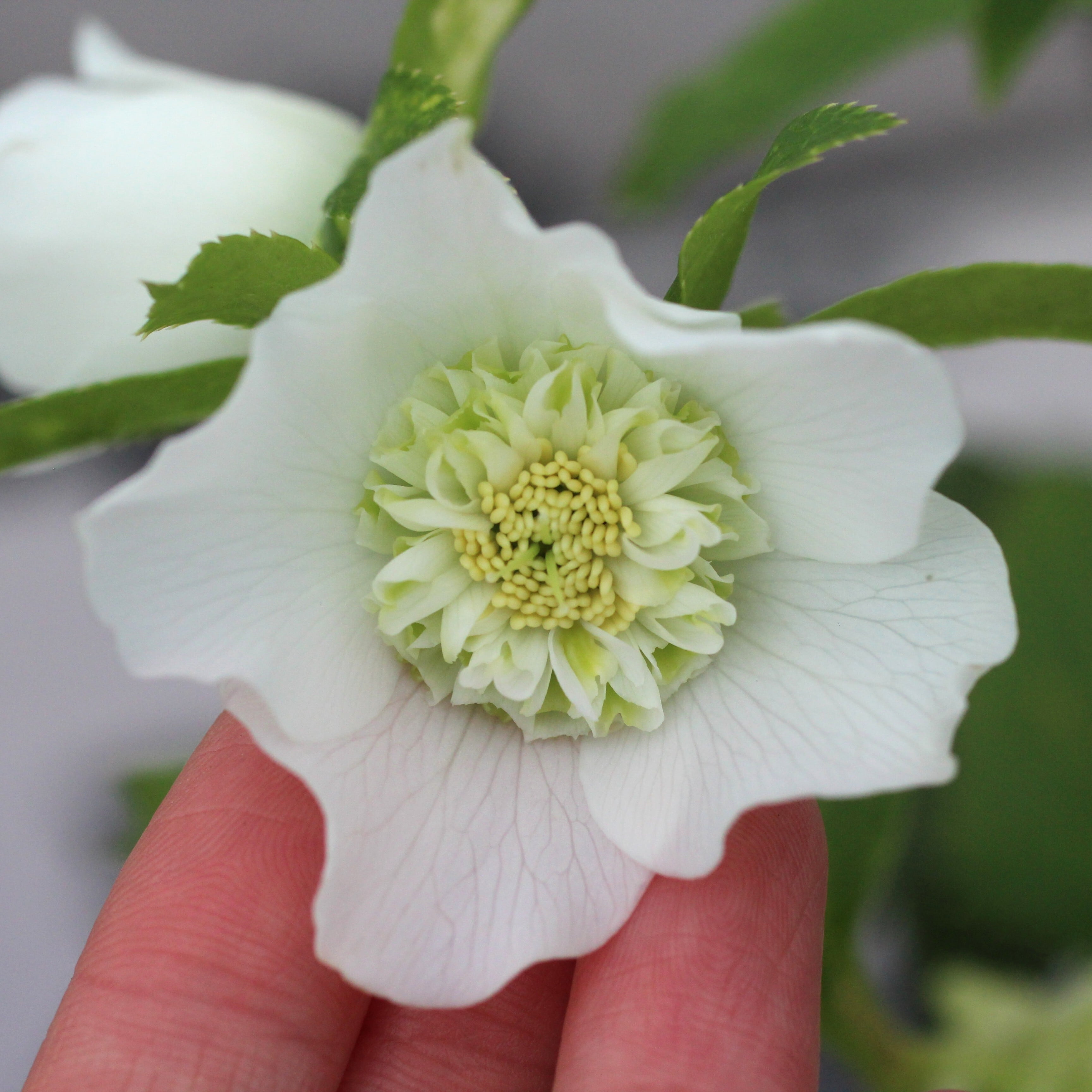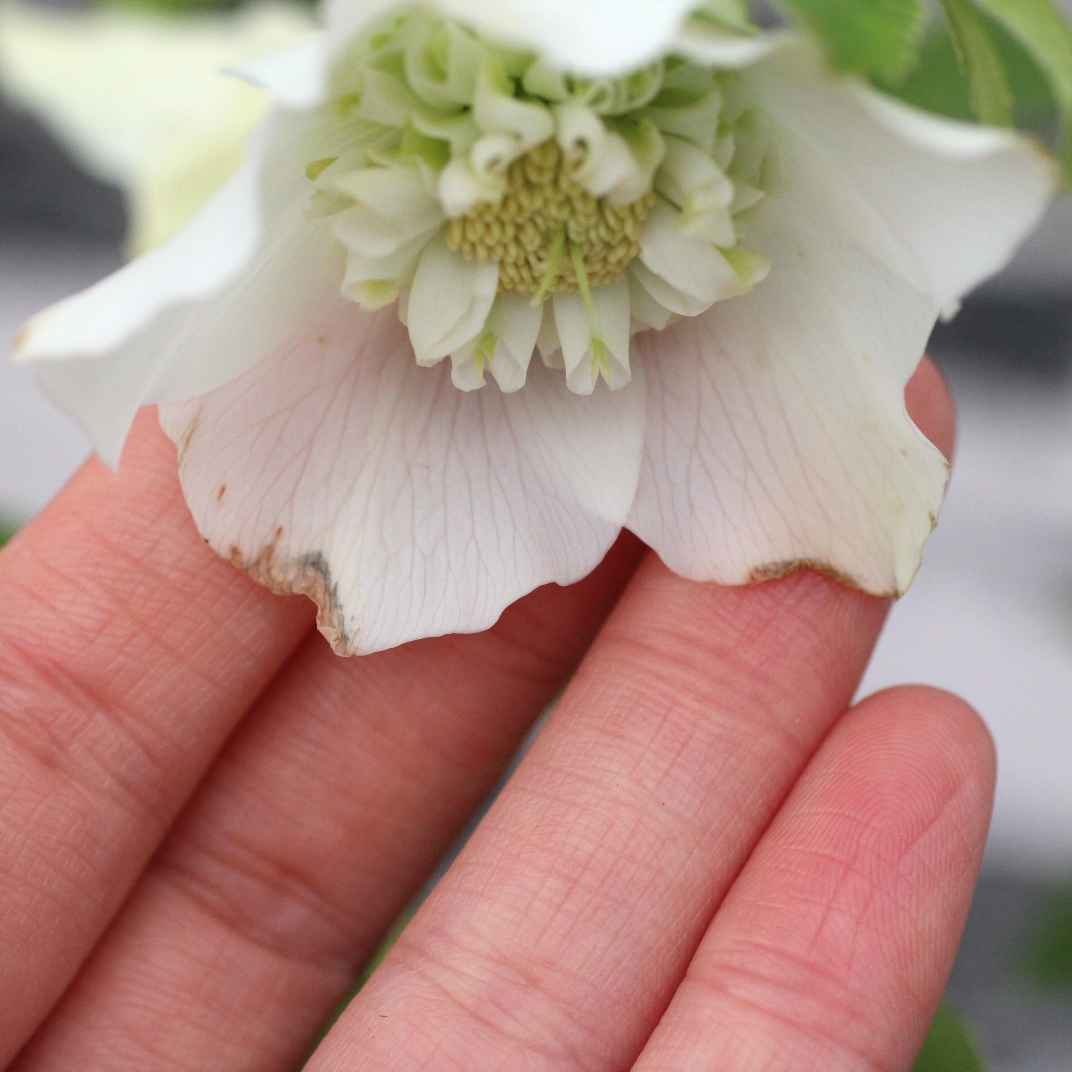 人気シリーズ「レ・フレール」のホワイトで珍しいセミダブル。幾重にも重なる緻密な筒状のネクタリーには、グリーンが入り美しい。一番花終わり、二番花に汚れあり。つぼみ付き。(12/25撮影)