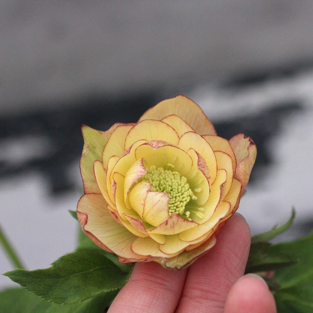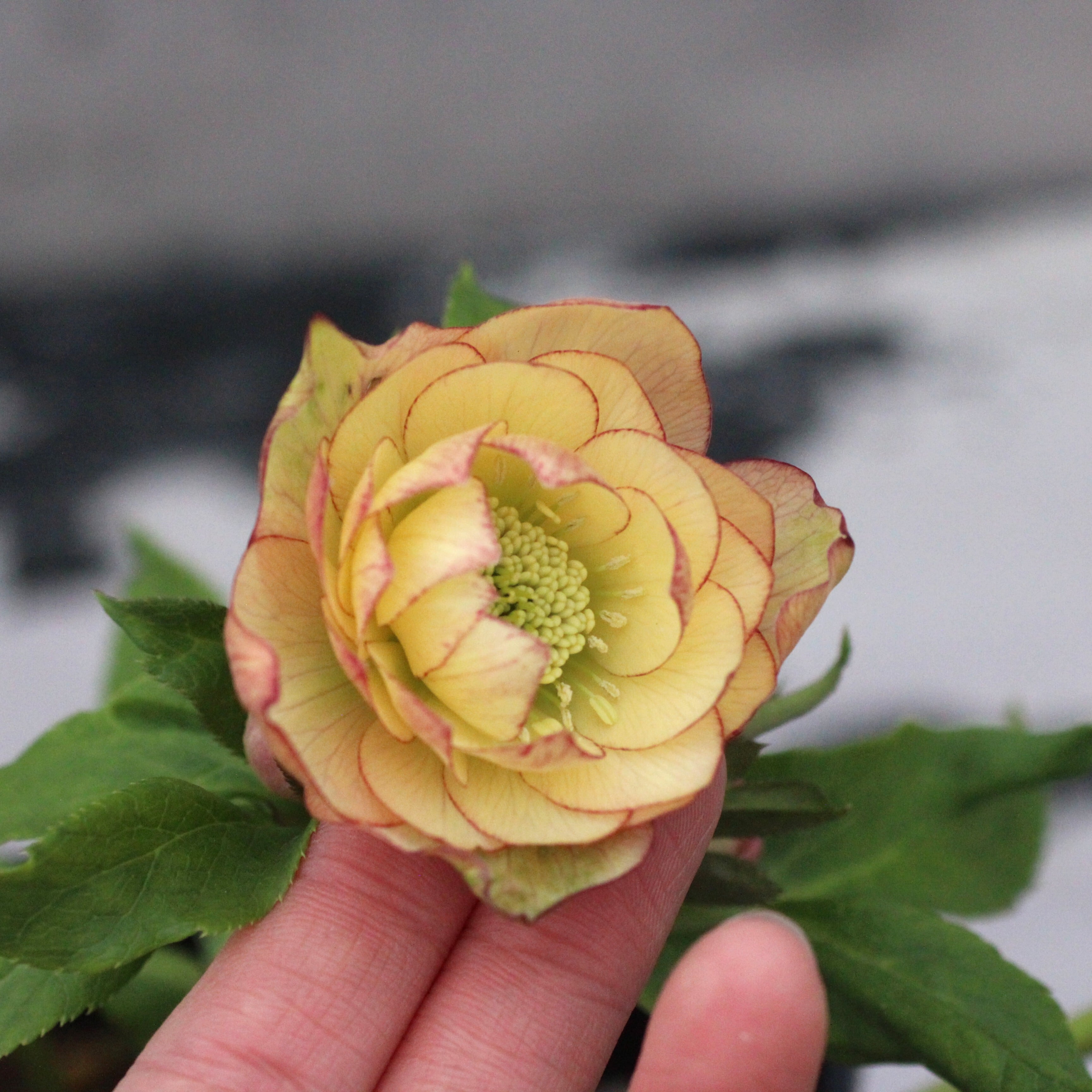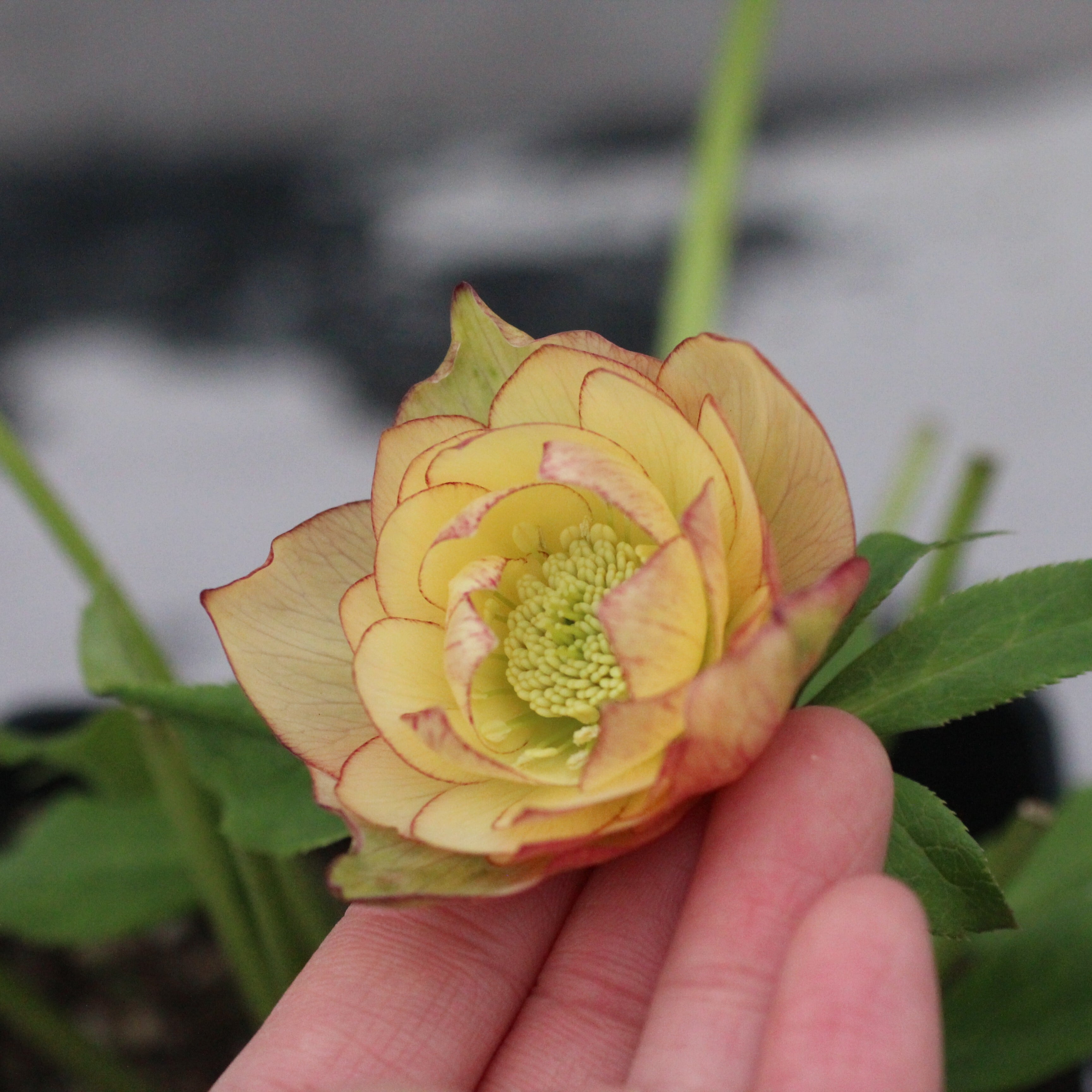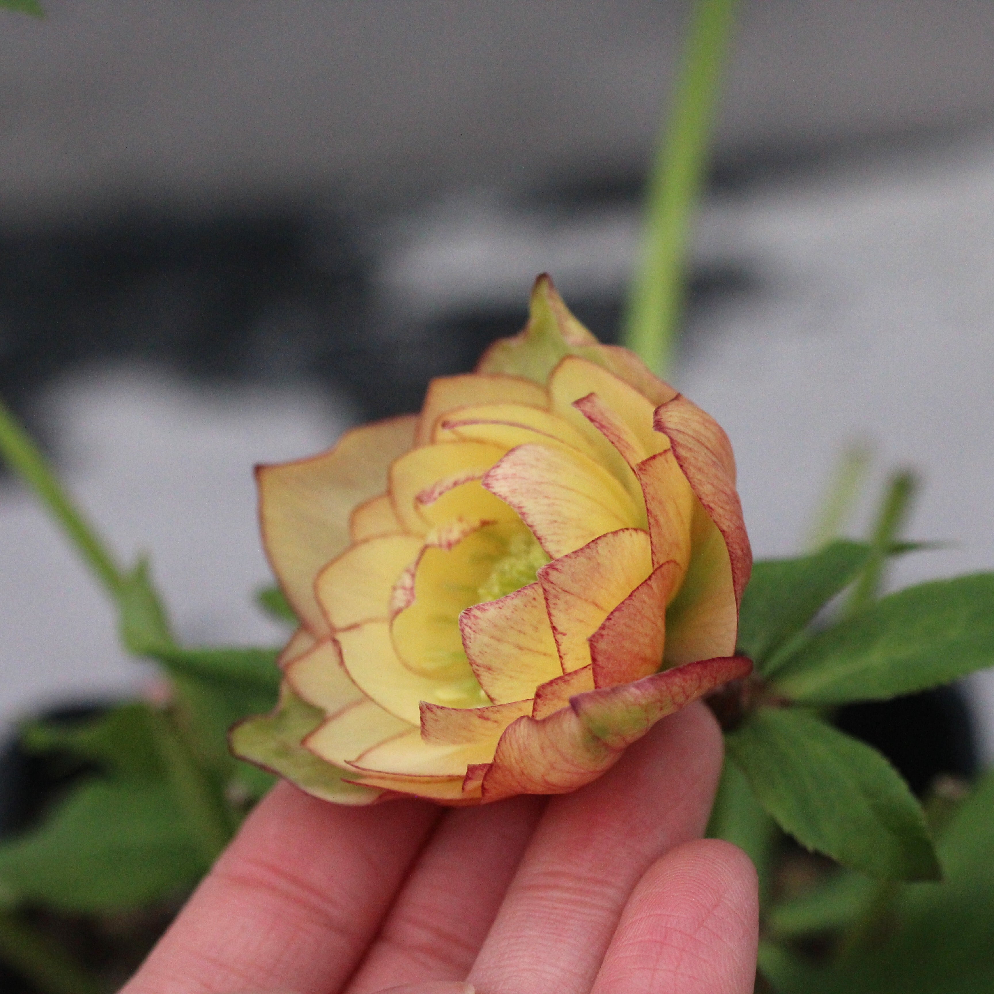イエローアプリコットのダブル。明るい黄色にはっきりとした赤い覆輪が映え美しい。つぼみ付き。(12/25撮影)
