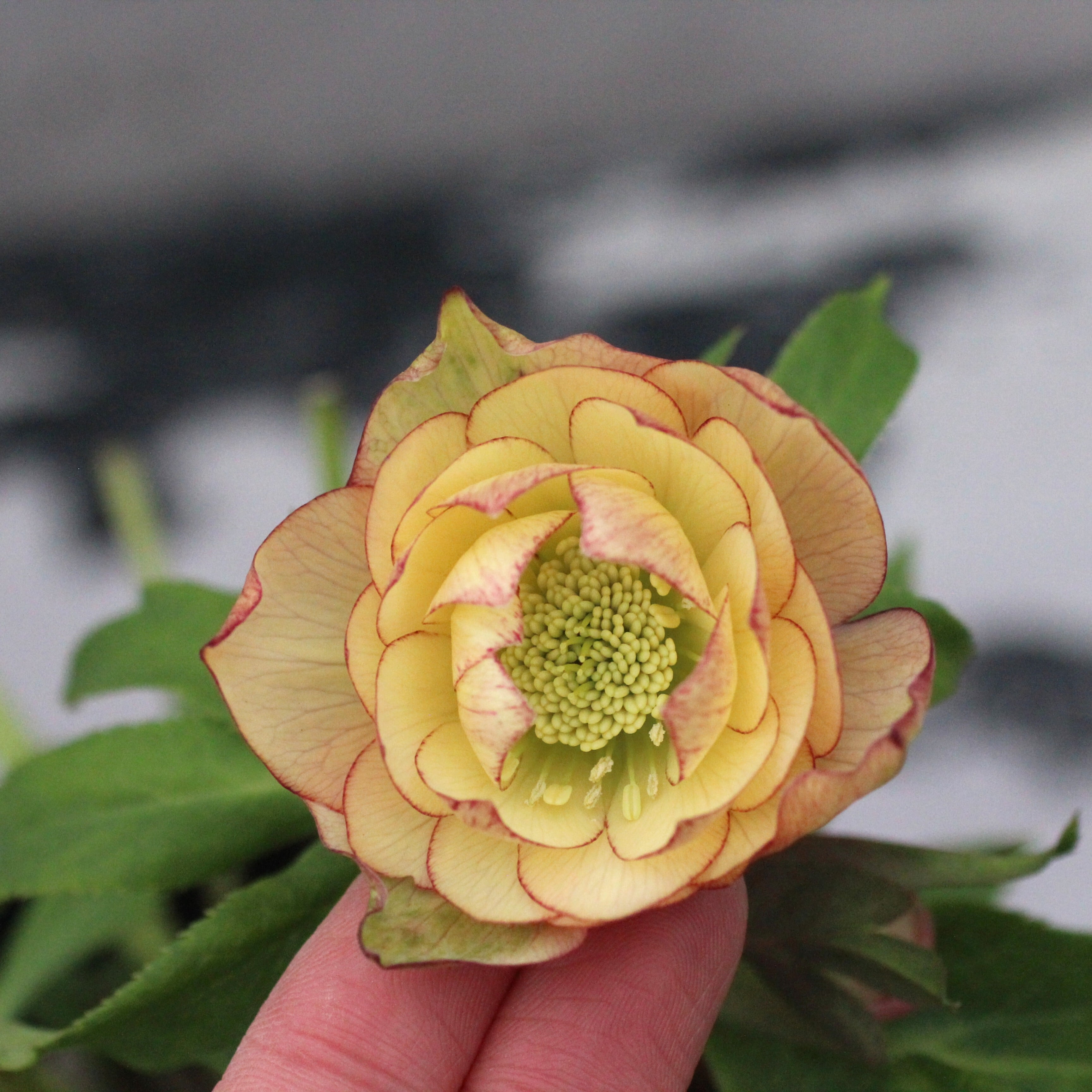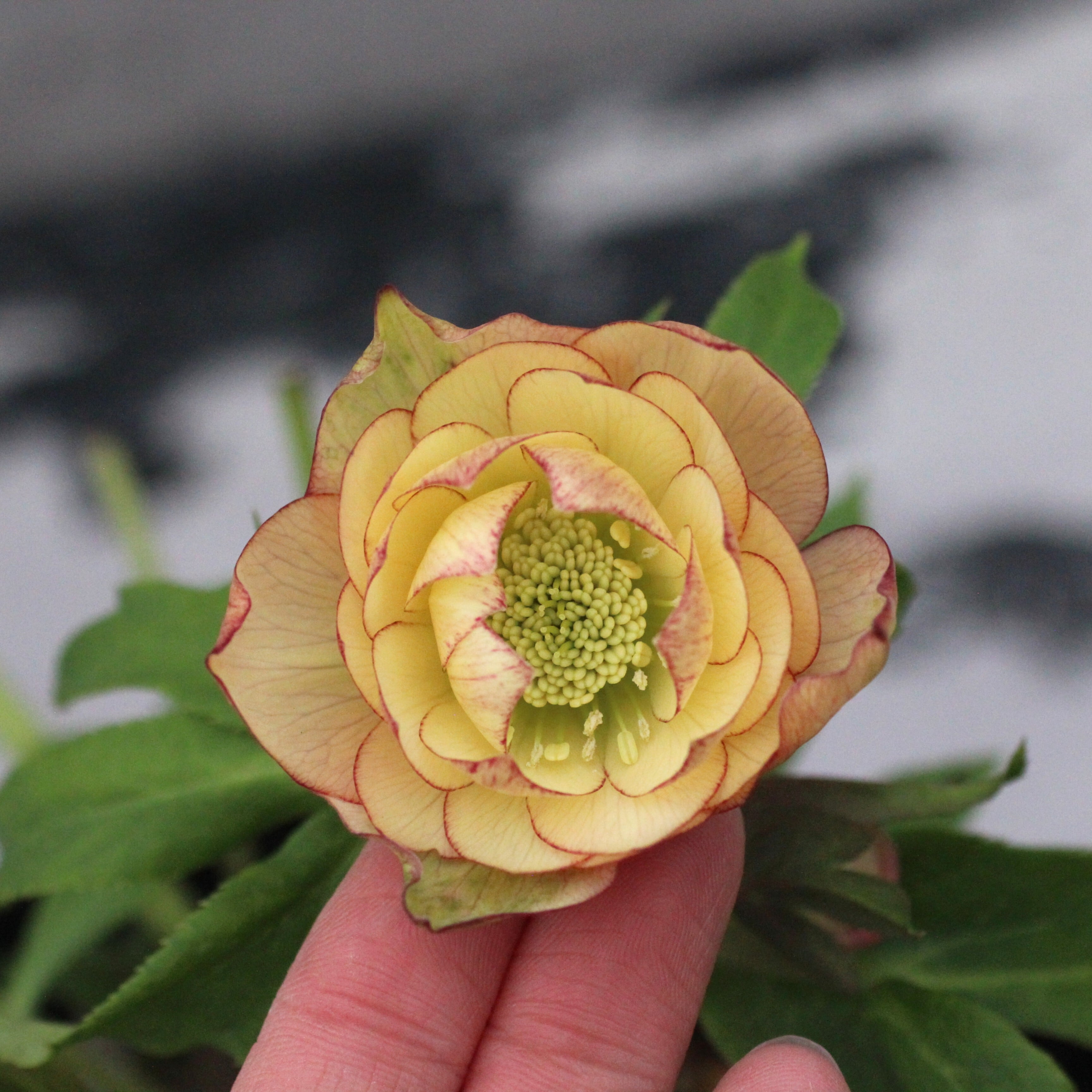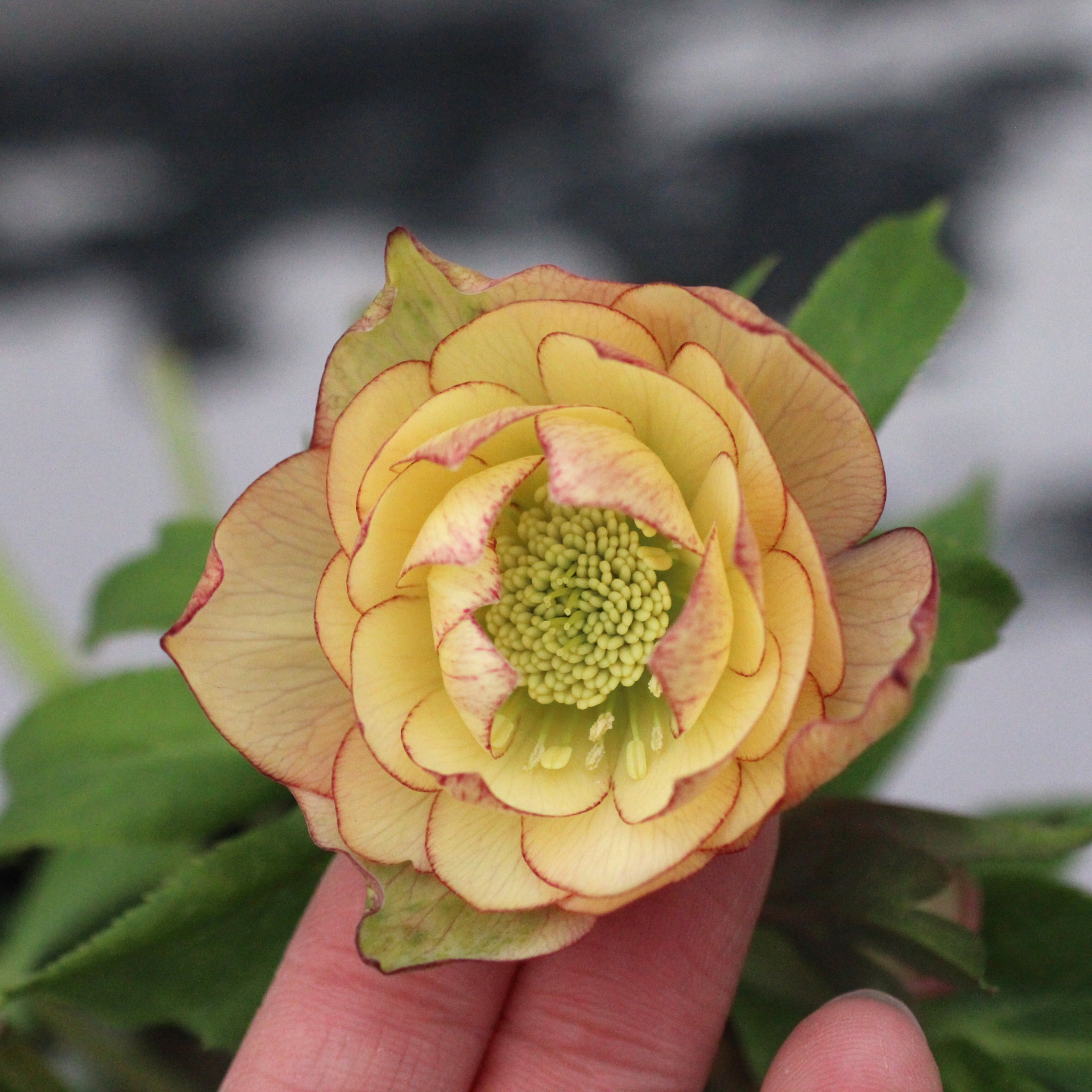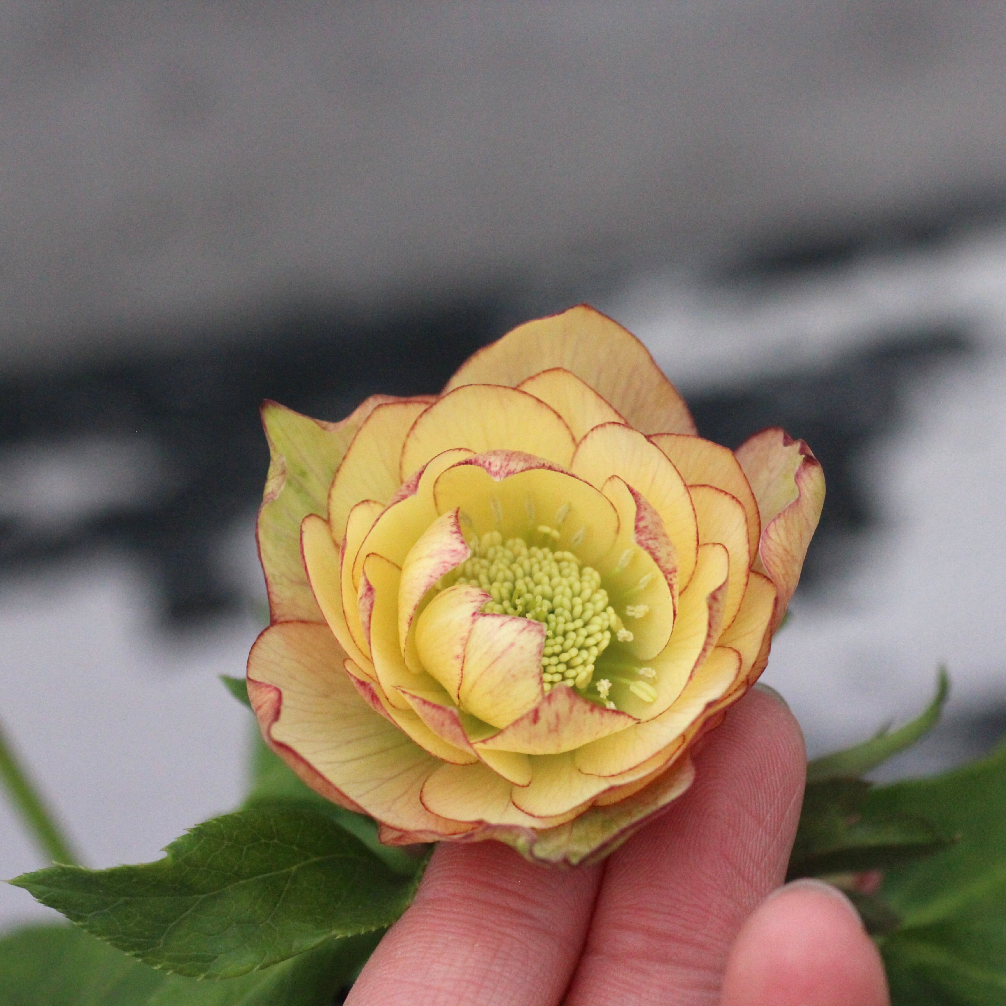 イエローアプリコットのダブル。明るい黄色にはっきりとした赤い覆輪が映え美しい。つぼみ付き。(12/25撮影)