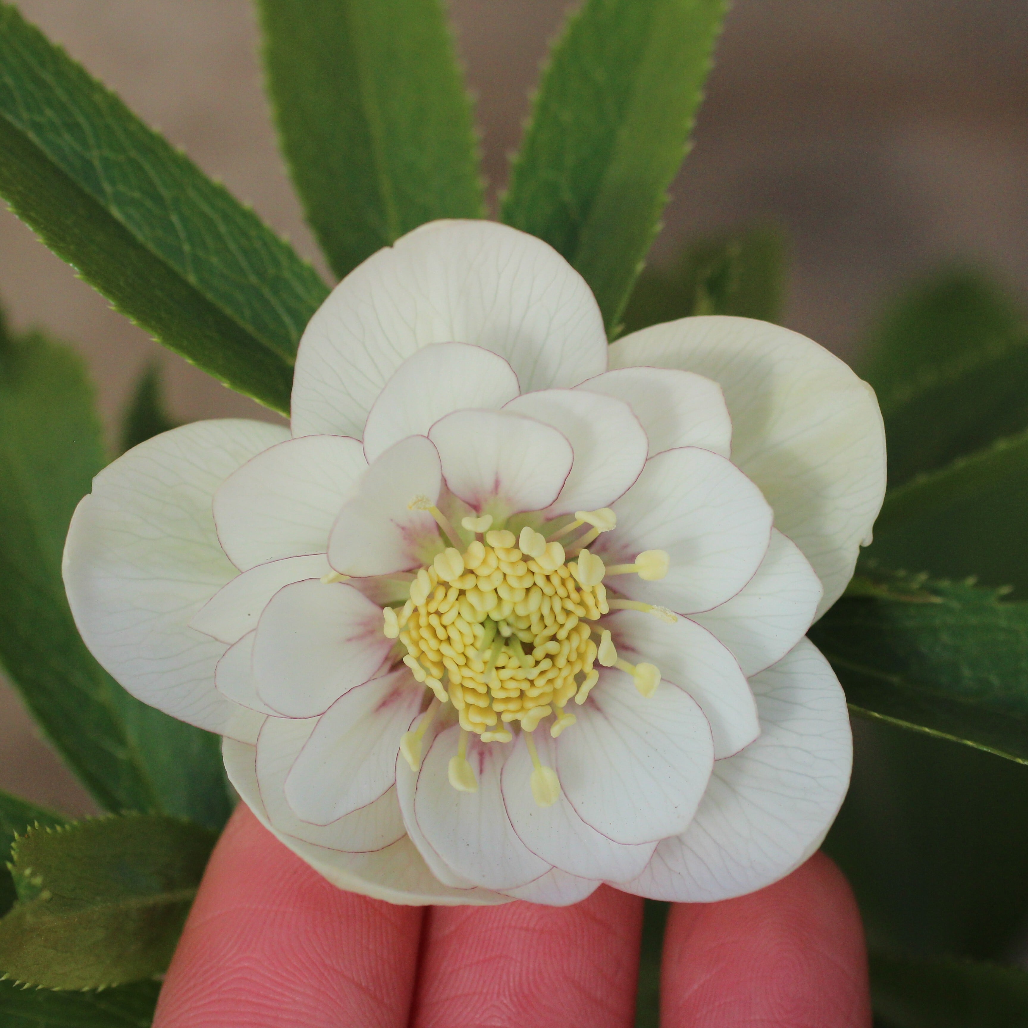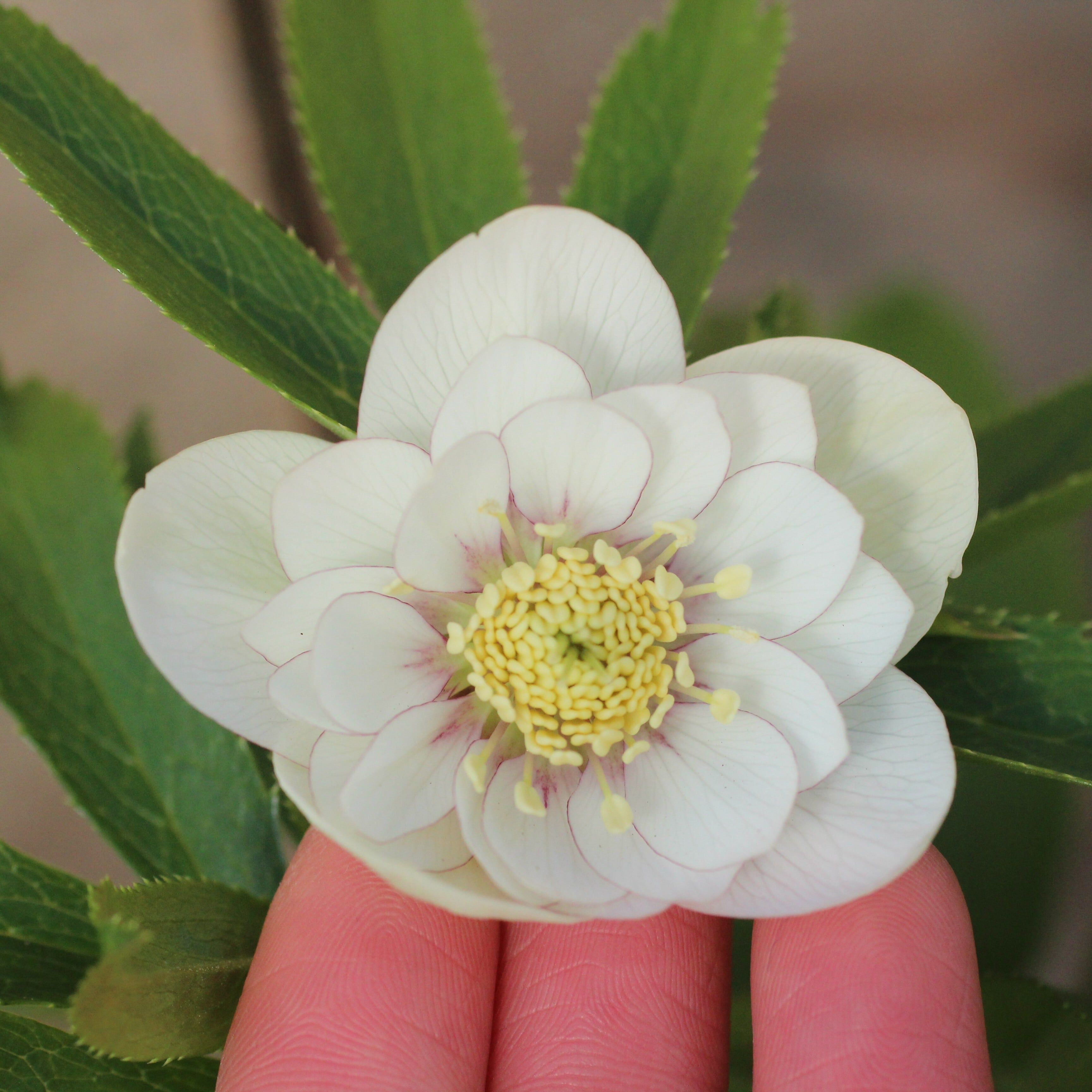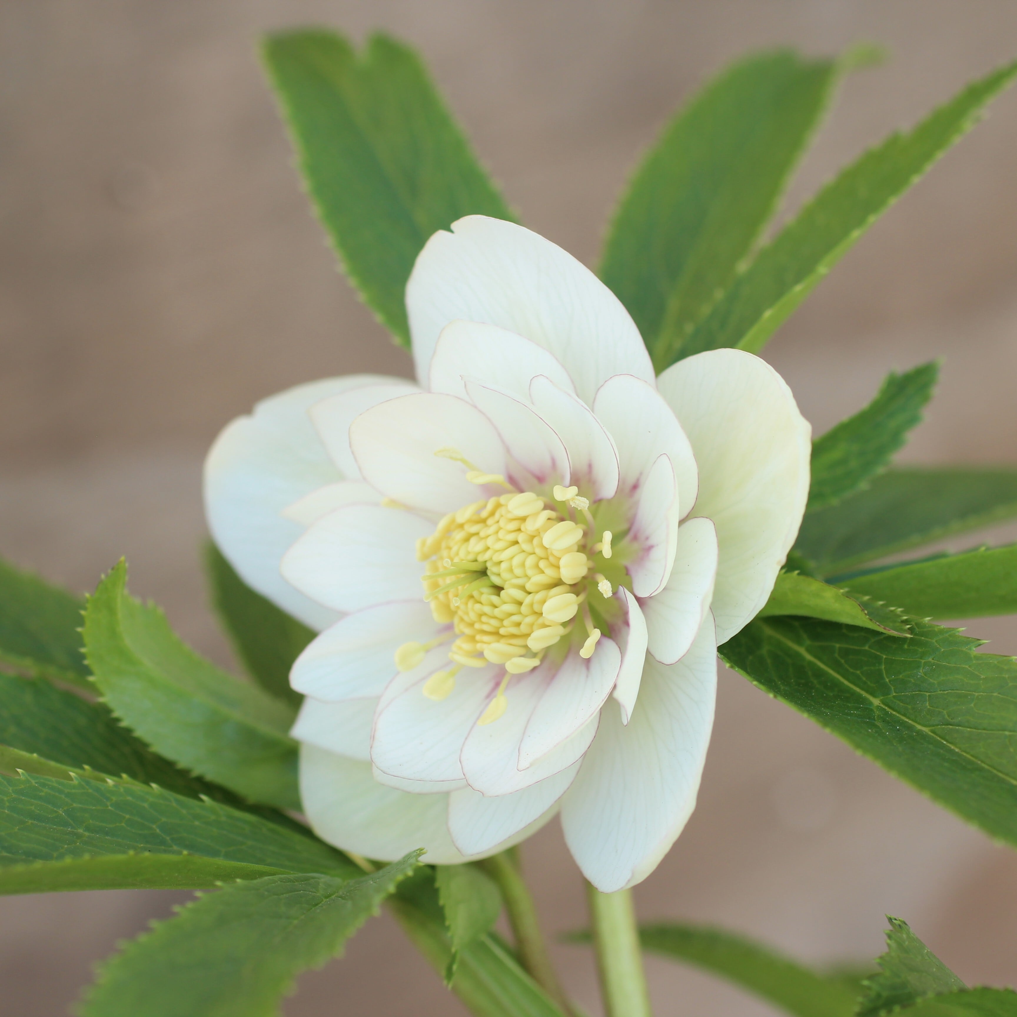 ウィンターシンフォニーの和風シリーズ「静(しずか)」のダブル。ホワイトの花弁に、ダークパープルの控えめなフラッシュと、極細い覆輪が入る。つぼみ付き。(1/9撮影)
