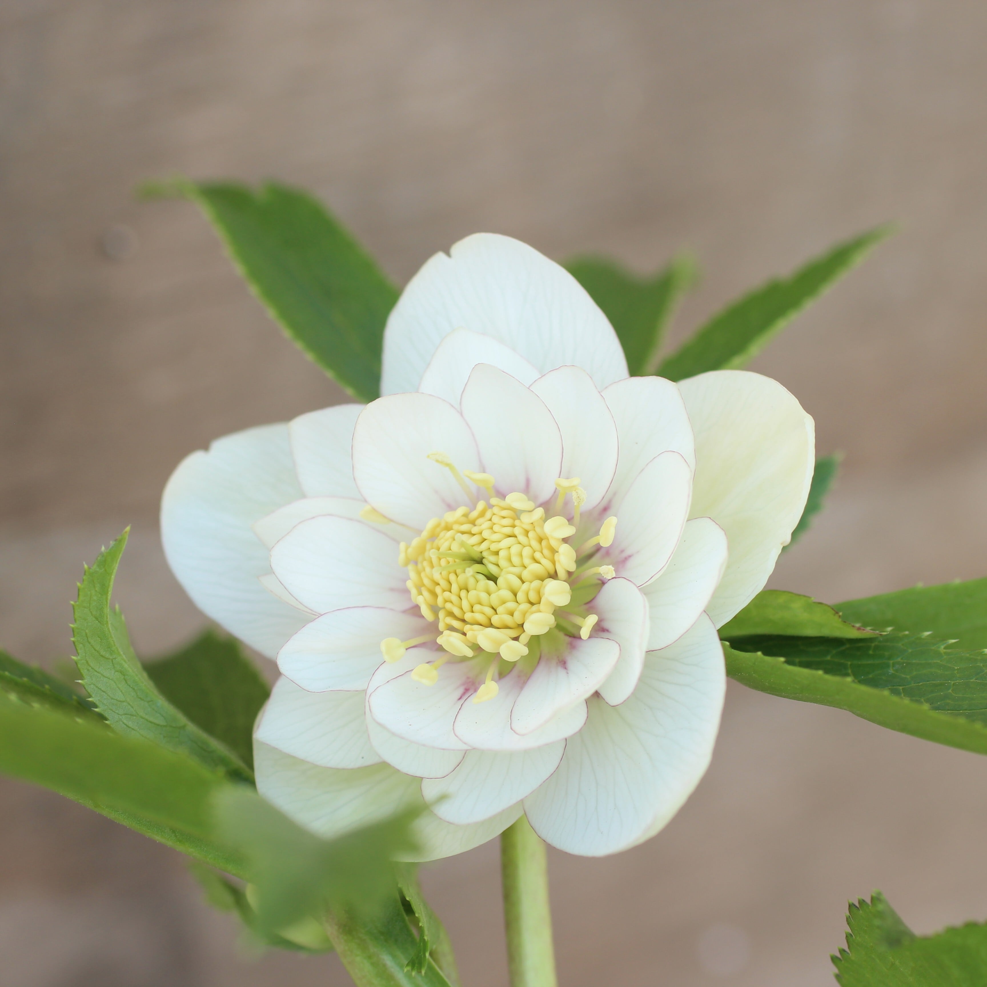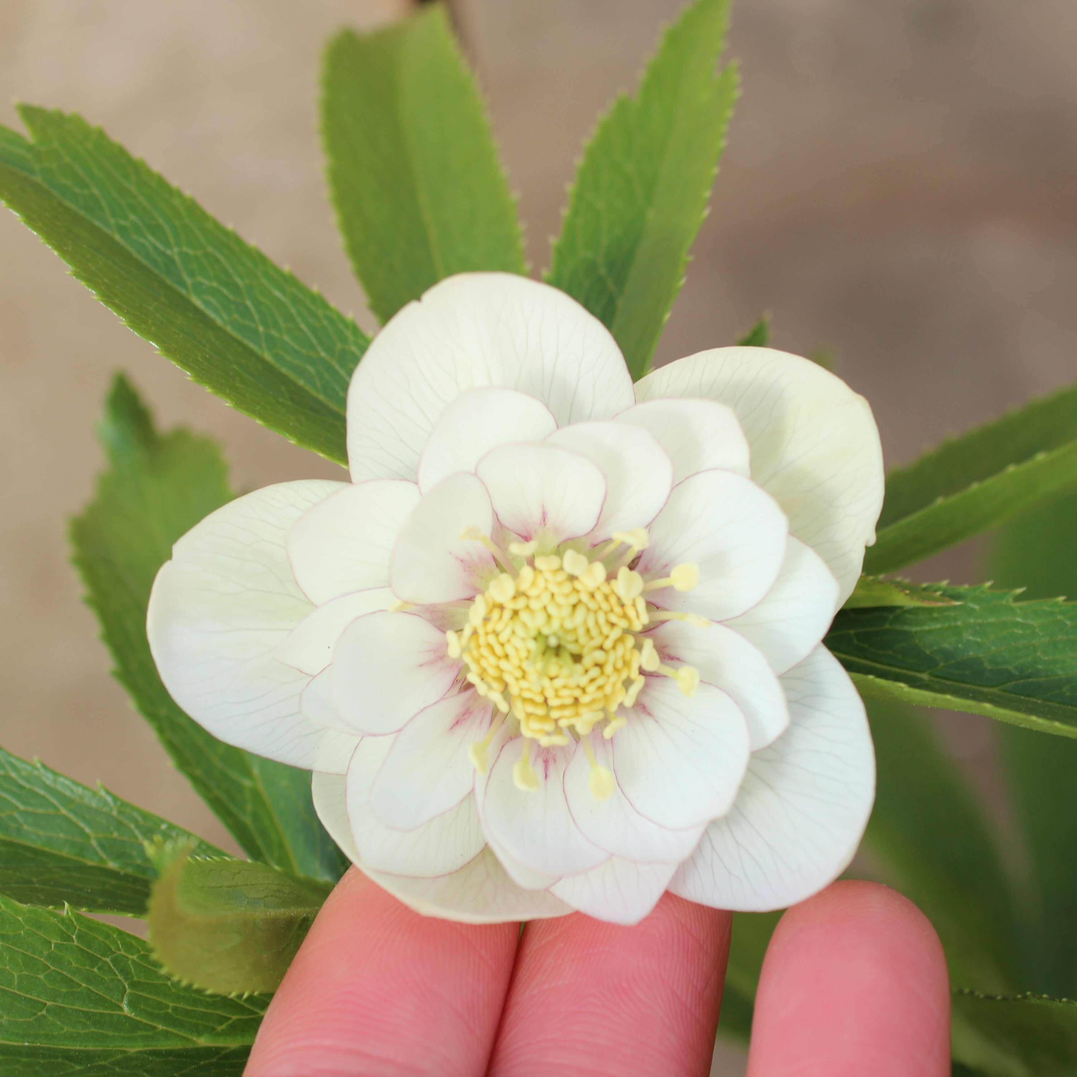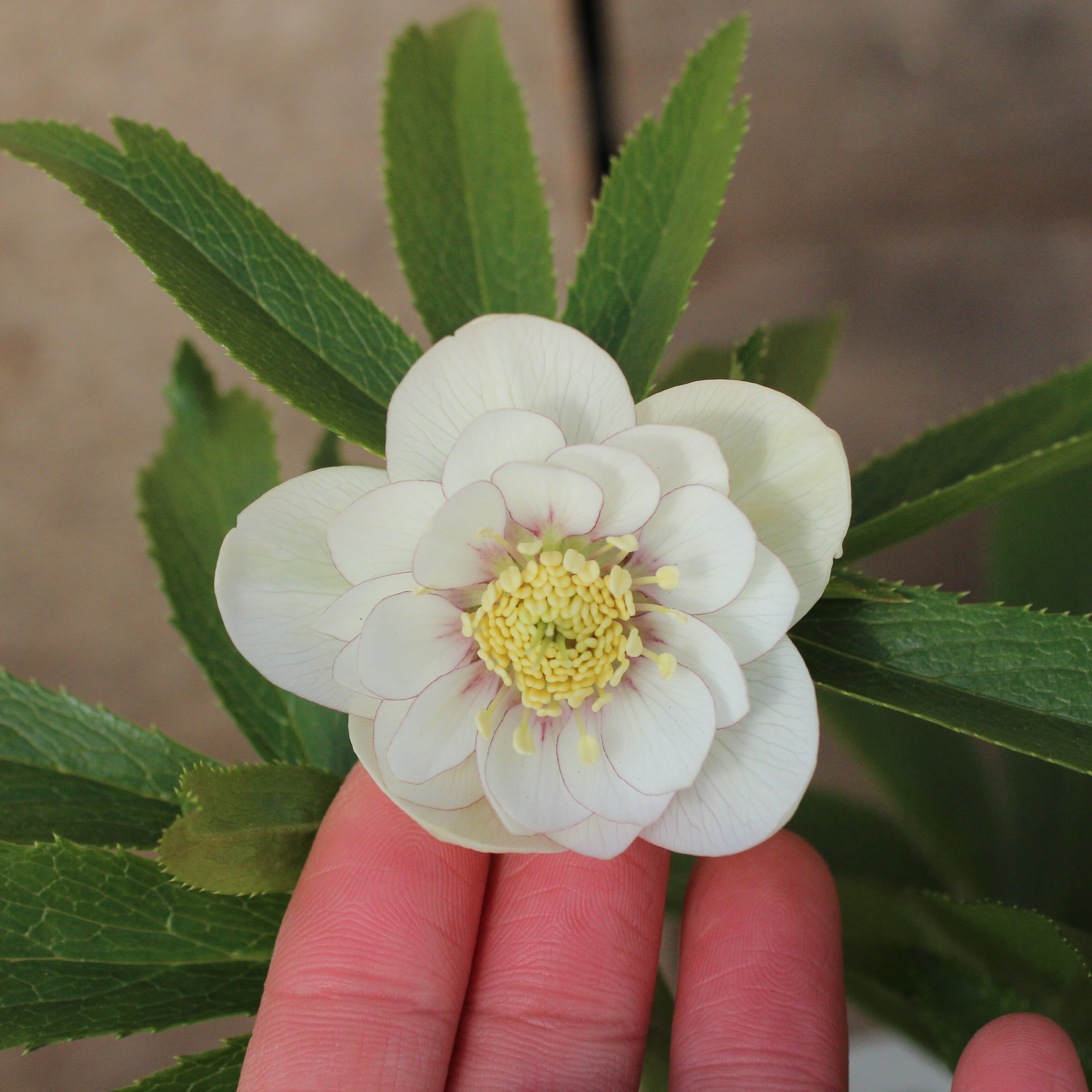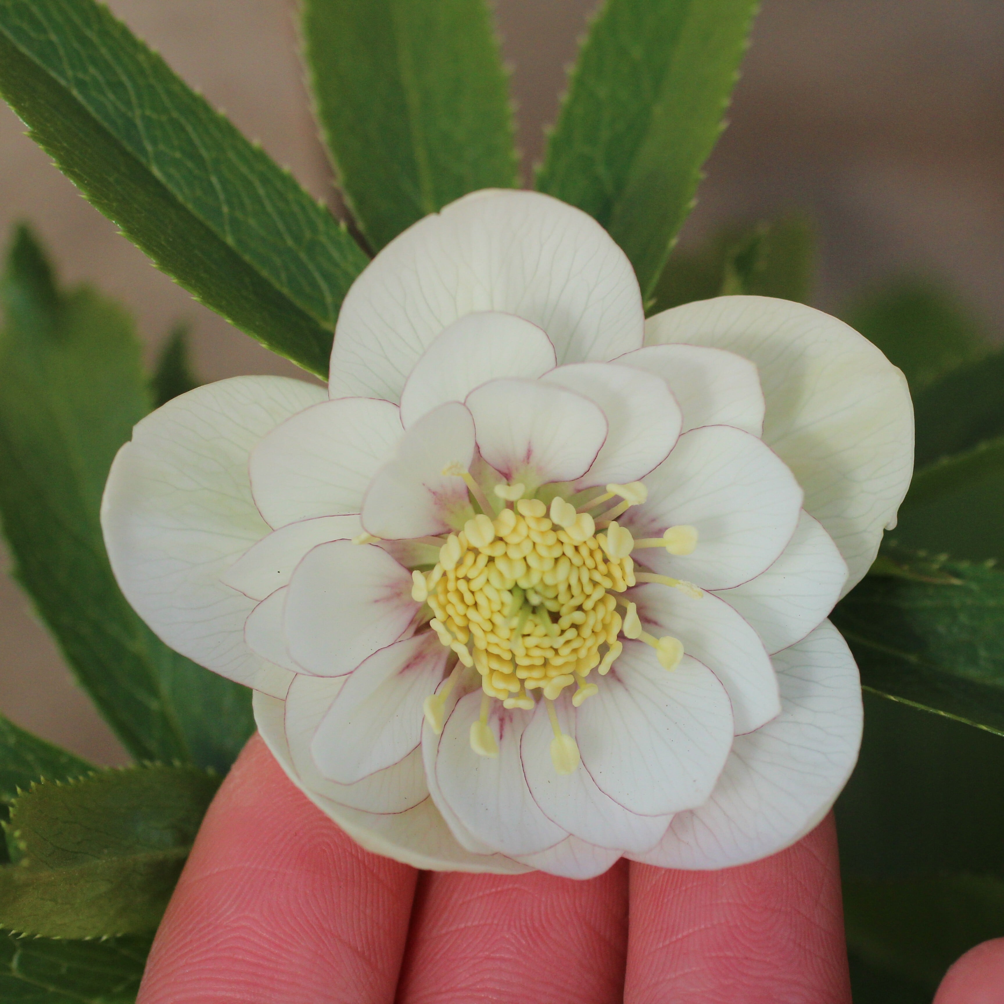 ウィンターシンフォニーの和風シリーズ「静(しずか)」のダブル。ホワイトの花弁に、ダークパープルの控えめなフラッシュと、極細い覆輪が入る。つぼみ付き。(1/9撮影)