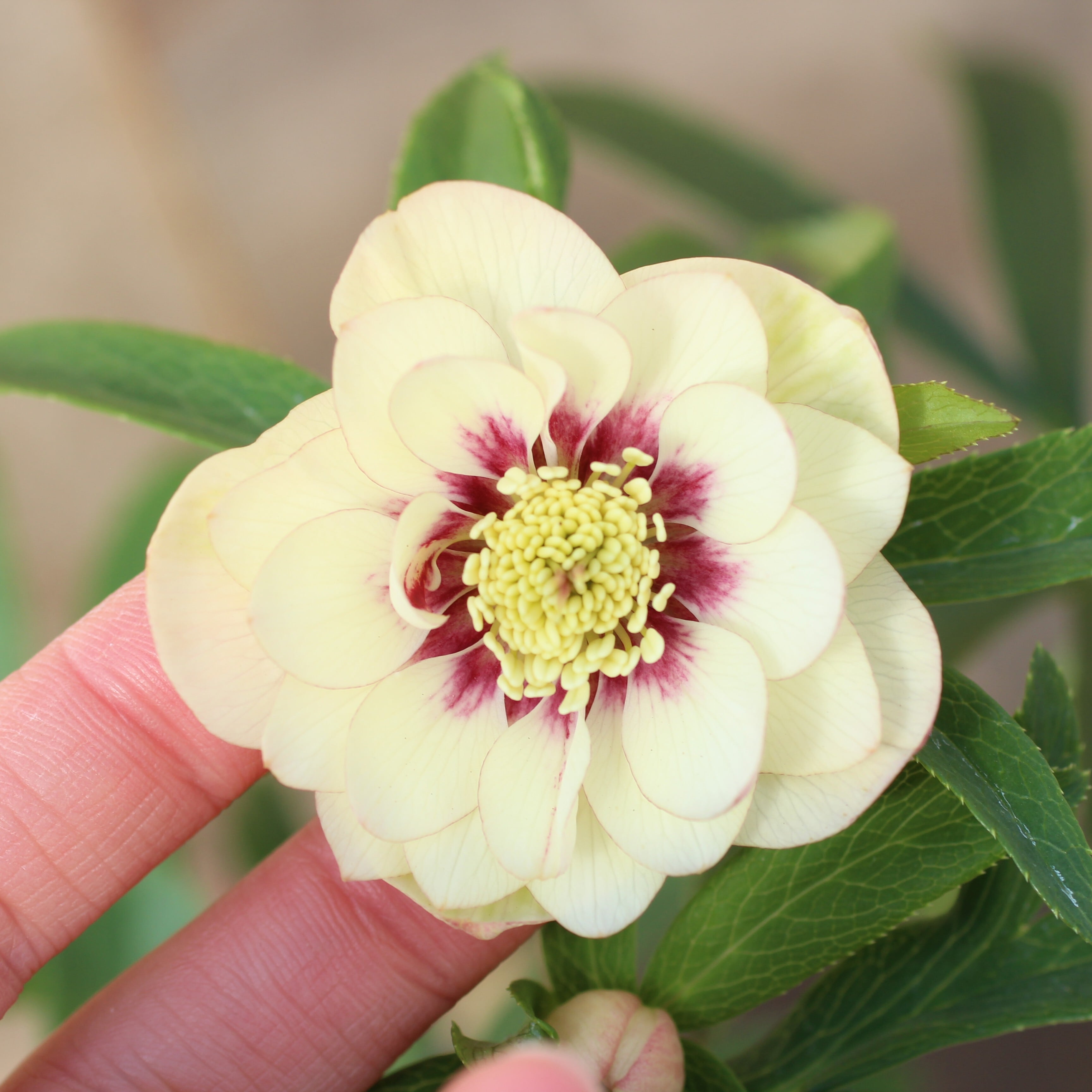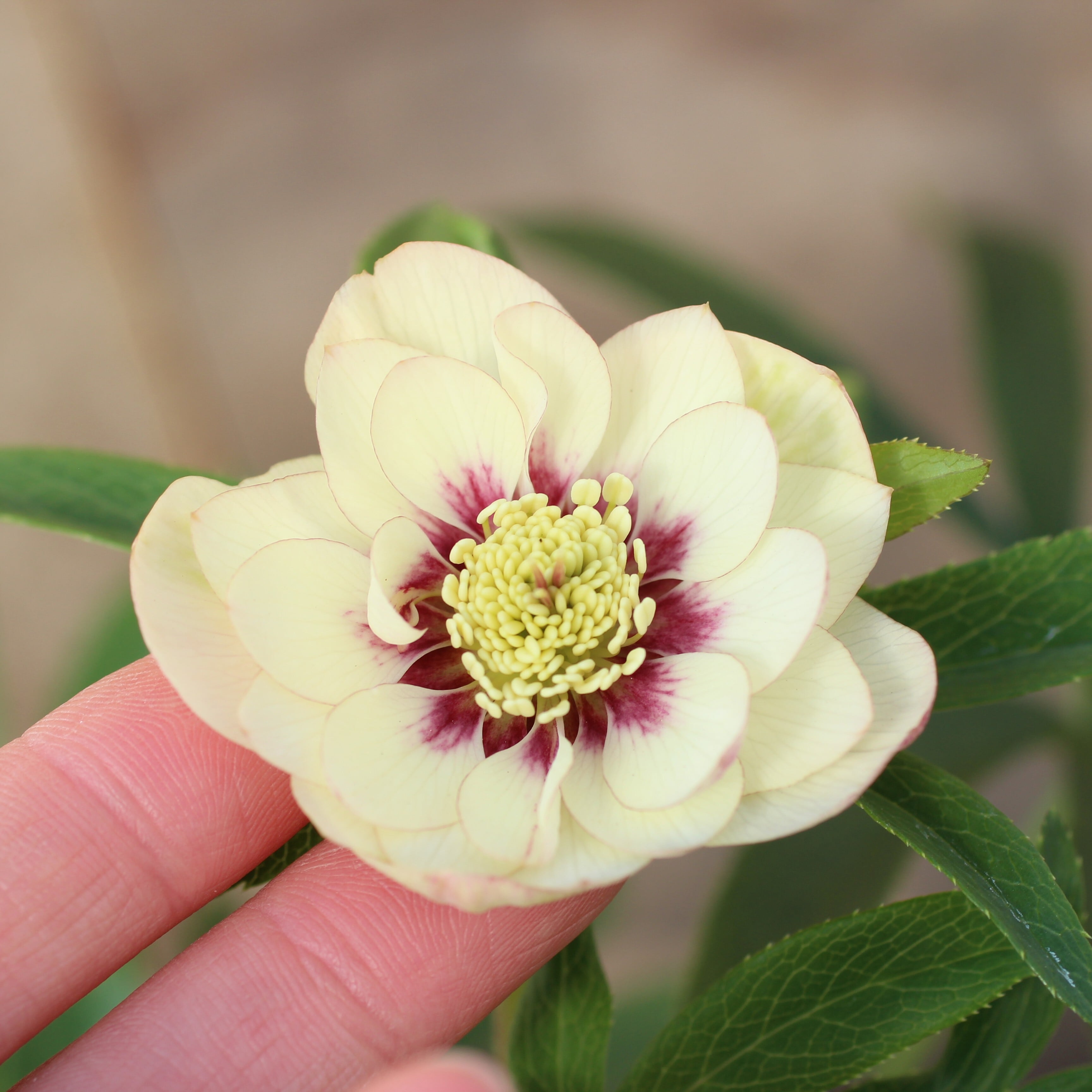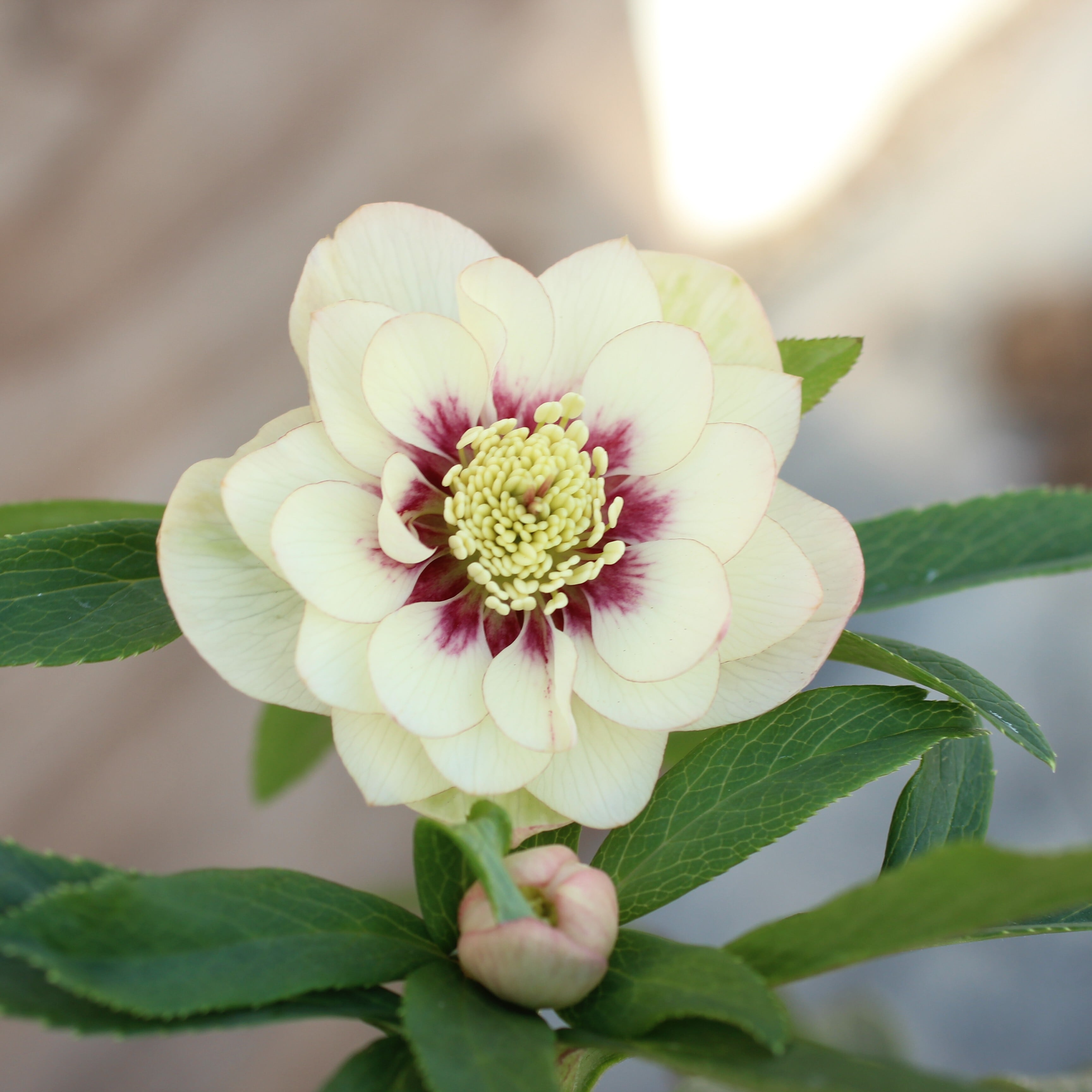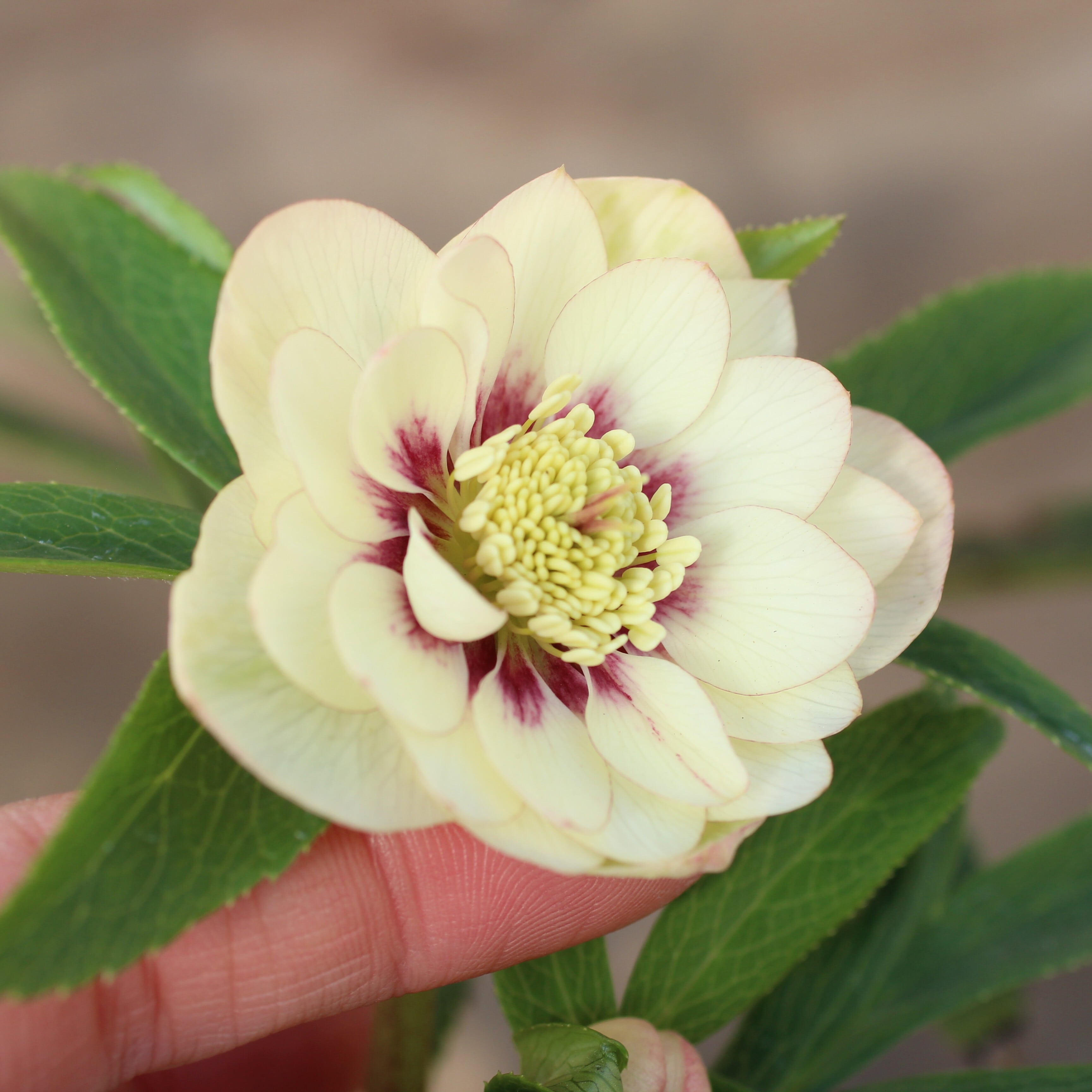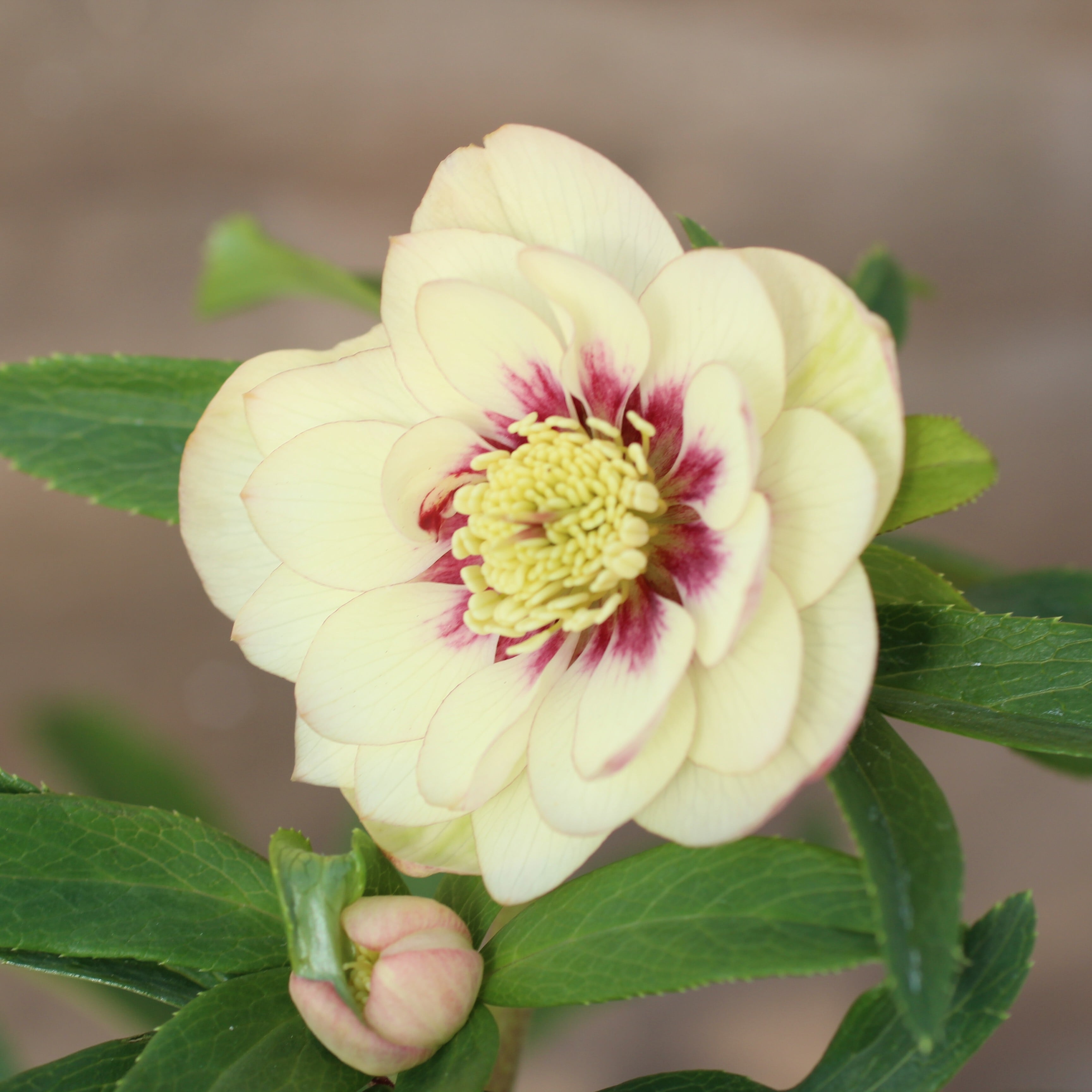 ウィンターシンフォニーの和風シリーズ「静(しずか)」のダブル。ややクリームがかるアイボリーの花弁に、シックなダークパープルのフラッシュと、極細い覆輪が入る。花弁裏とつぼみがほんのり桃色に染まり可愛らしい。つぼみ付き。(1/9撮影)