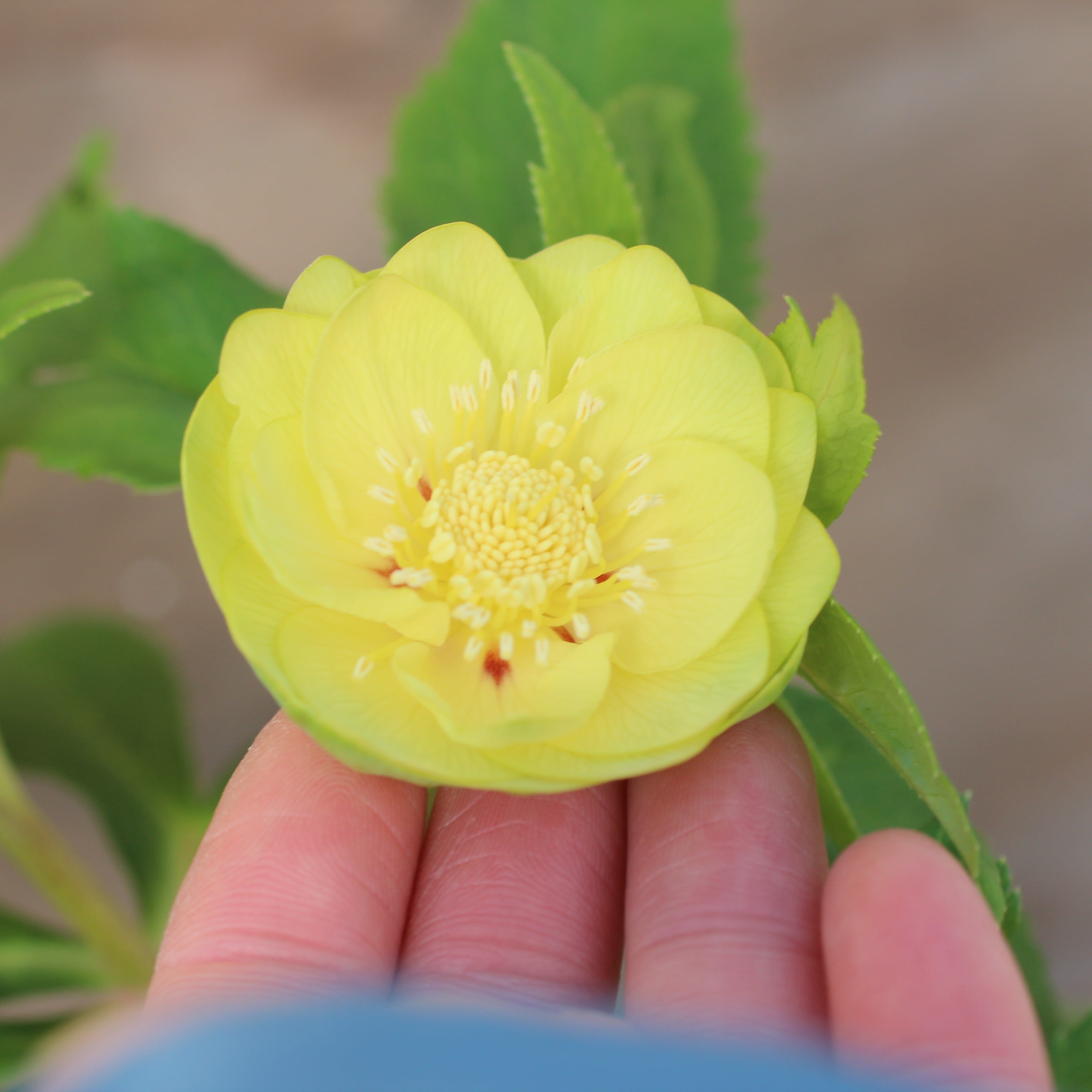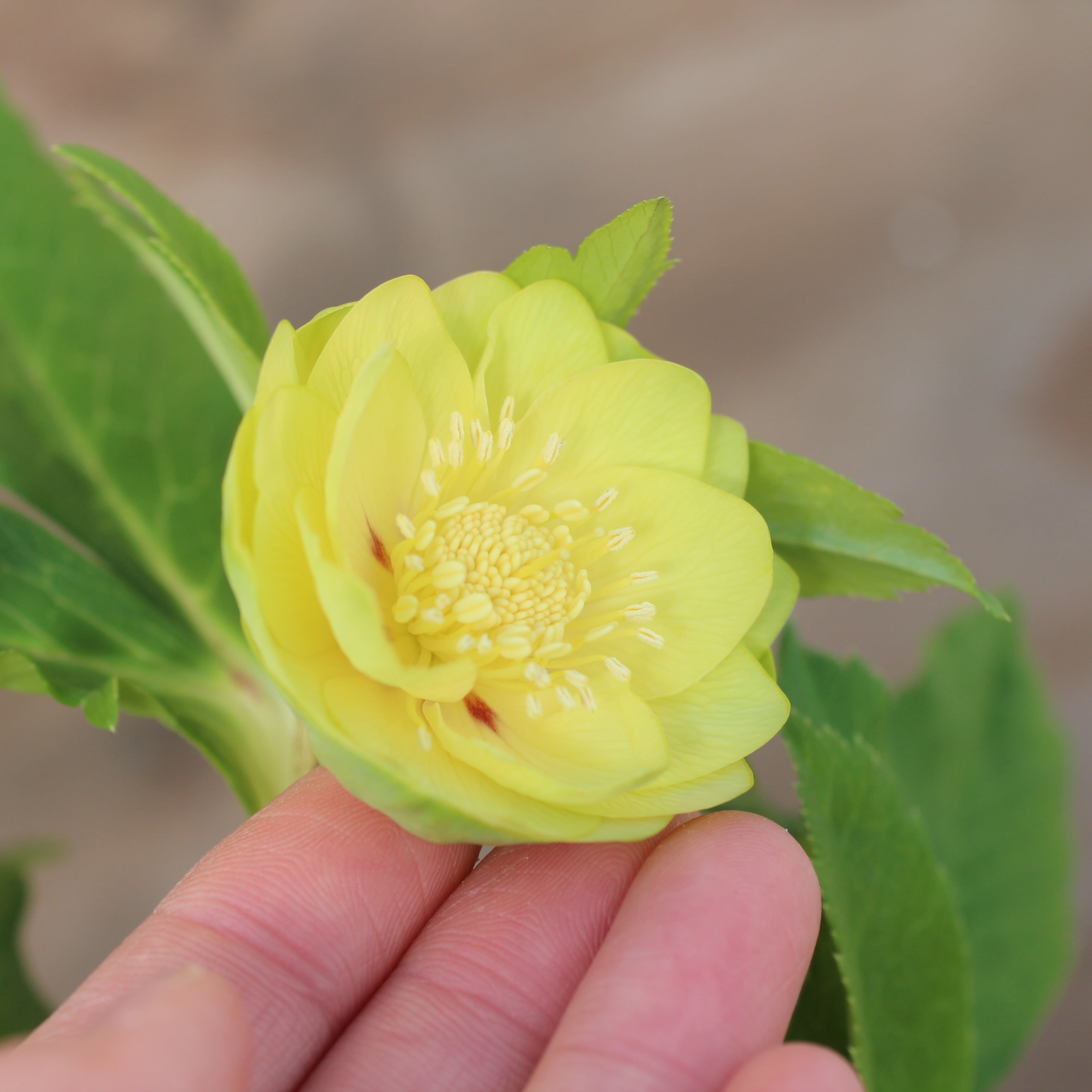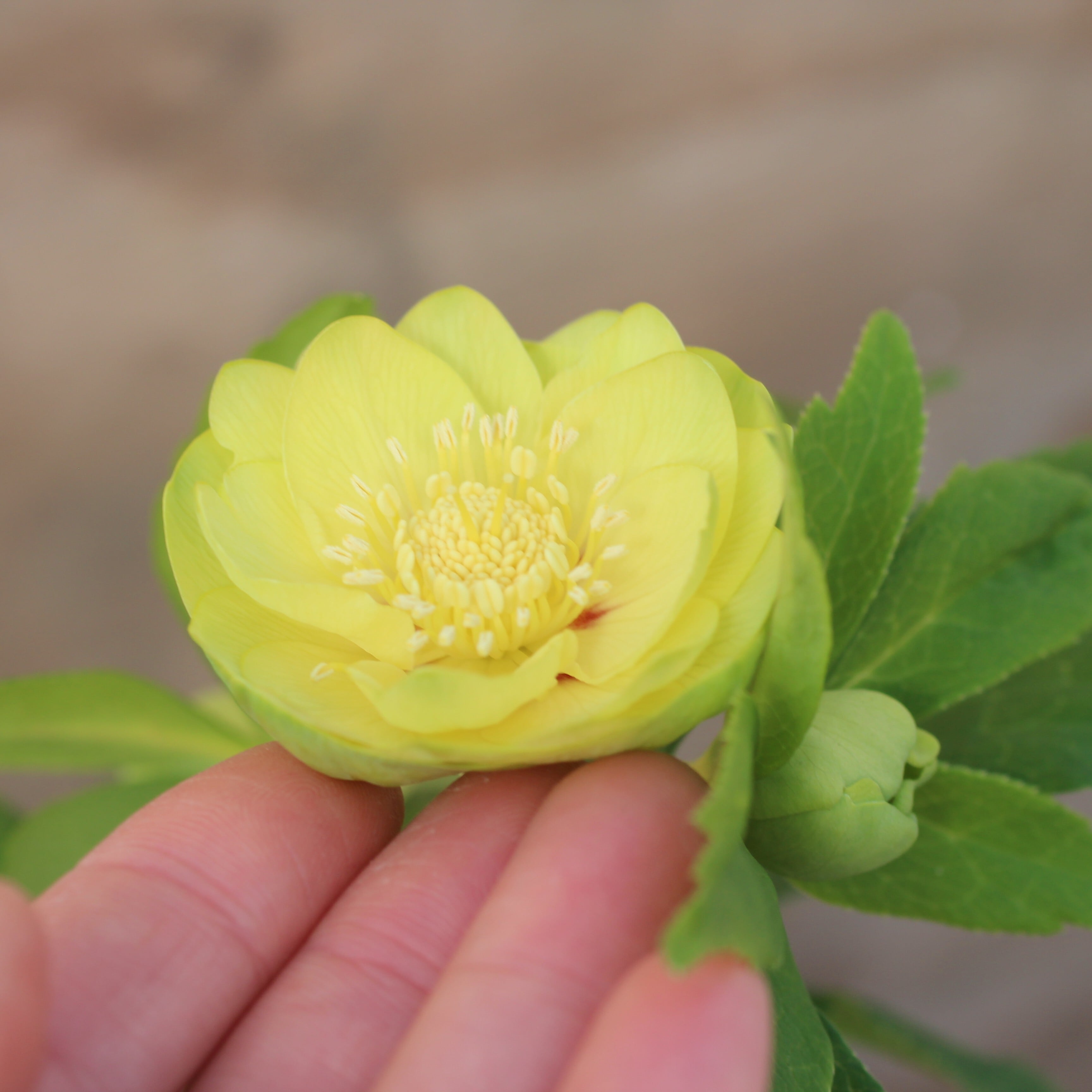 輝くようなイエローのしべが特徴的なオーレア系のグリーンダブル。小ぶりのイエローの花は、控えめな赤いフラッシュが映えて美しい。つぼみ付き。(1/9撮影)