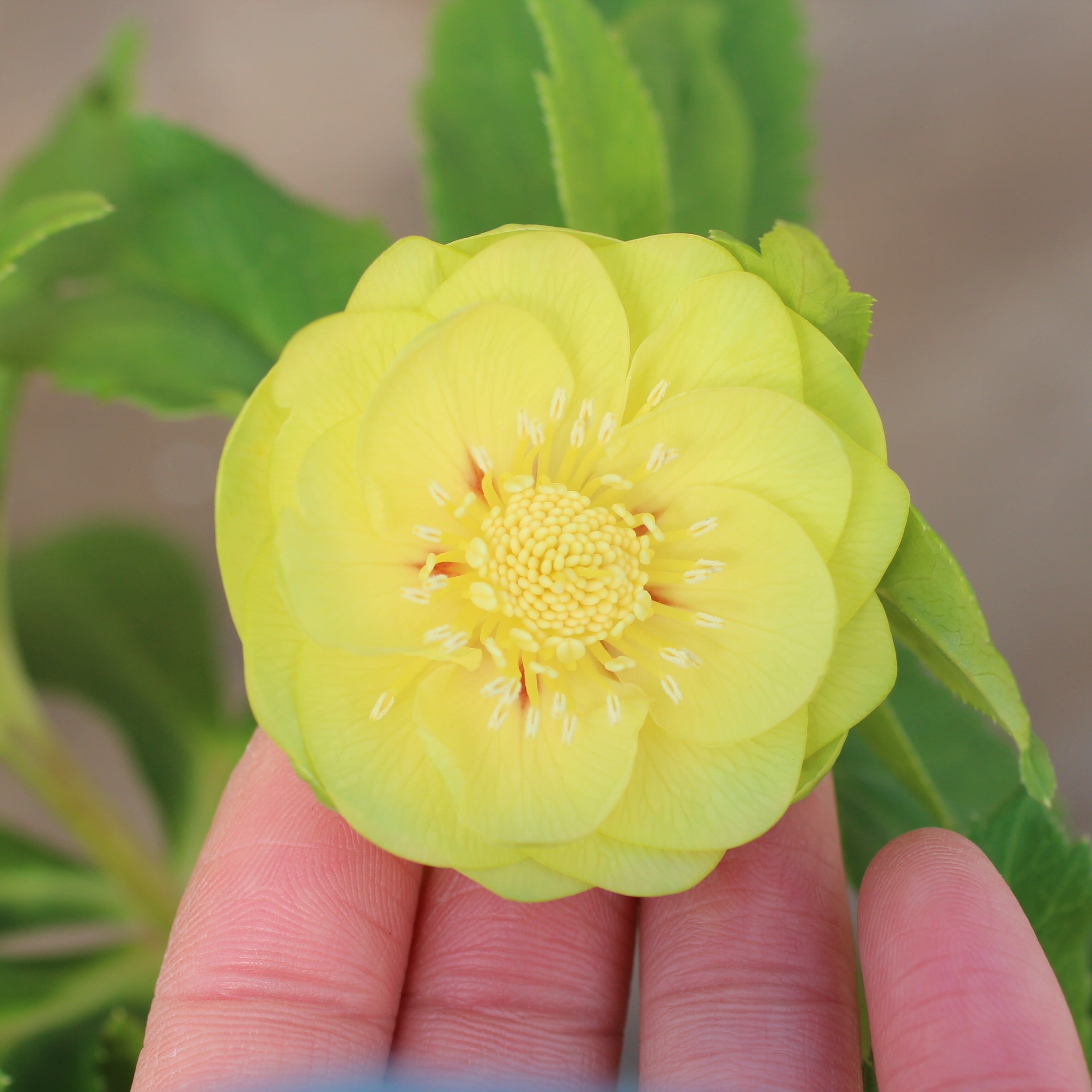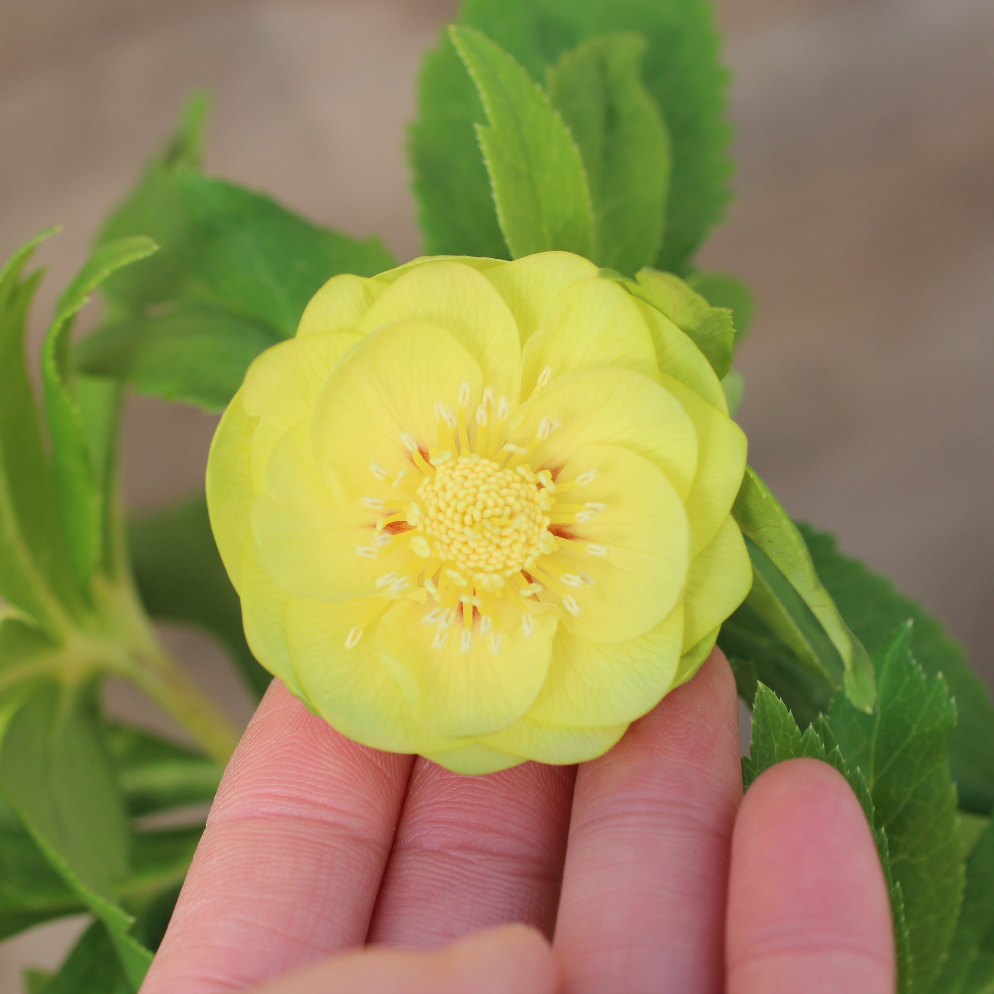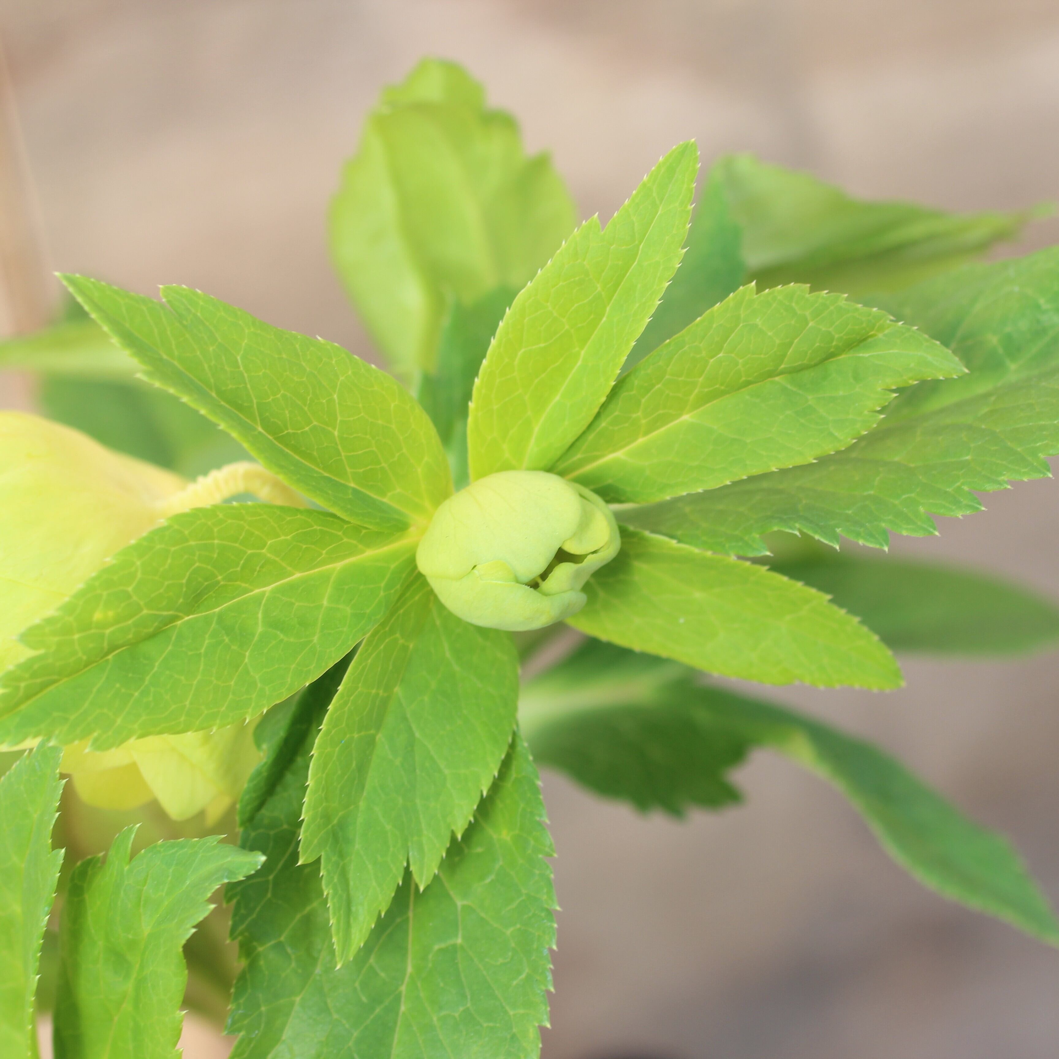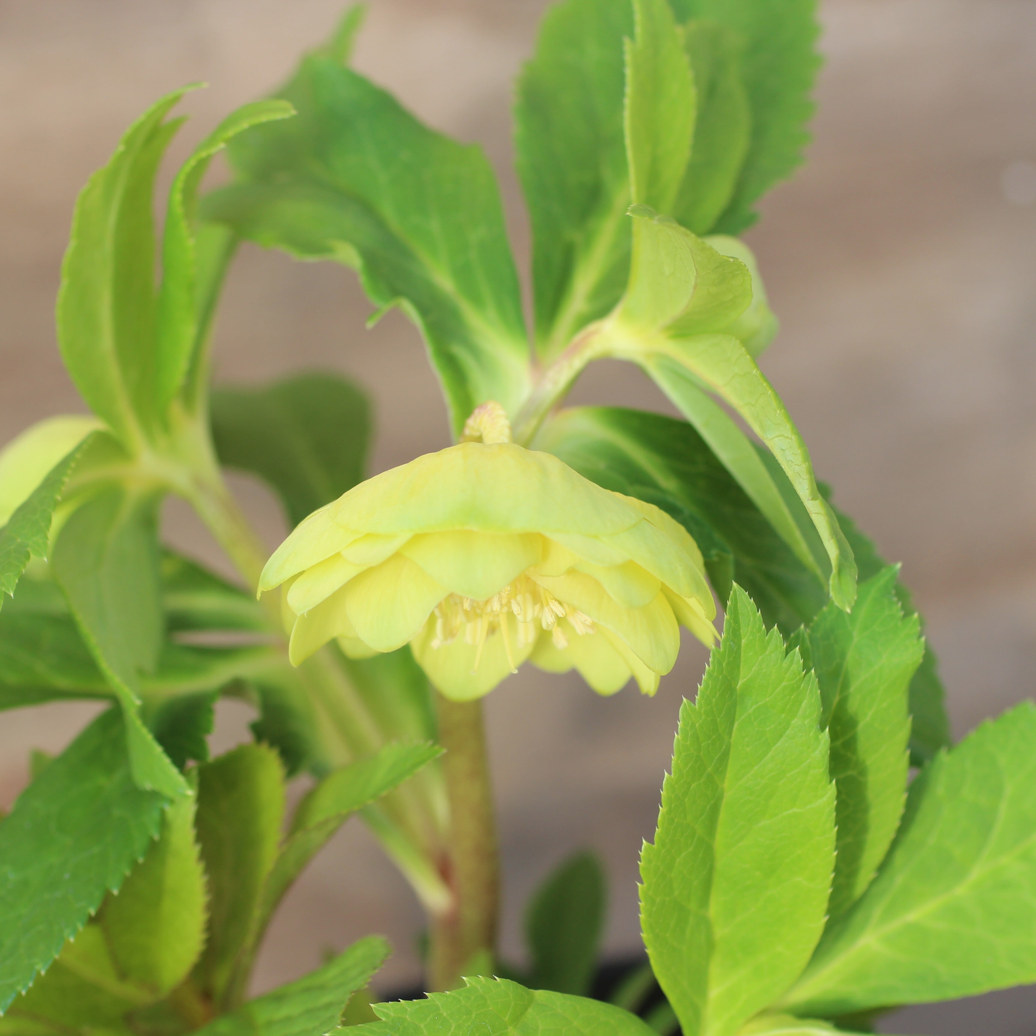 輝くようなイエローのしべが特徴的なオーレア系のグリーンダブル。小ぶりのイエローの花は、控えめな赤いフラッシュが映えて美しい。つぼみ付き。(1/9撮影)