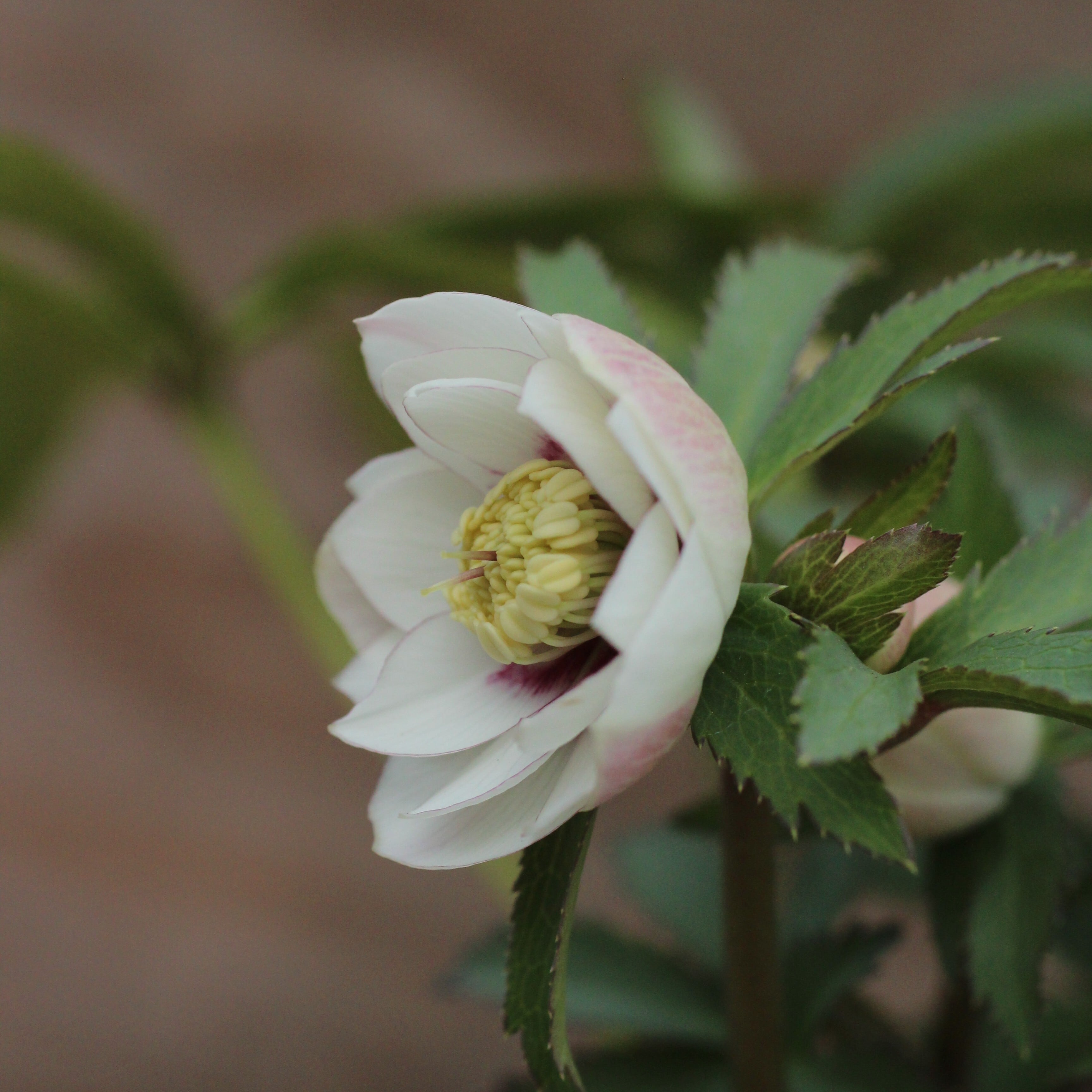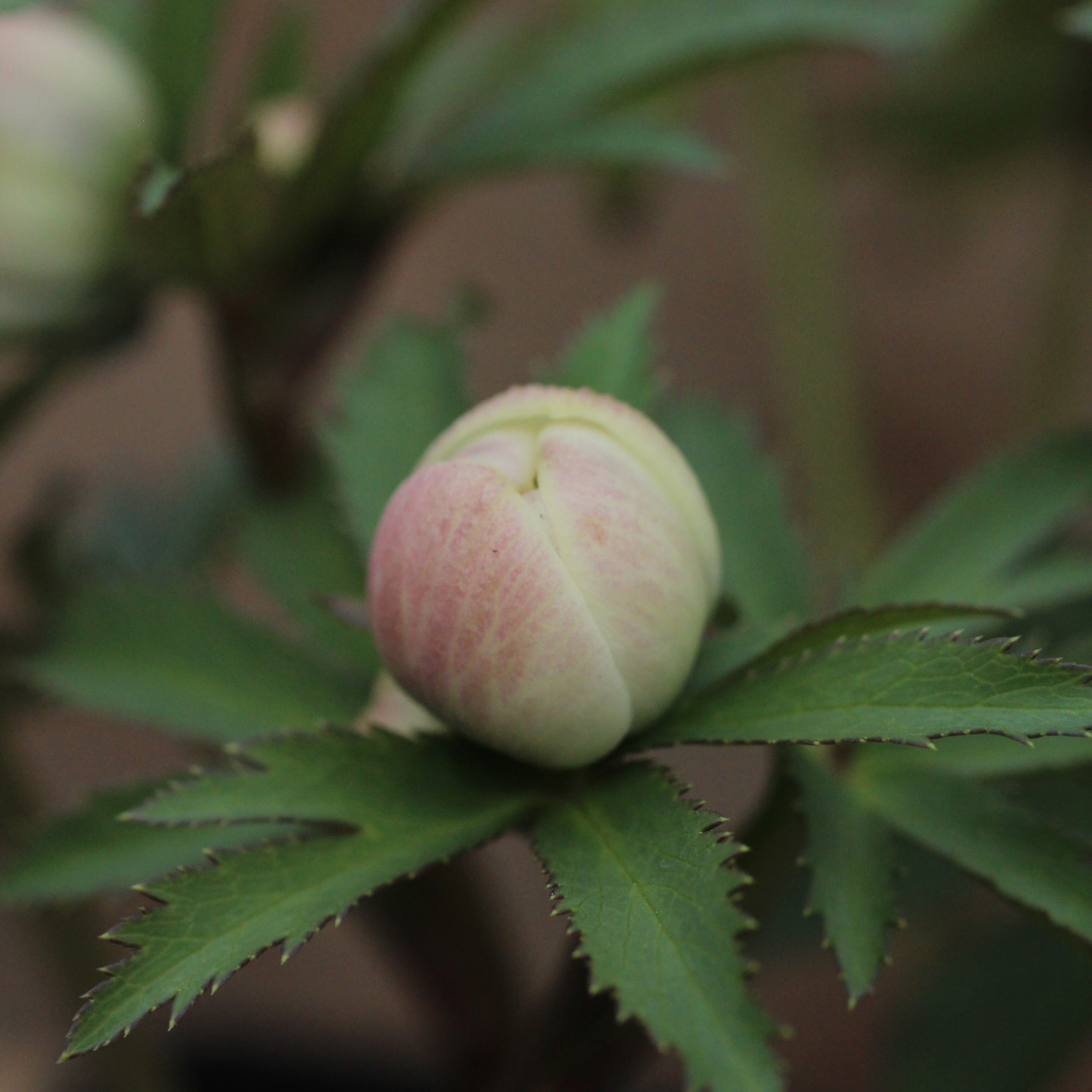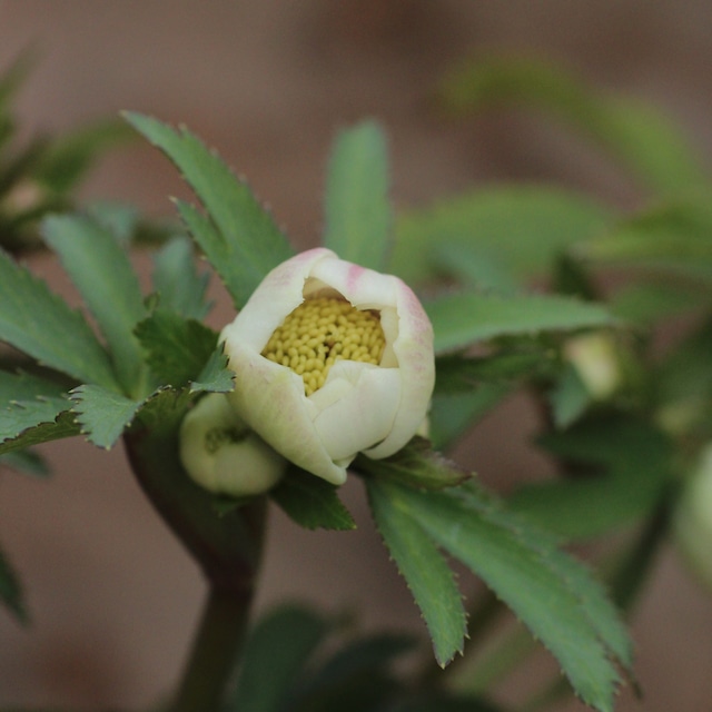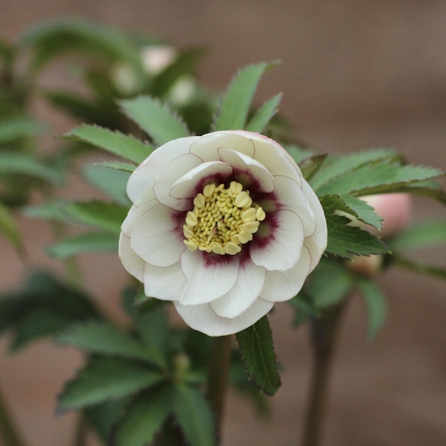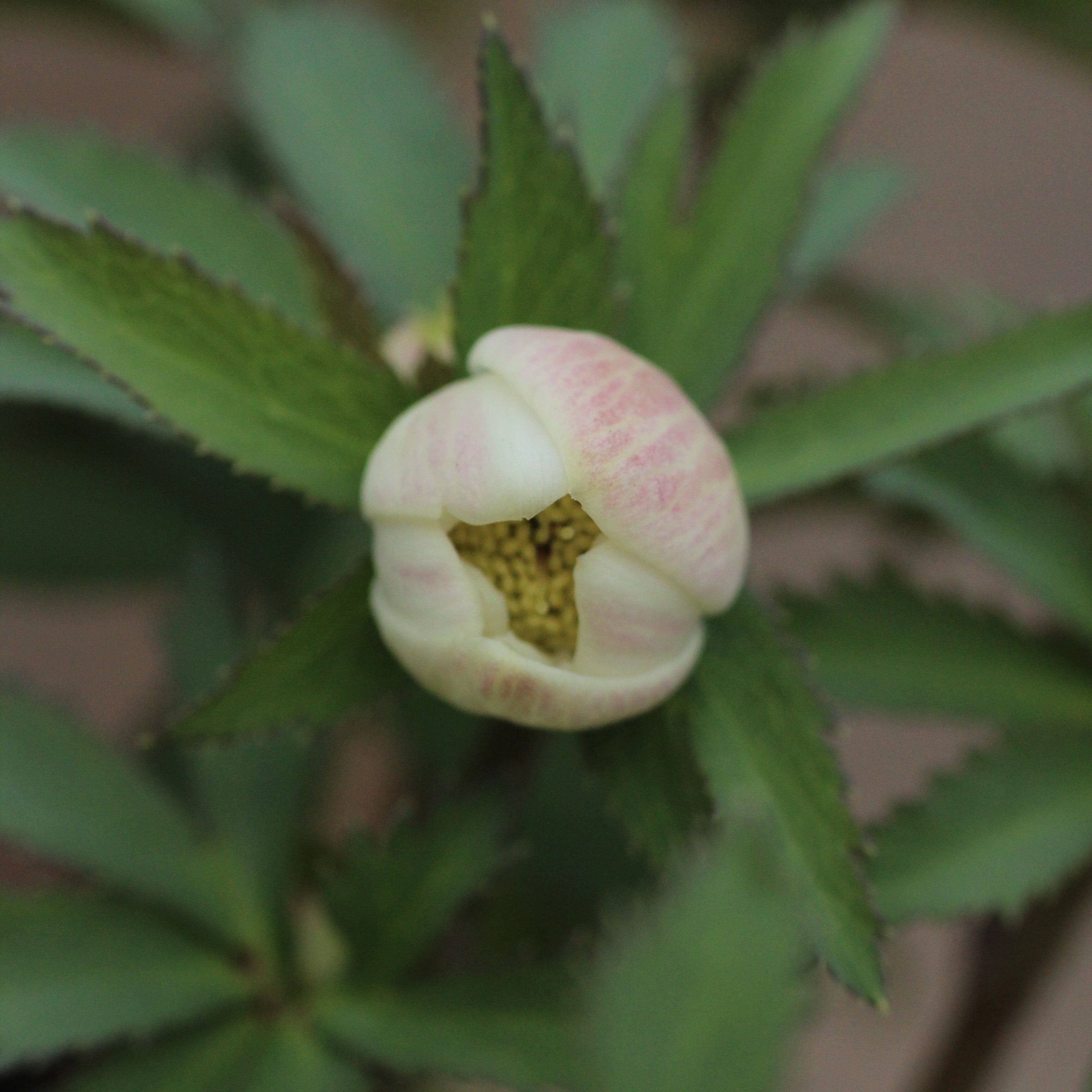 ウィンターシンフォニーの和風シリーズ「静(しずか)」のダブル。小さなアイボリーの花弁に、特徴的なダークパープルのフラッシュと、極細い覆輪が入る。花弁裏とつぼみがほんのり桃色に染まり可愛らしい。つぼみ付き。(1/23撮影)