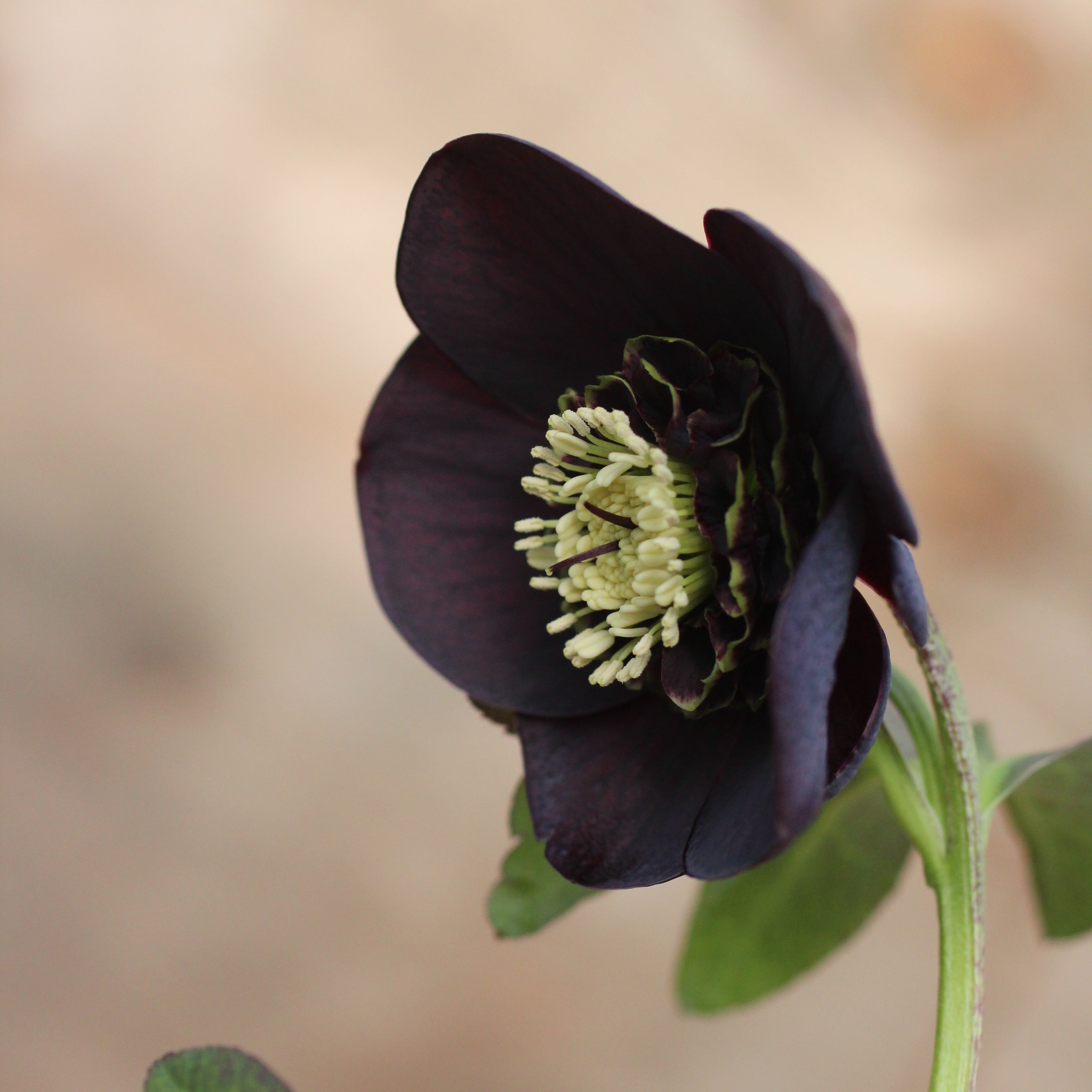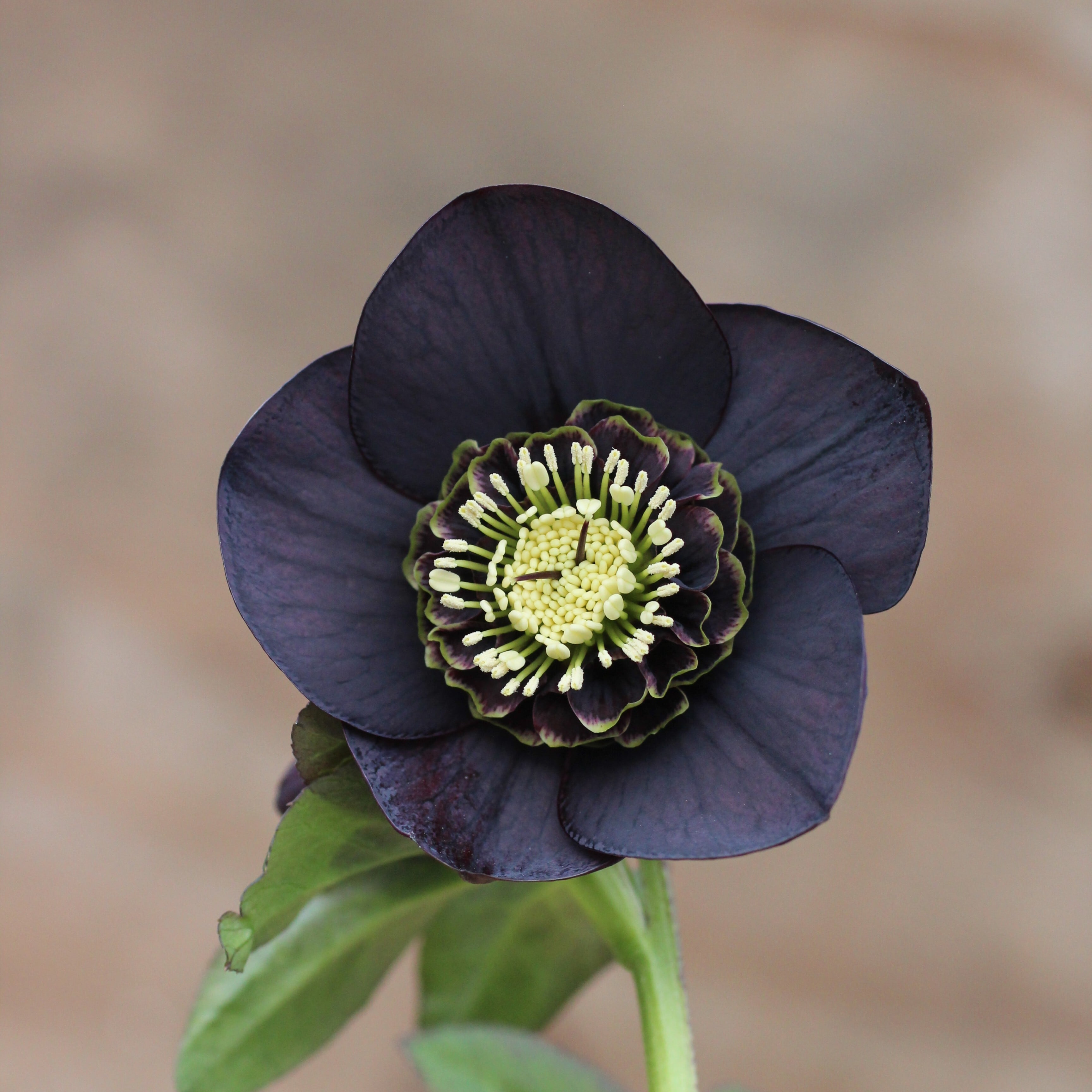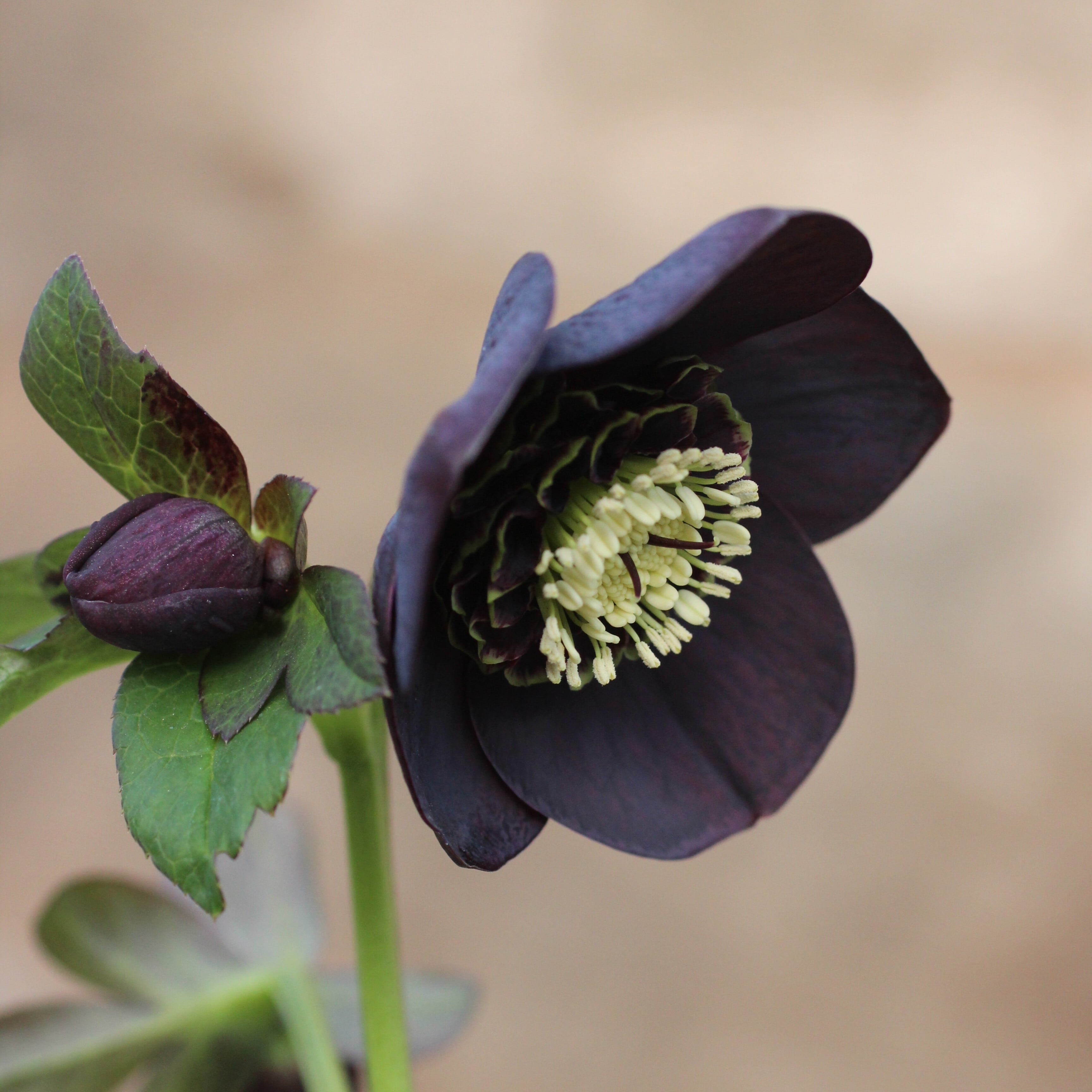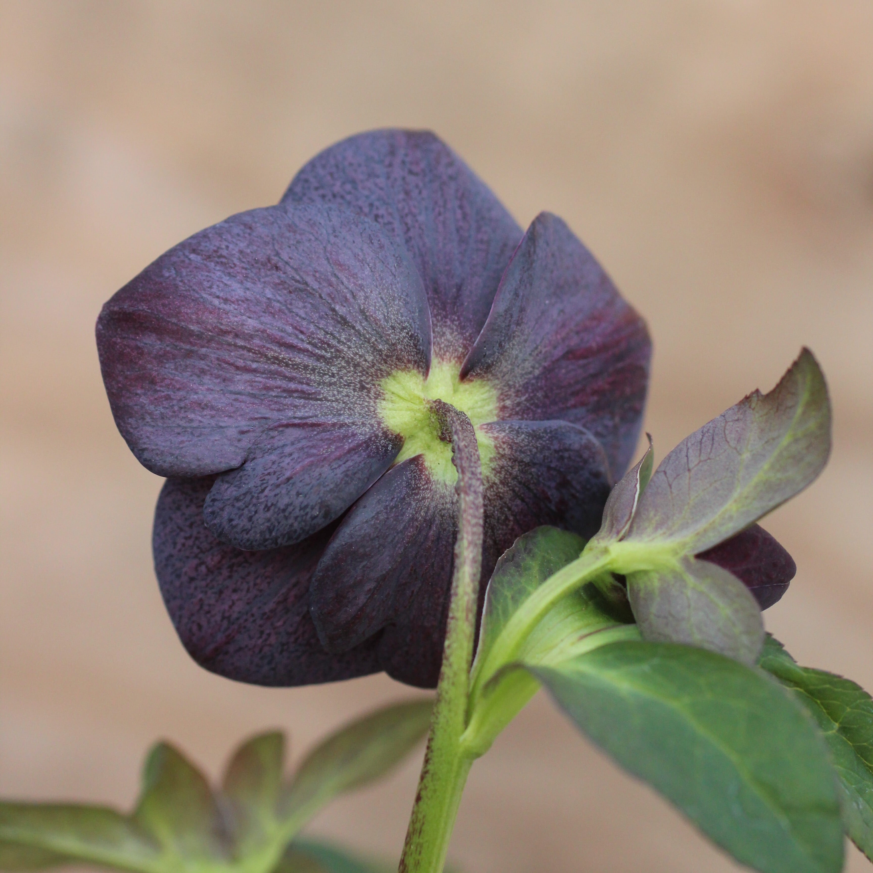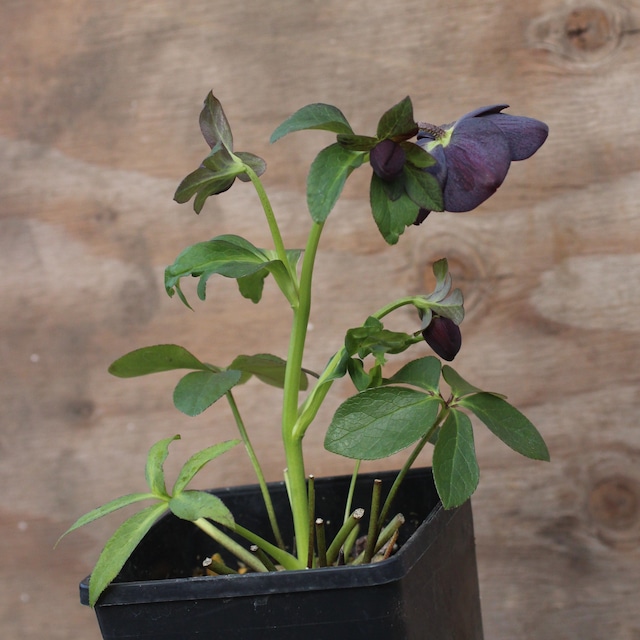 やや赤みのあるブラックのセミダブル。波打つネクタリーには珍しいグリーンピコティが入り、控えめだが個性的な存在感が大変美しい。つぼみ付き。(1/23撮影)