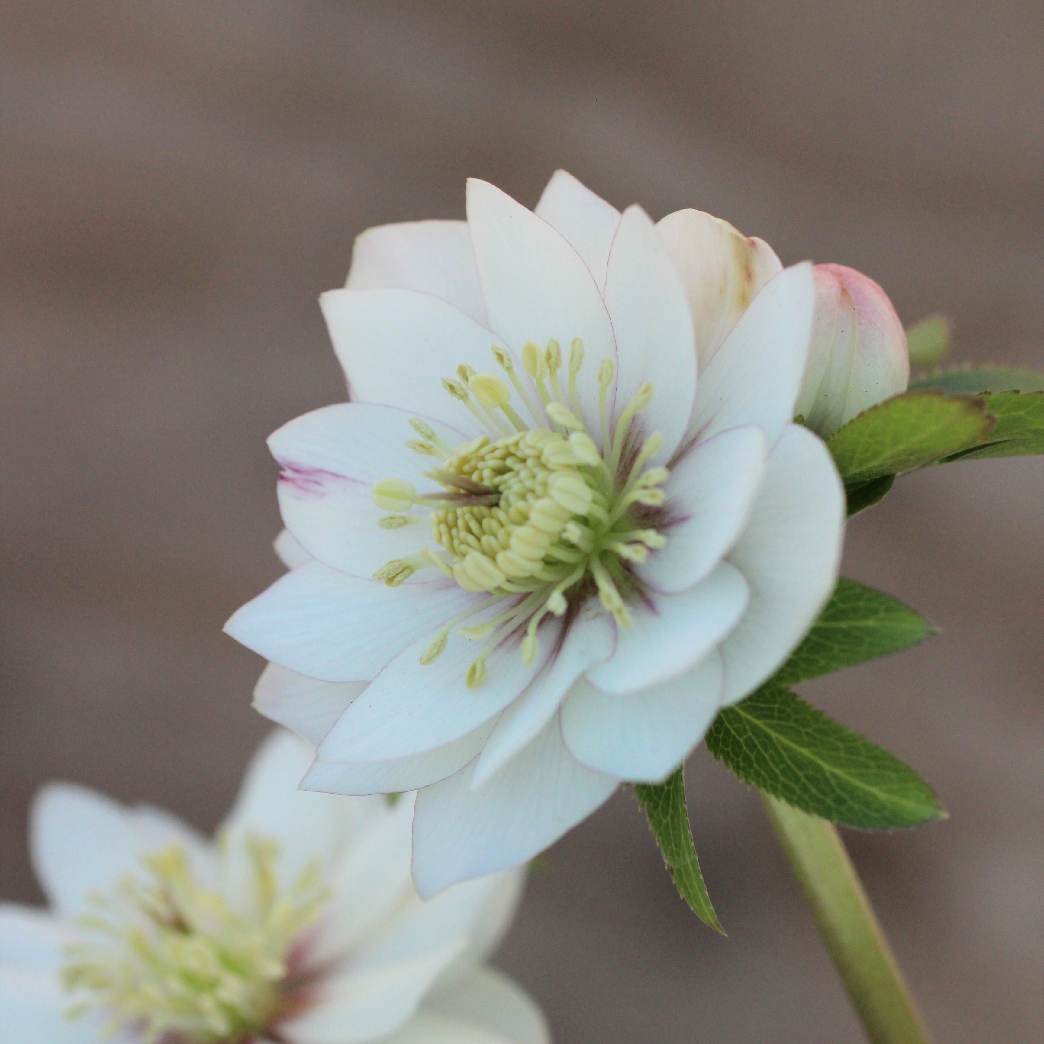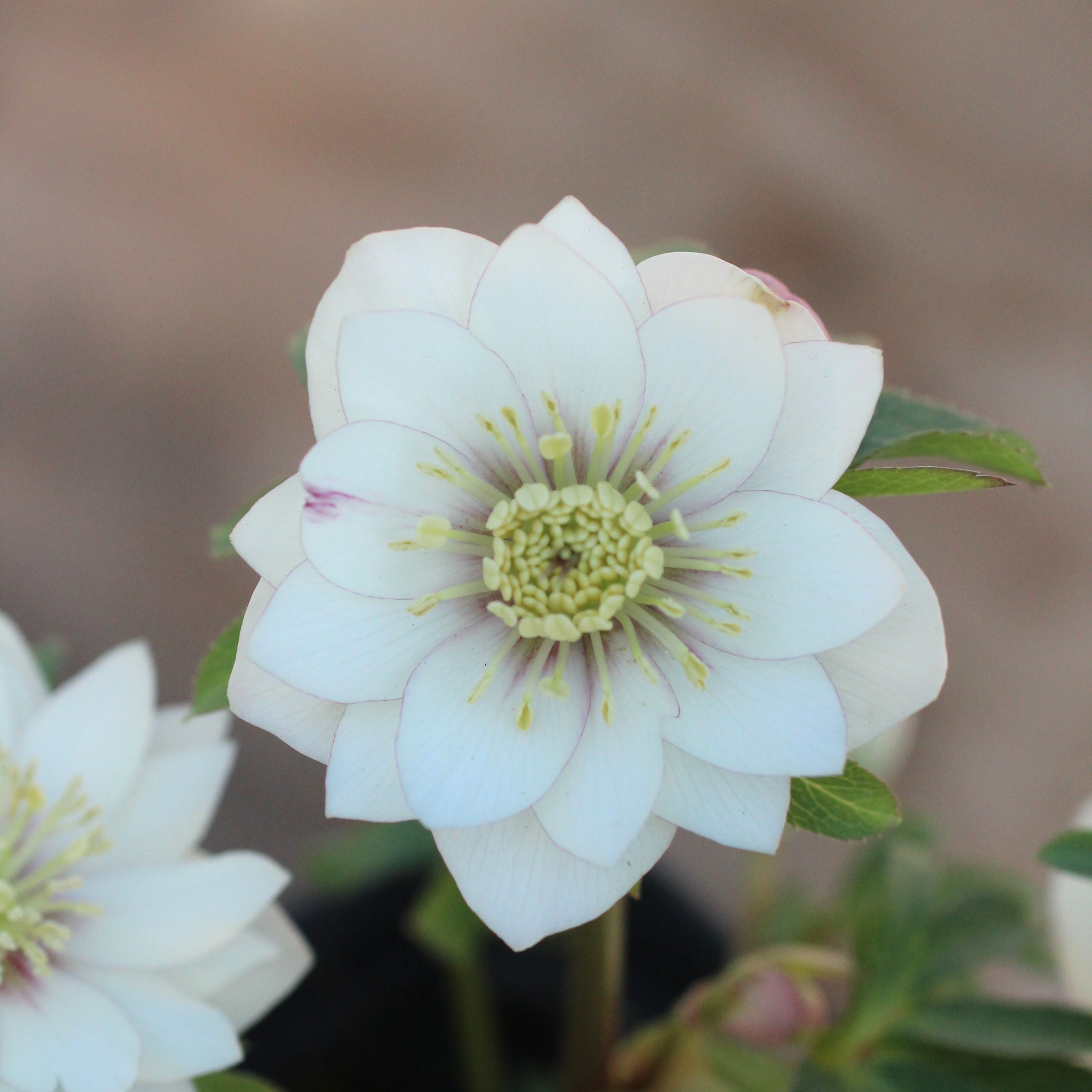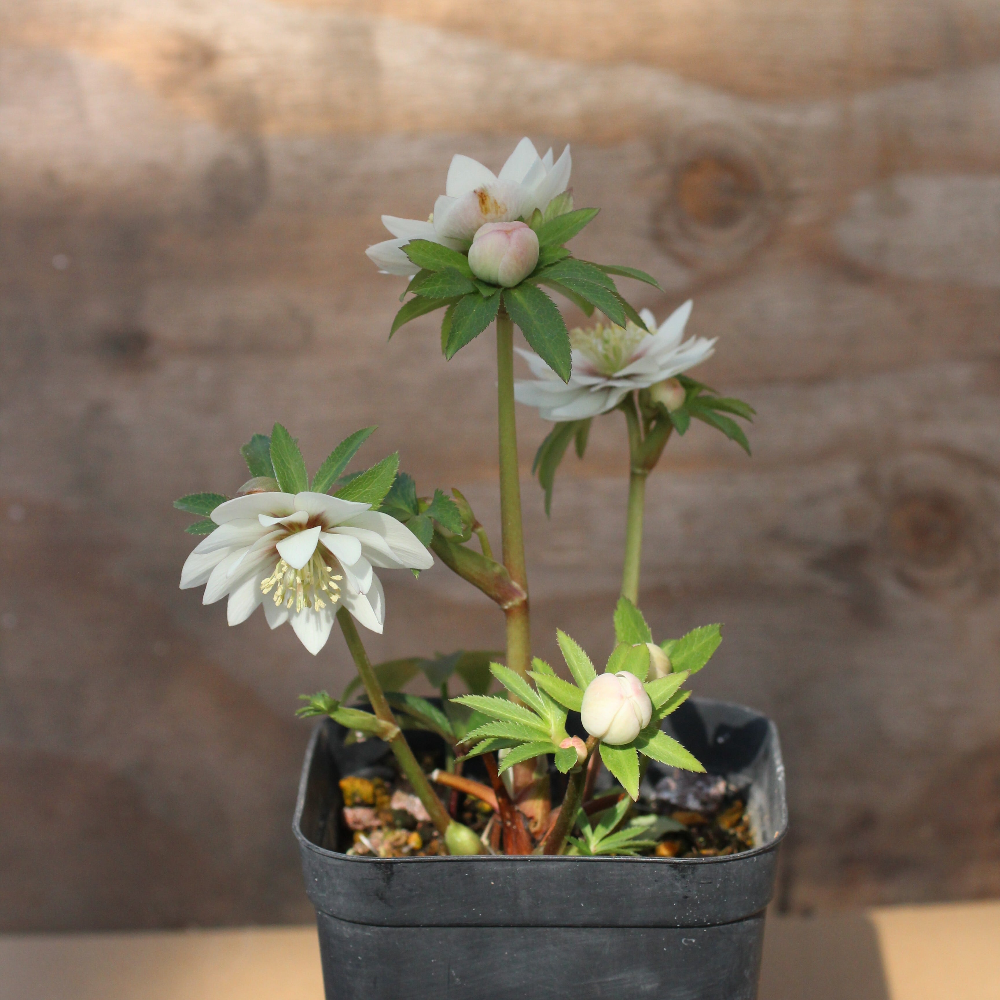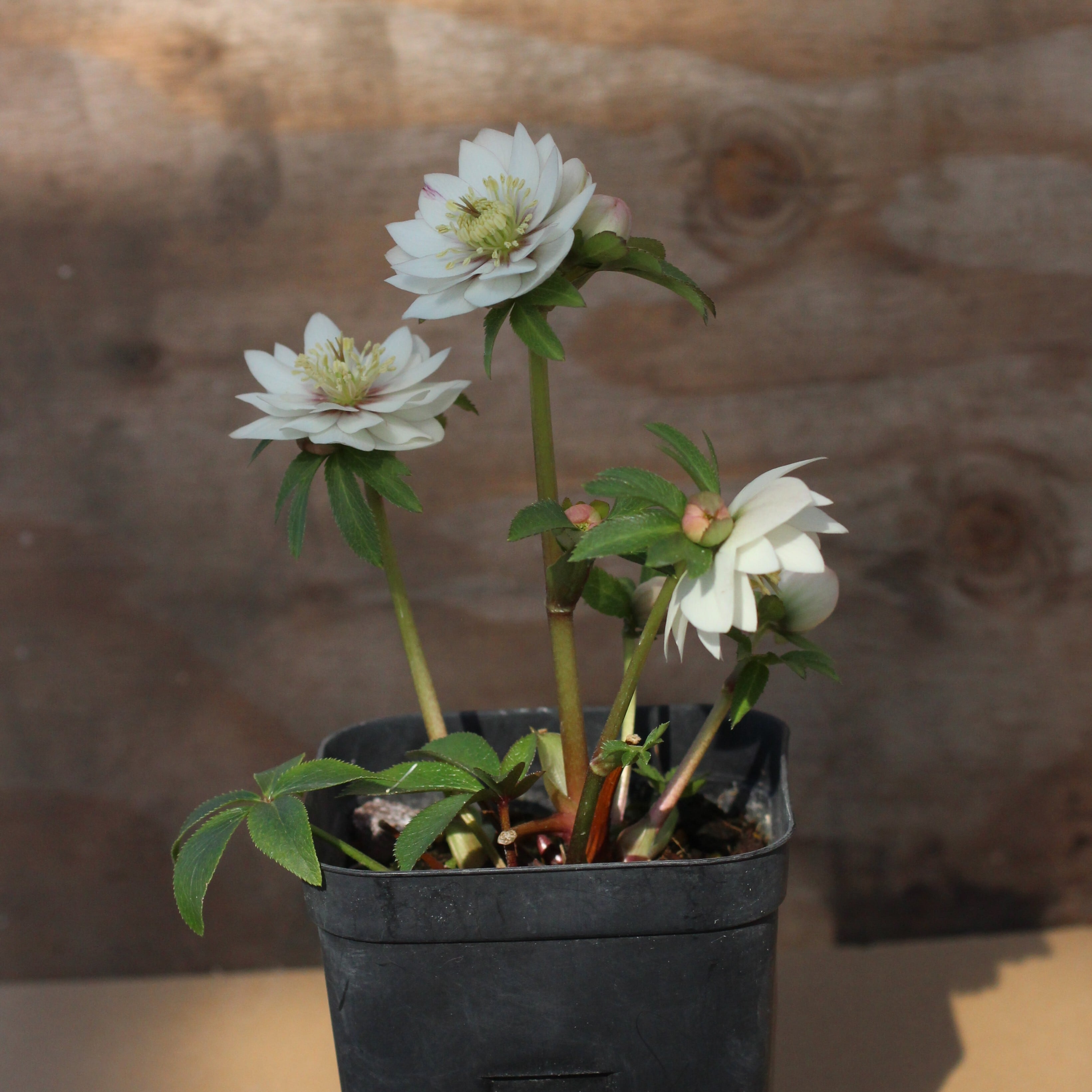 ウィンターシンフォニーの和風シリーズ「静(しずか)」のダブル。ホワイトの花弁に、控えめなダークパープルのフラッシュと、極細い覆輪が入る。つぼみがほんのり桃色に染まり可愛らしい。開花は進み、1〜2番花は開花終了。つぼみ4〜5個付き。(1/23撮影)