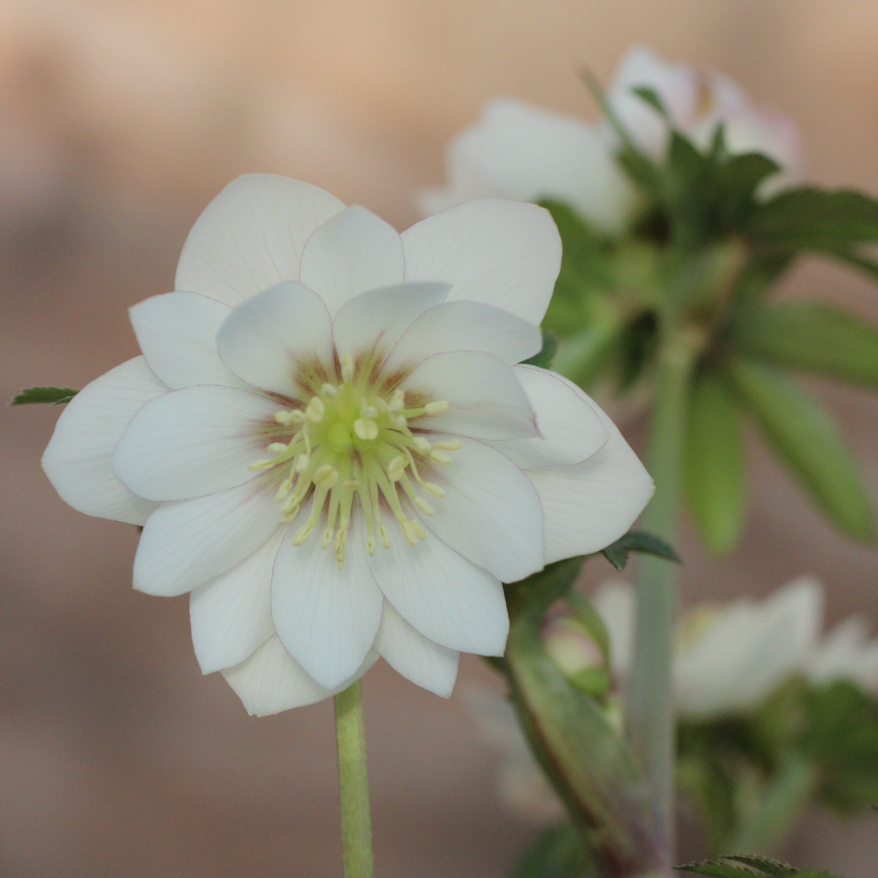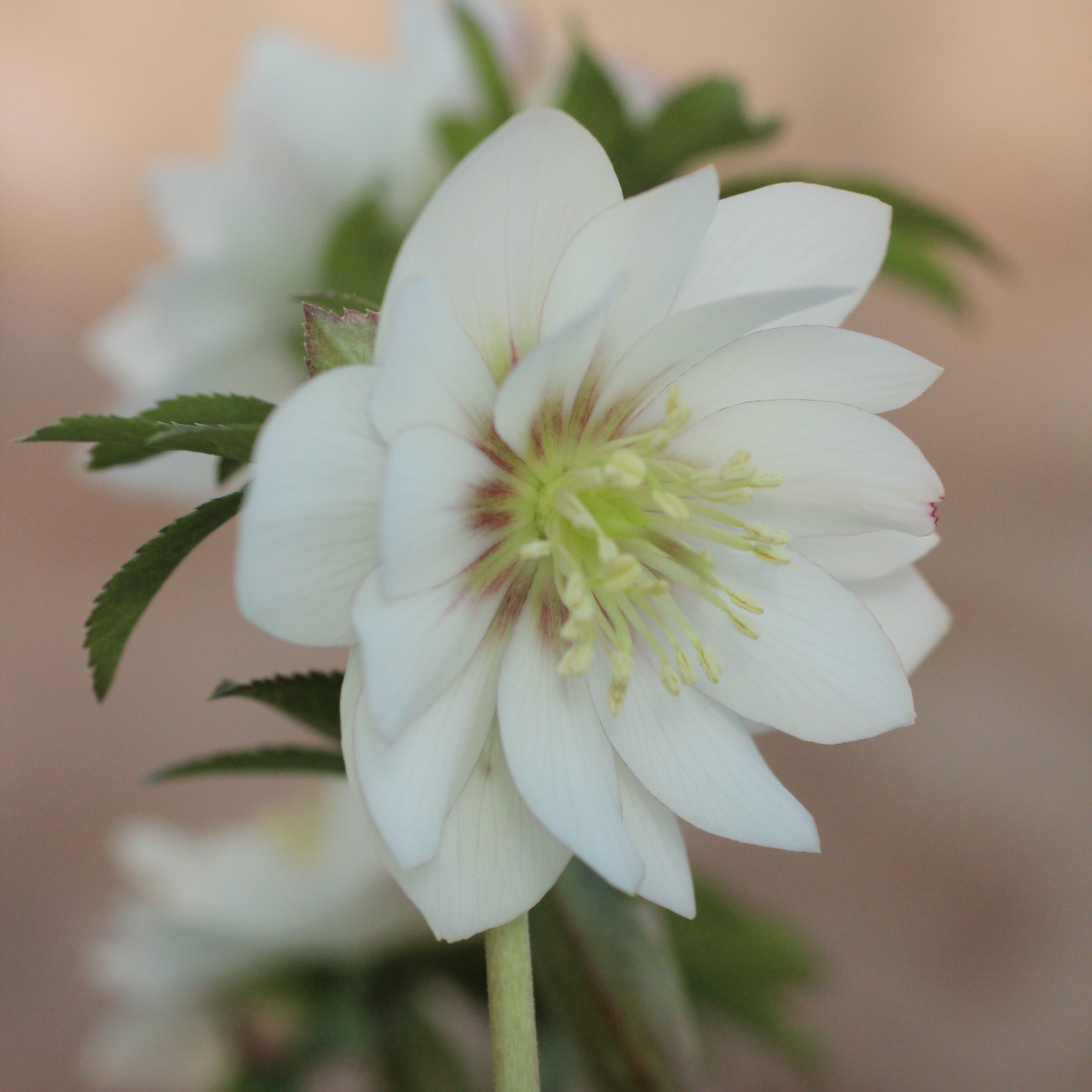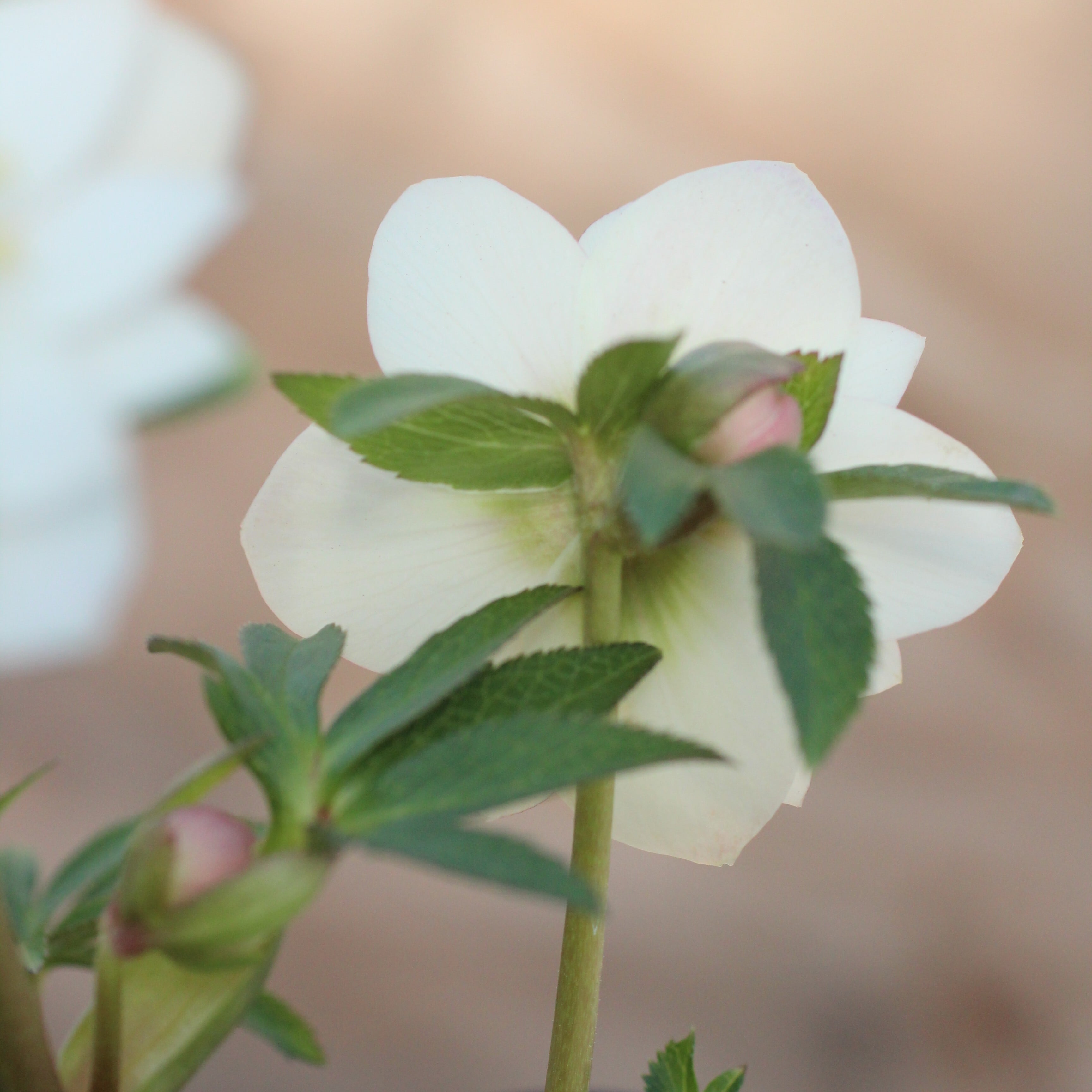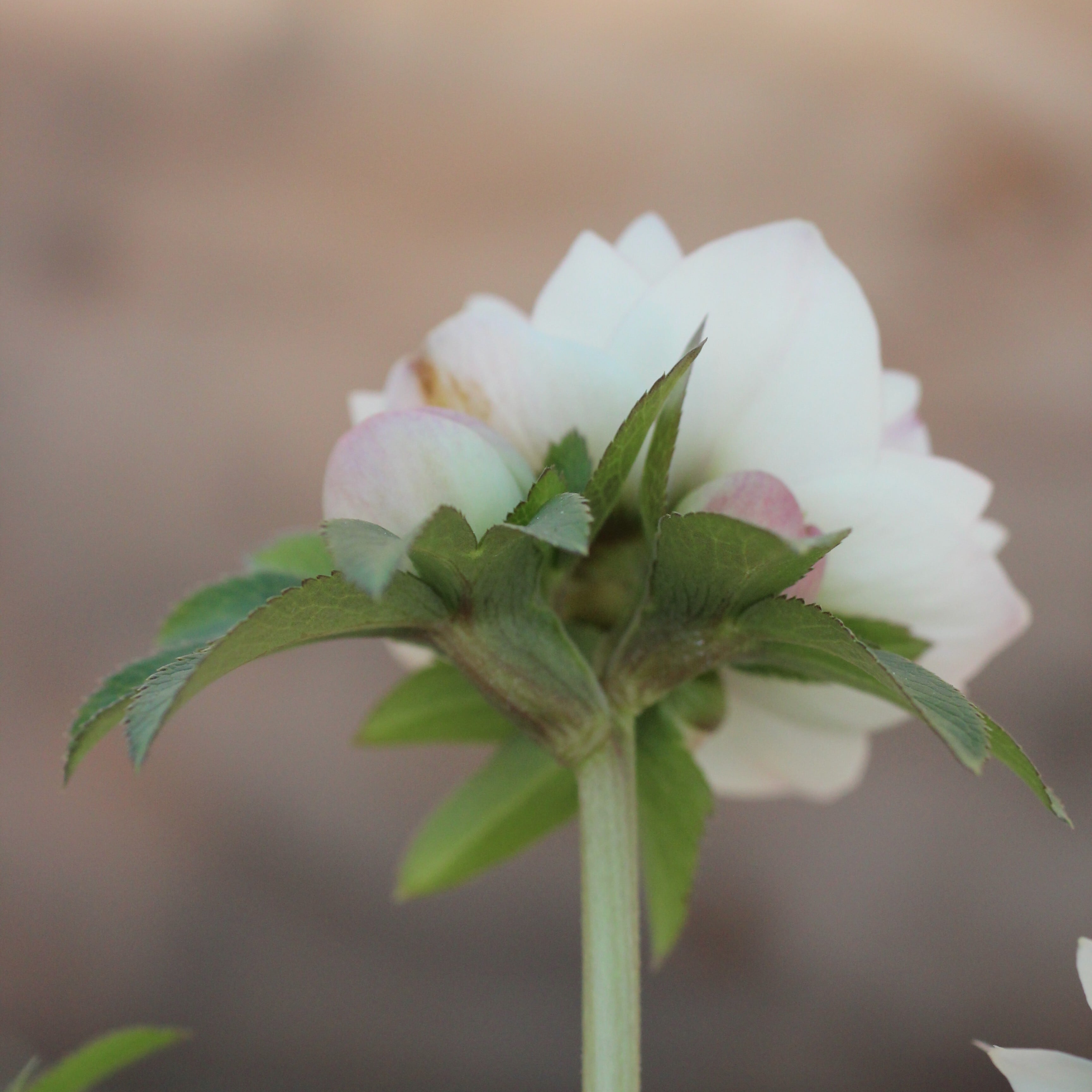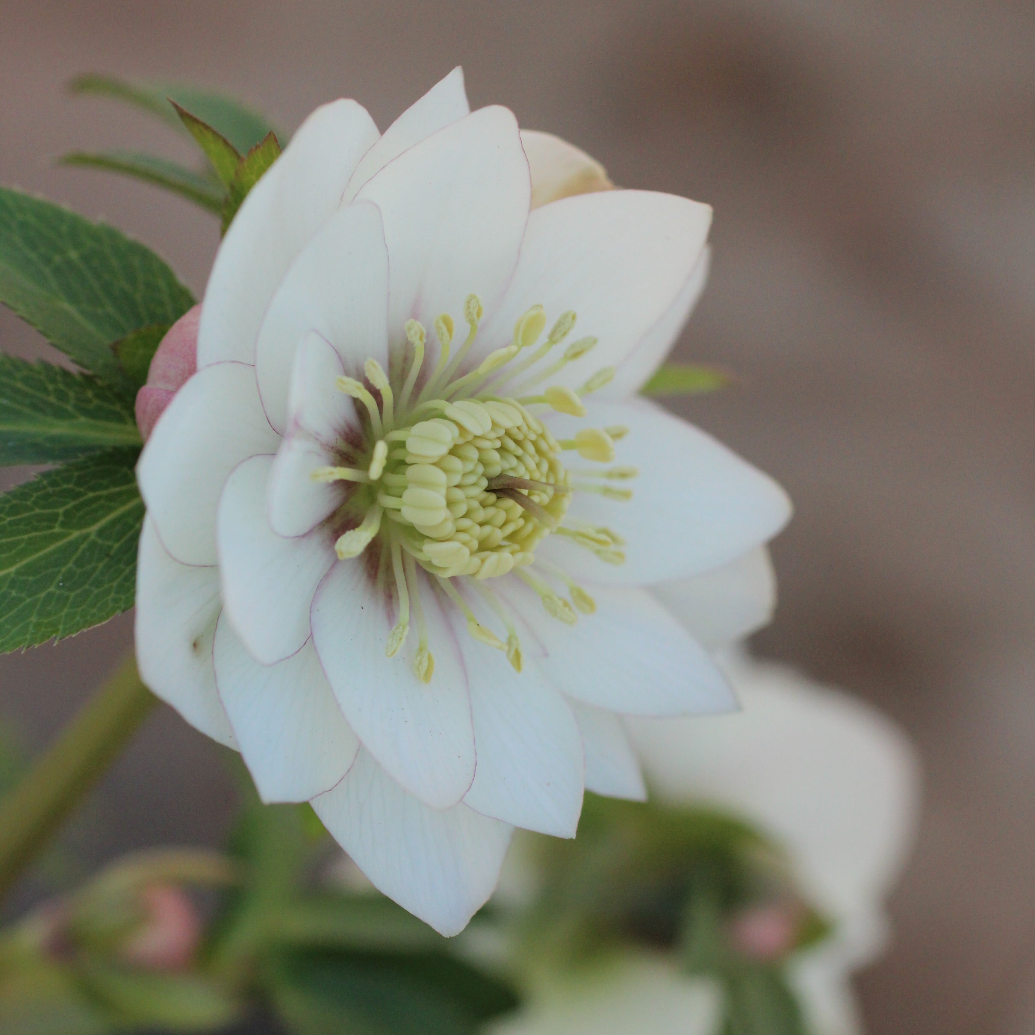 ウィンターシンフォニーの和風シリーズ「静(しずか)」のダブル。ホワイトの花弁に、控えめなダークパープルのフラッシュと、極細い覆輪が入る。つぼみがほんのり桃色に染まり可愛らしい。開花は進み、1〜2番花は開花終了。つぼみ4〜5個付き。(1/23撮影)
