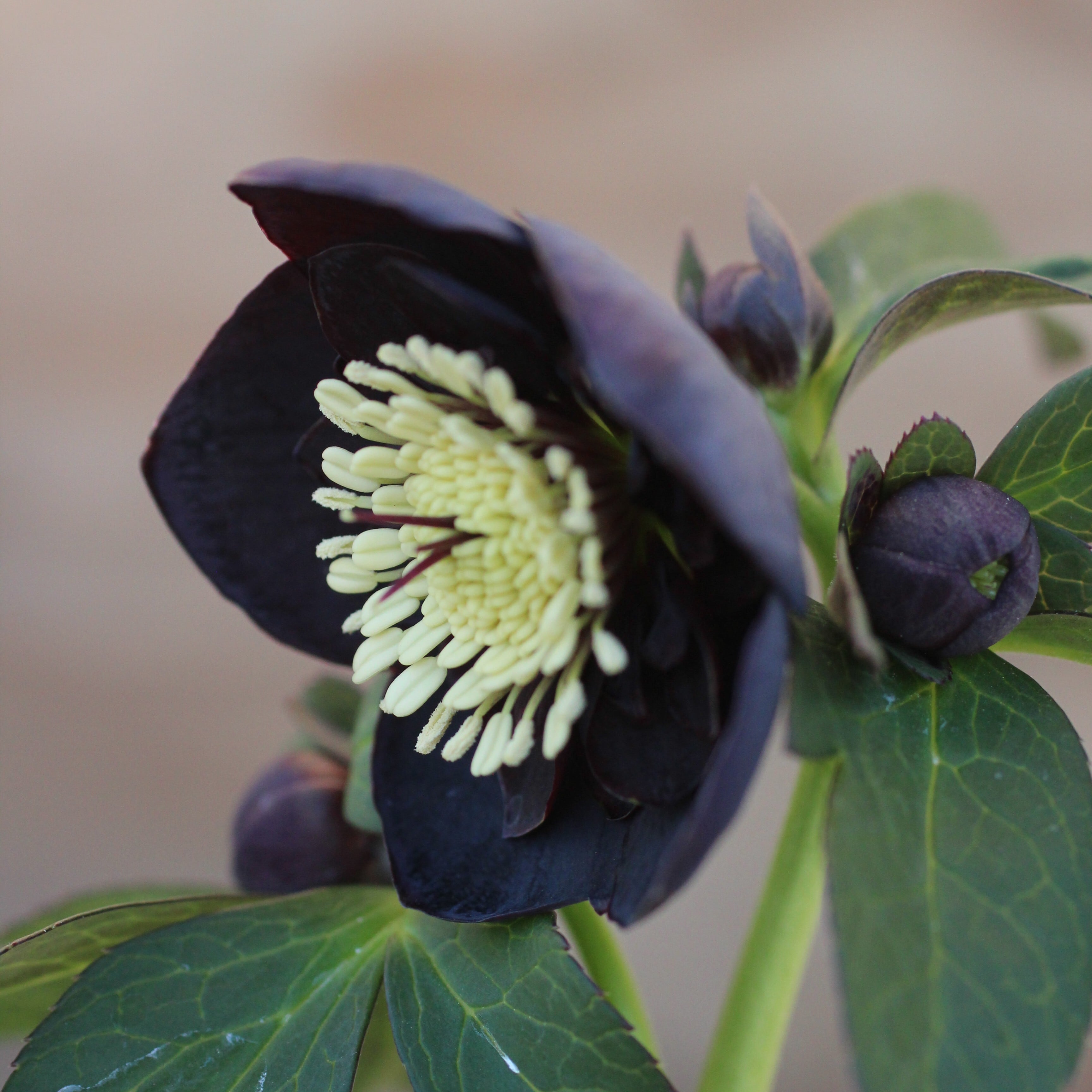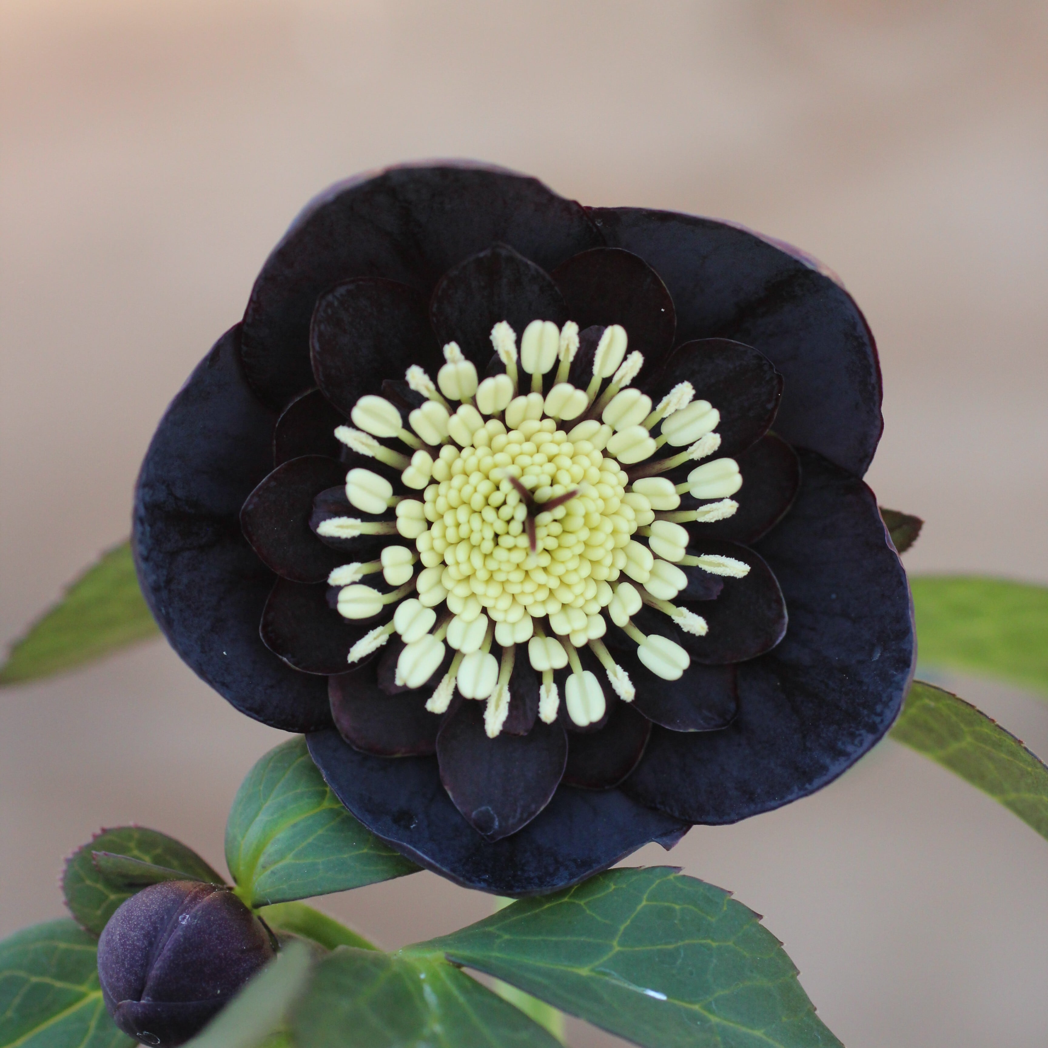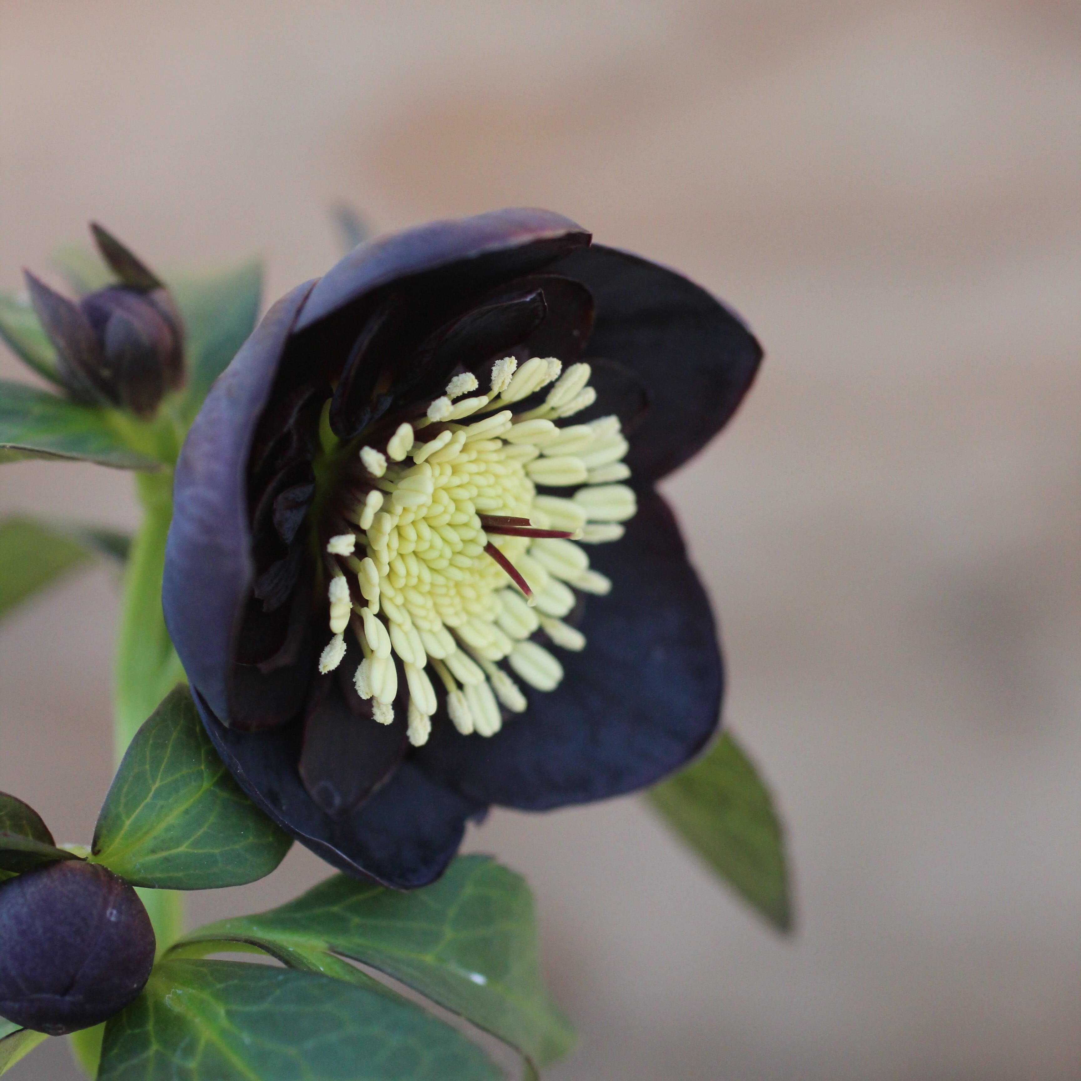 ブラックのセミダブル。マットなブラックの花弁に、紫がかる筒状ネクタリーが大変美しい。つぼみ付き。(1/23撮影)