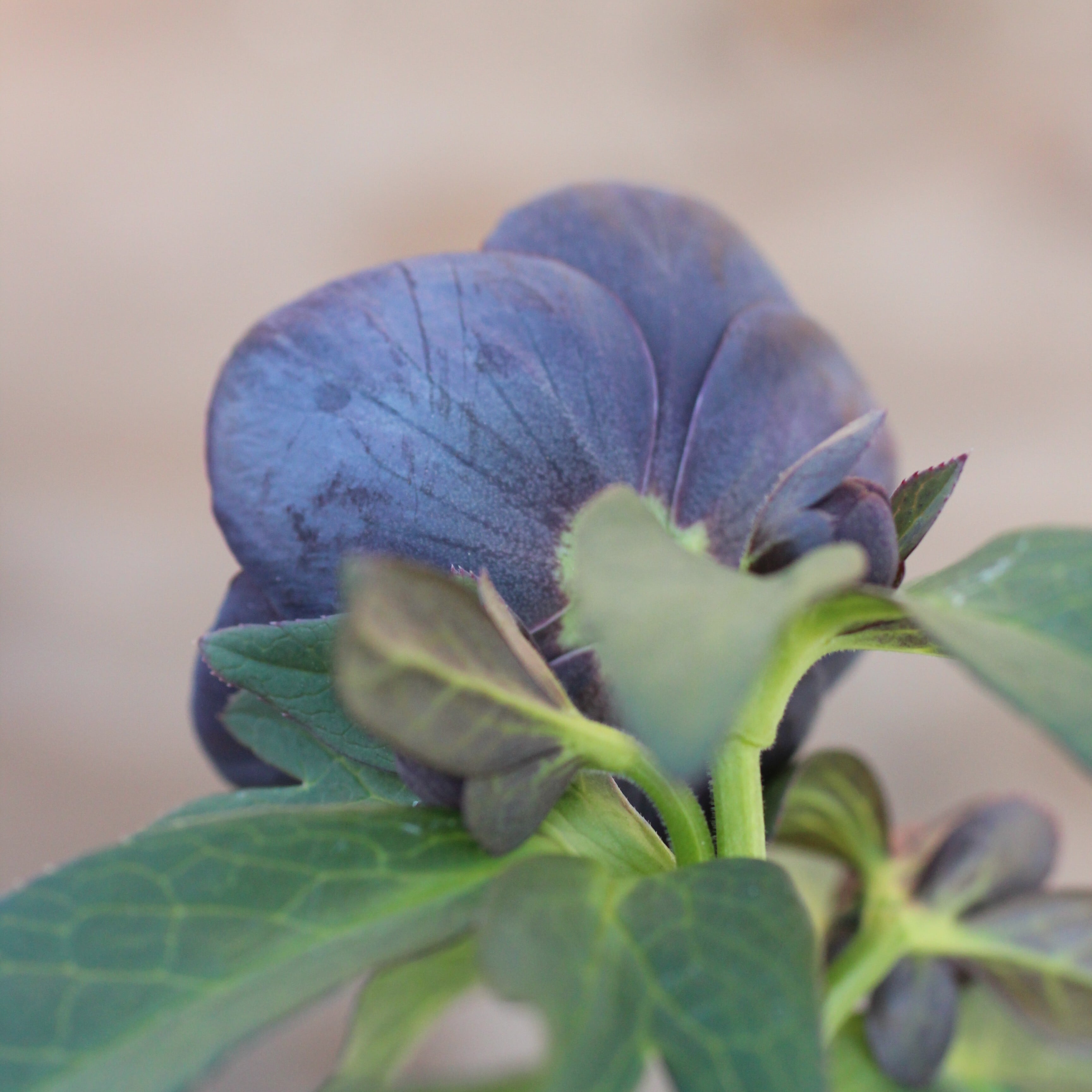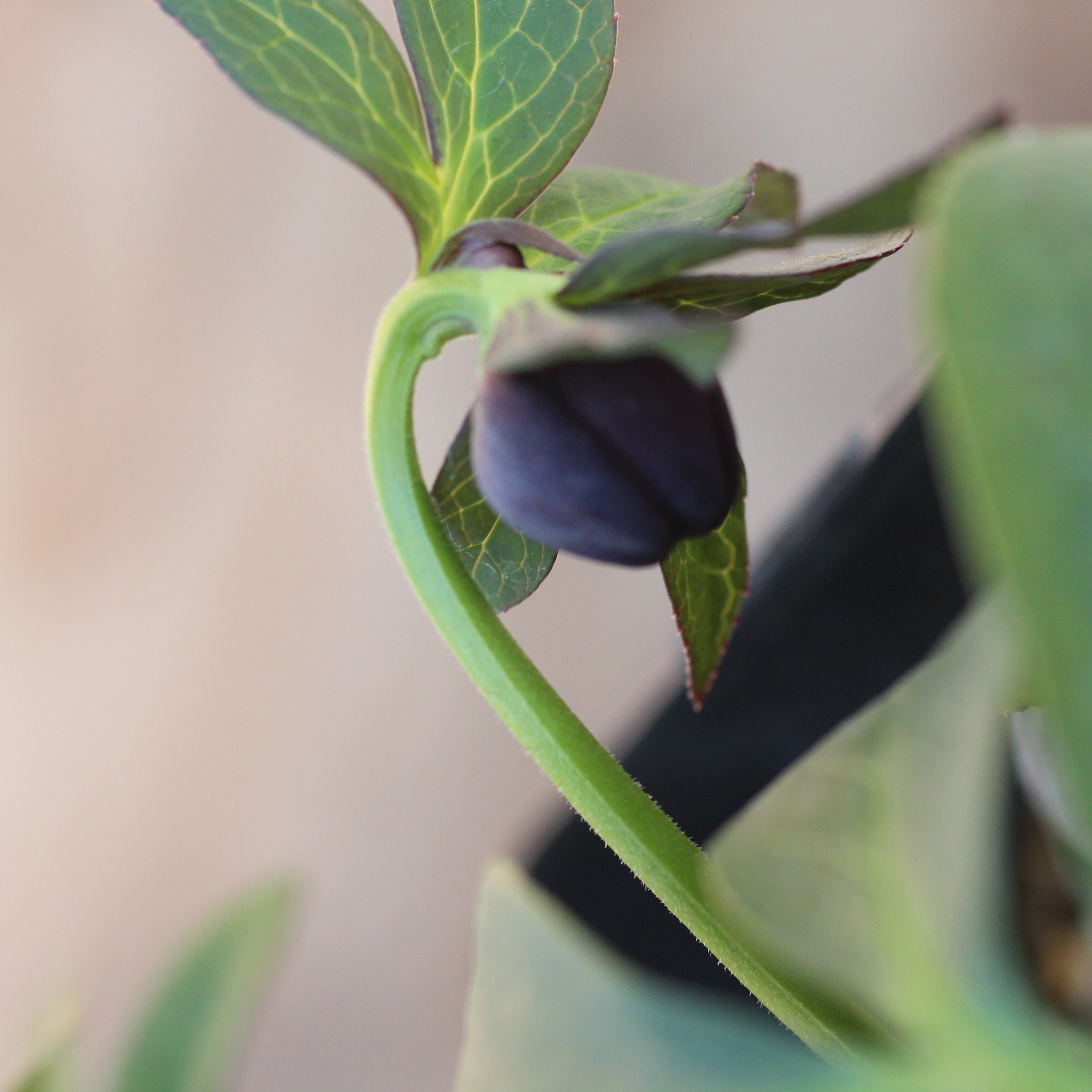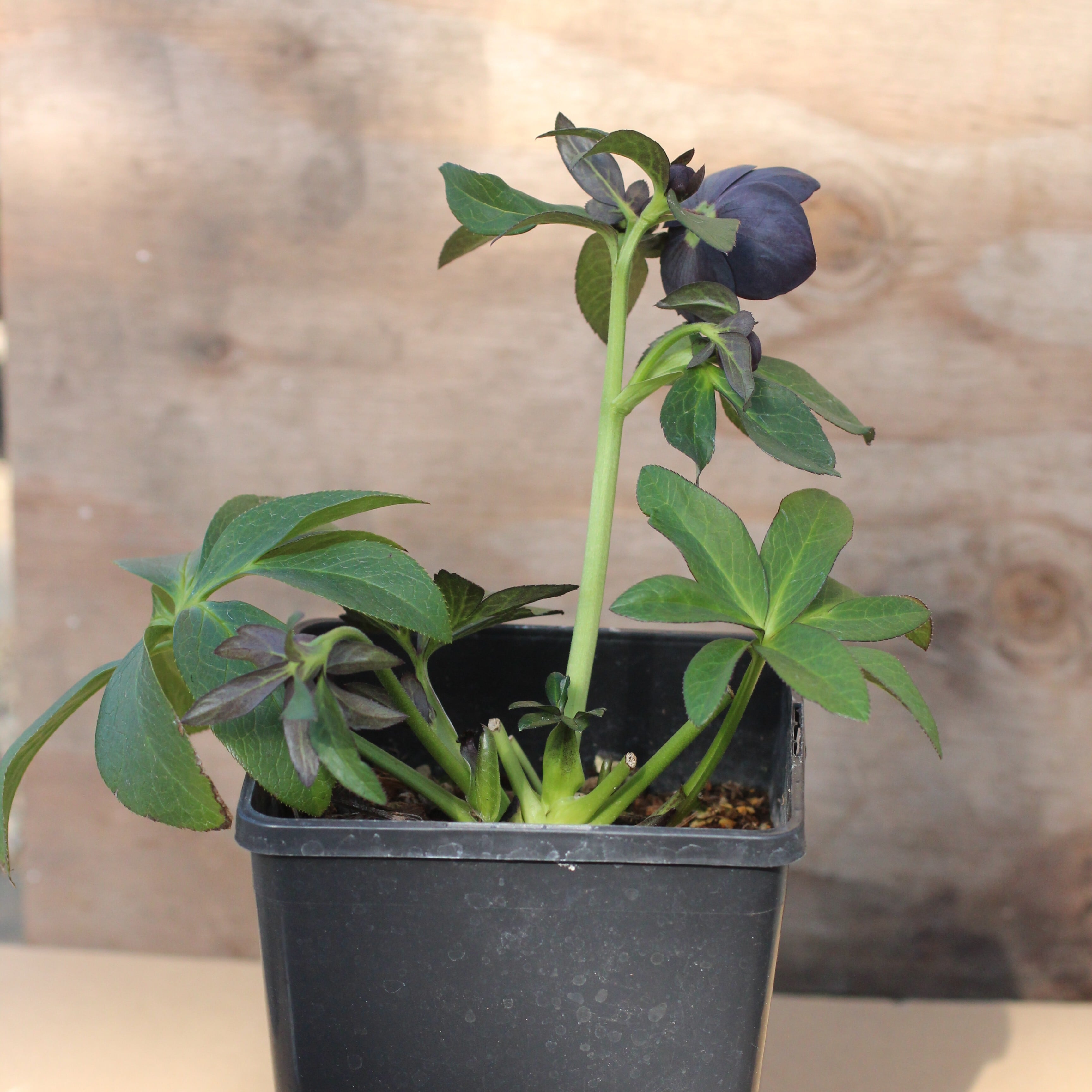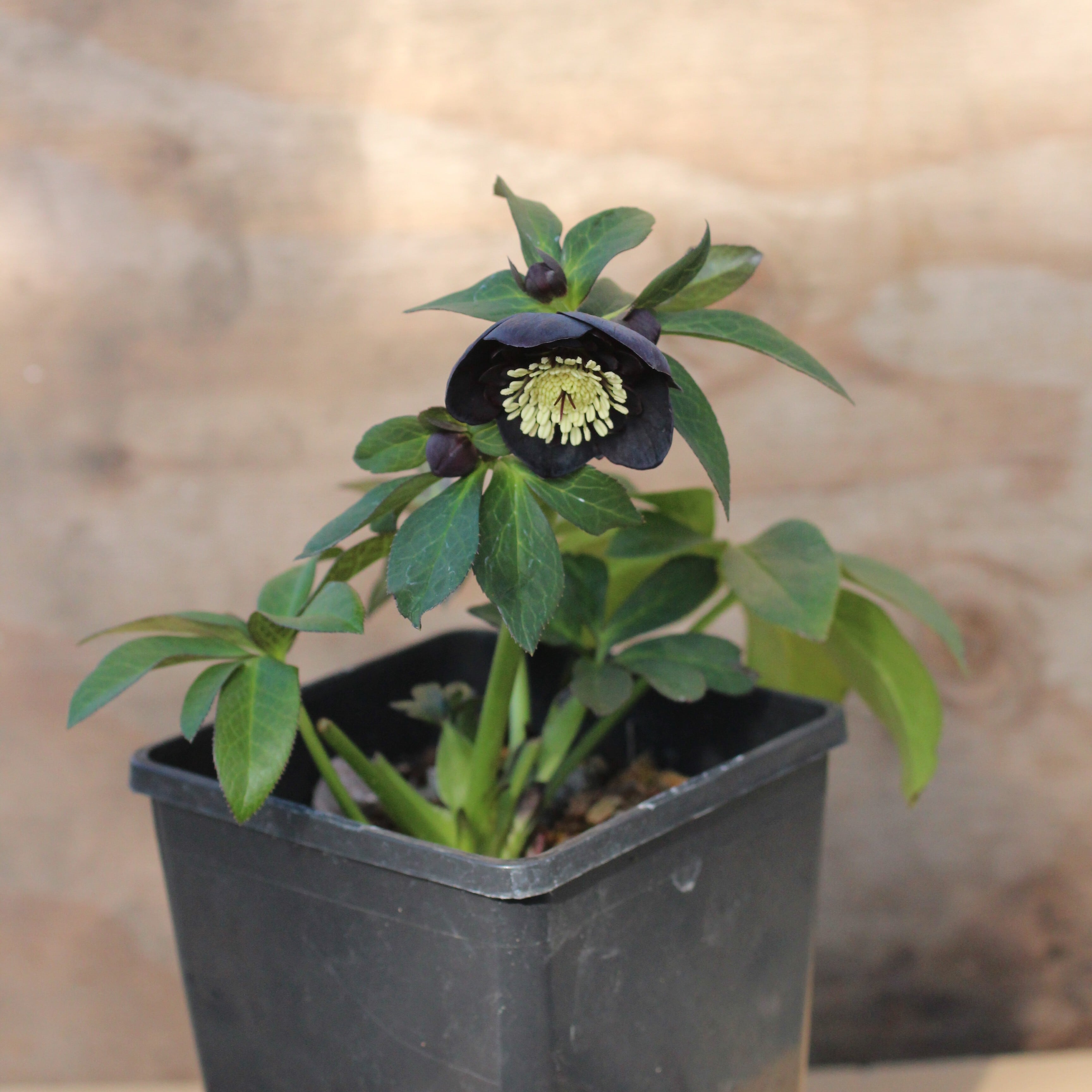ブラックのセミダブル。マットなブラックの花弁に、紫がかる筒状ネクタリーが大変美しい。つぼみ付き。(1/23撮影)
