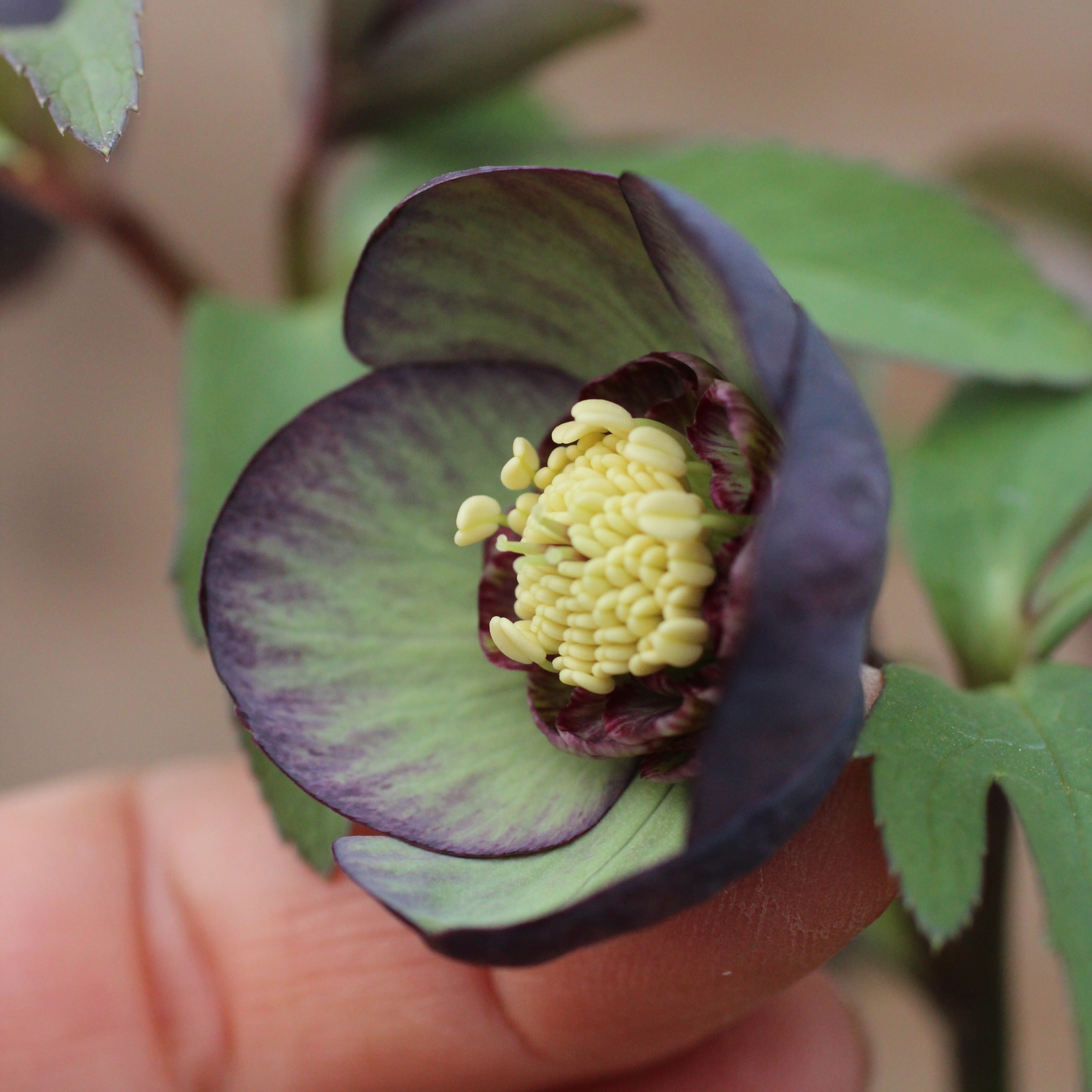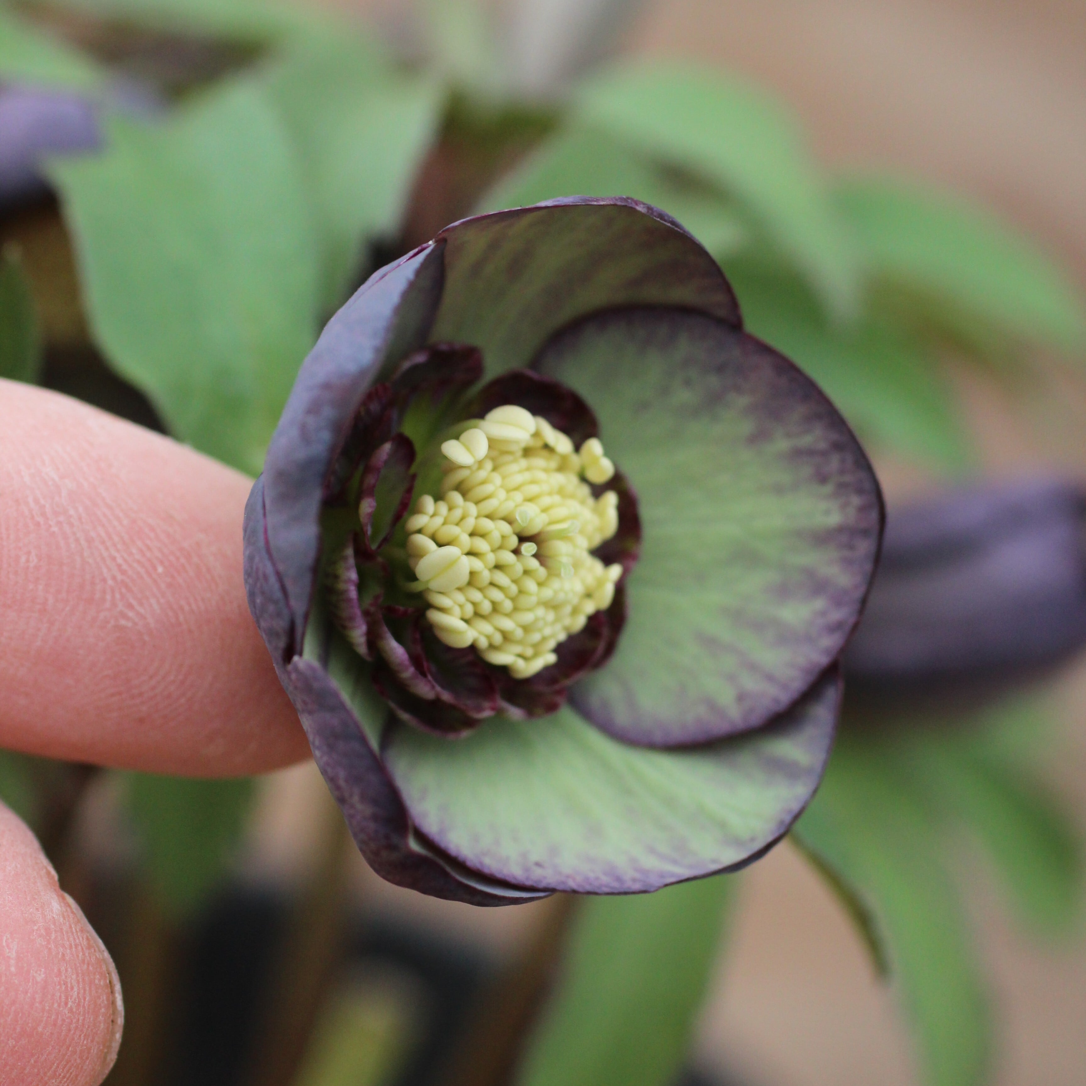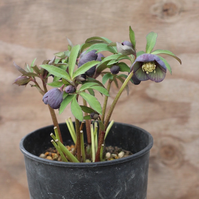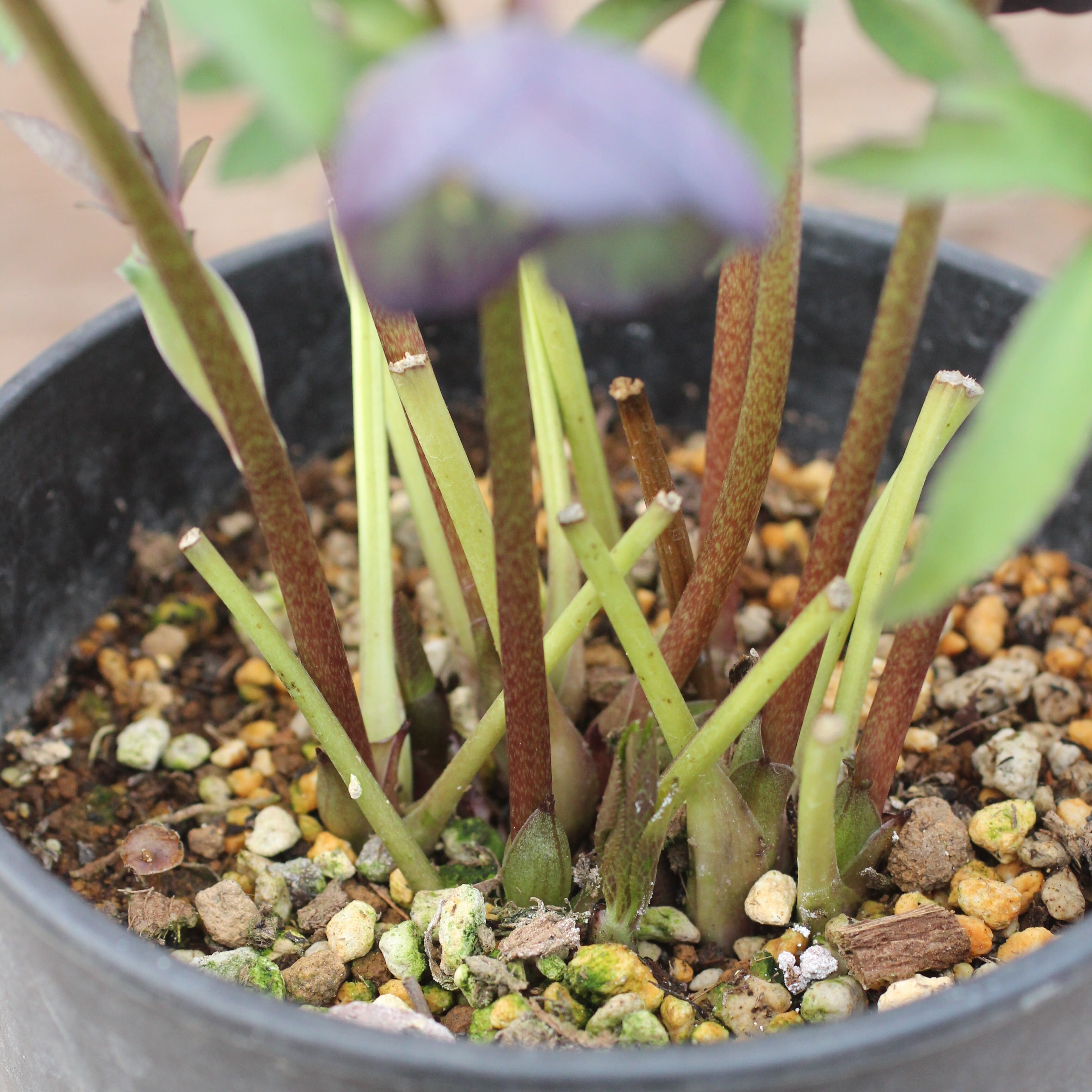 グリーンとグレープのバイカラーセミダブル。パープルでかすれたネクタリーがちょこんと付いて可愛らしさもある。たくさんのつぼみ付き。(1/27撮影)