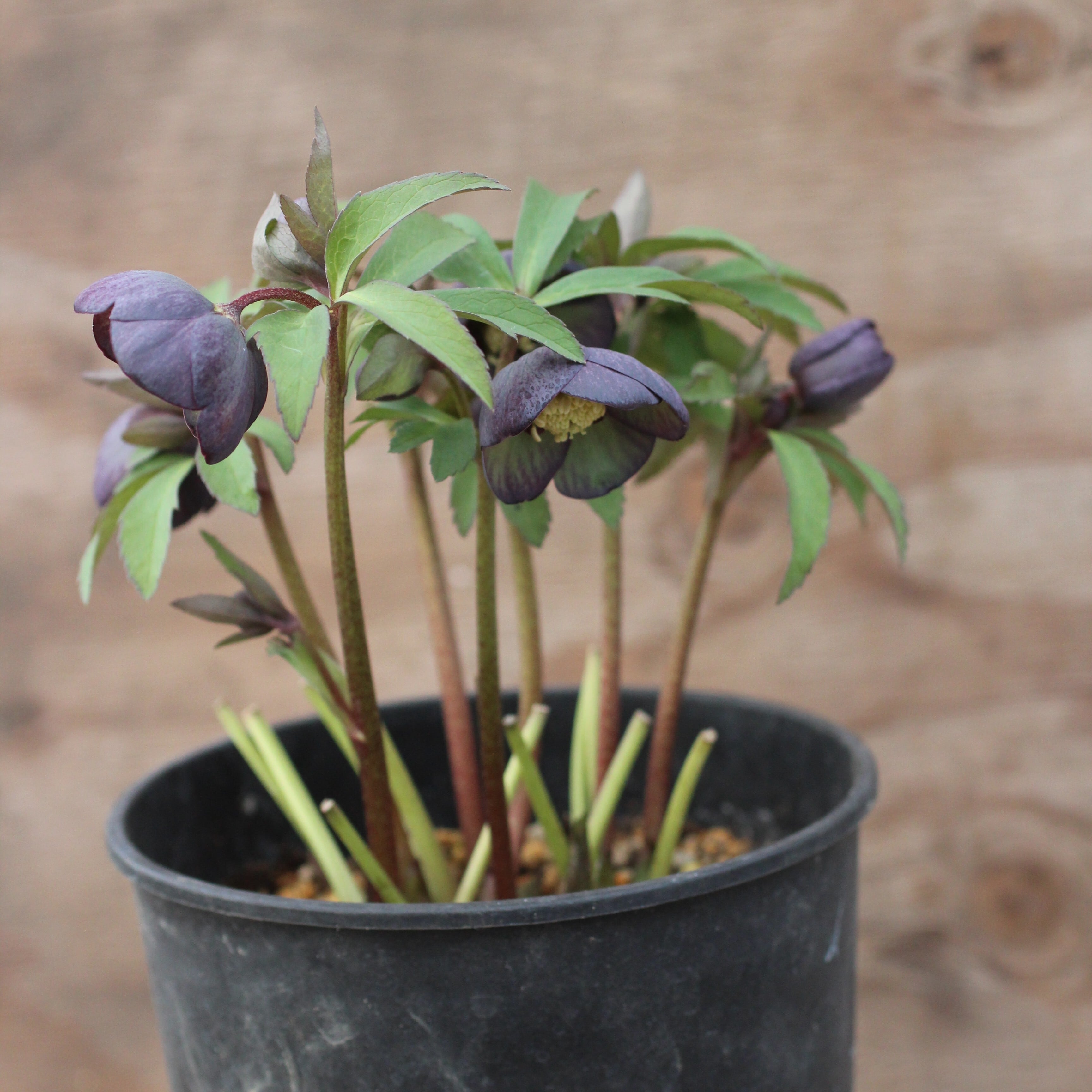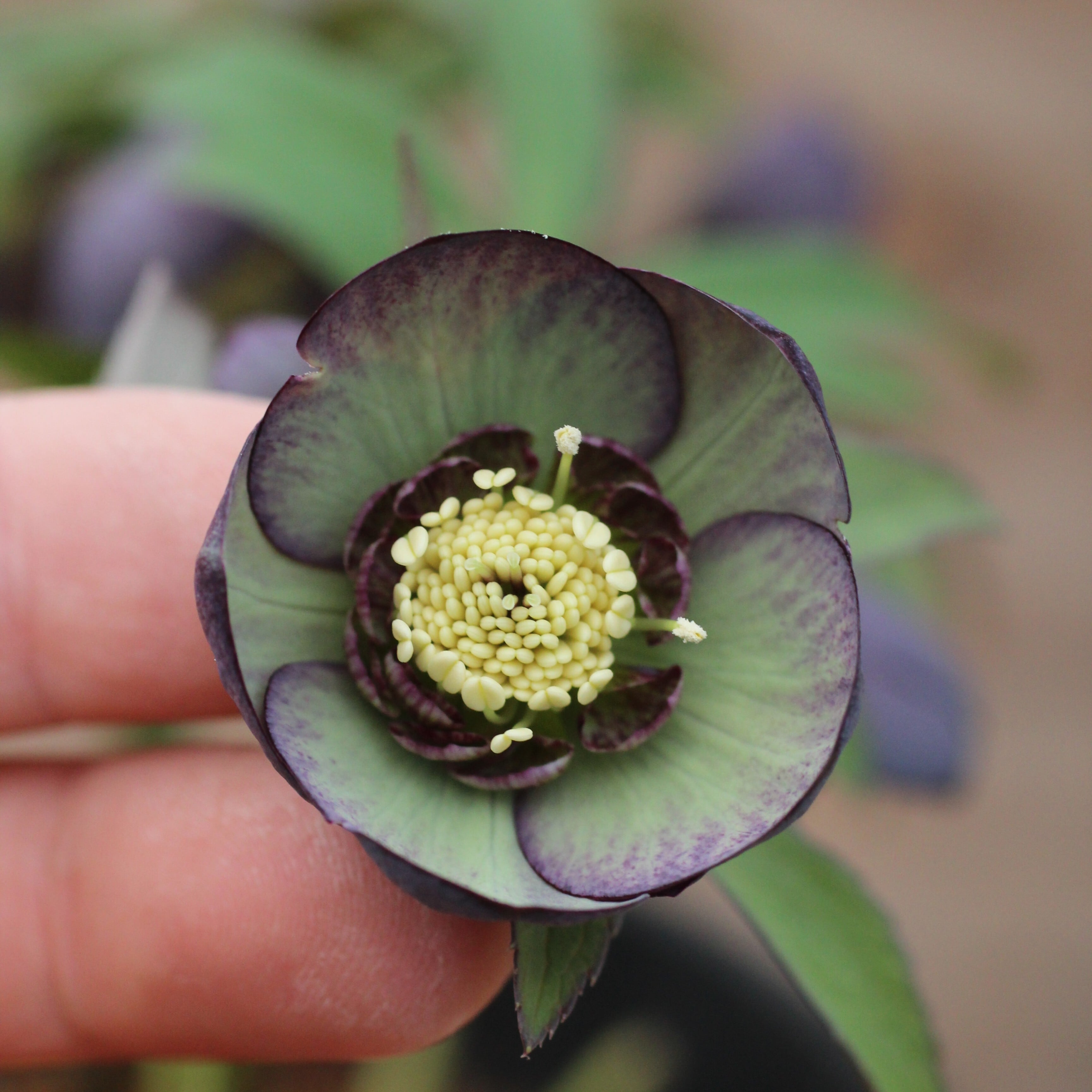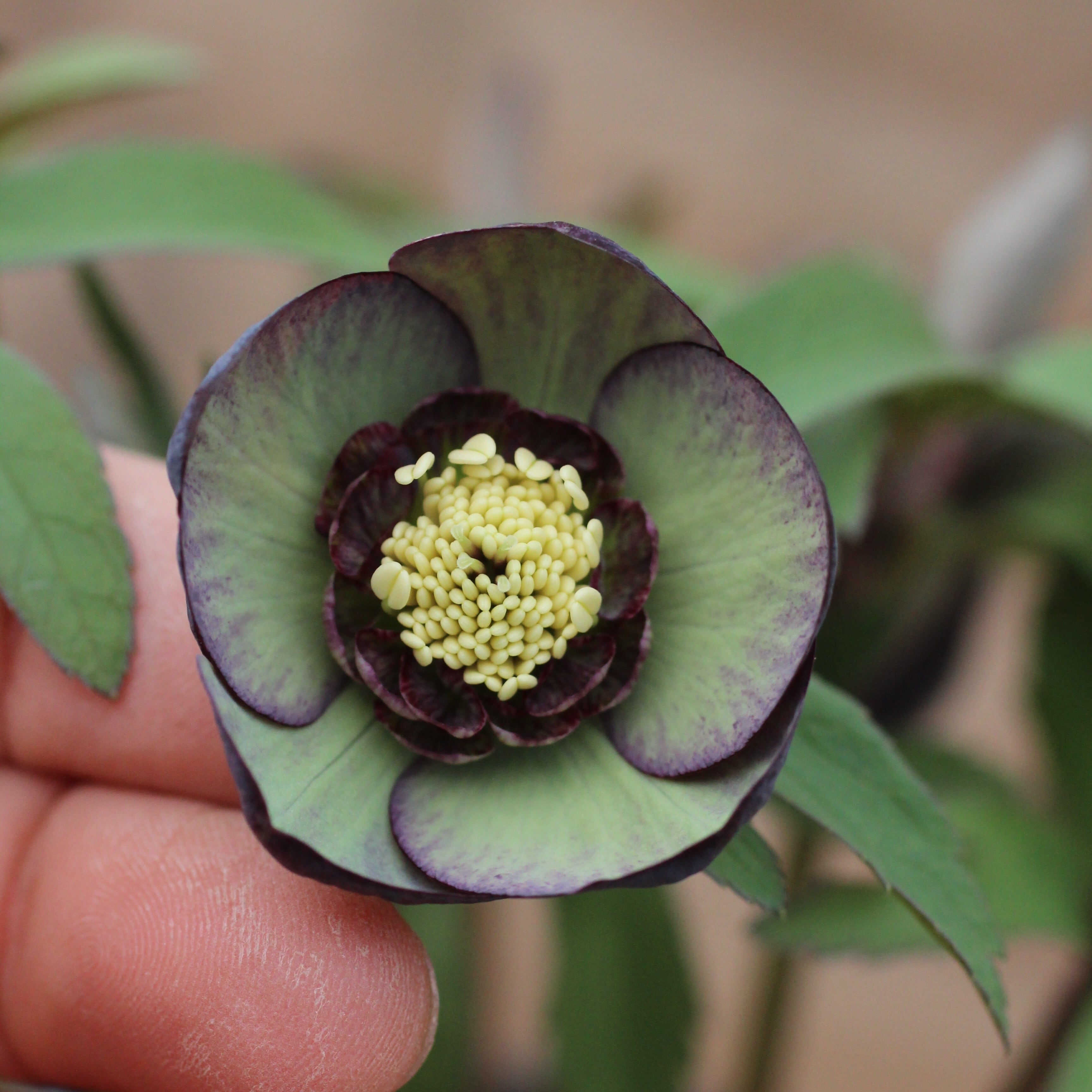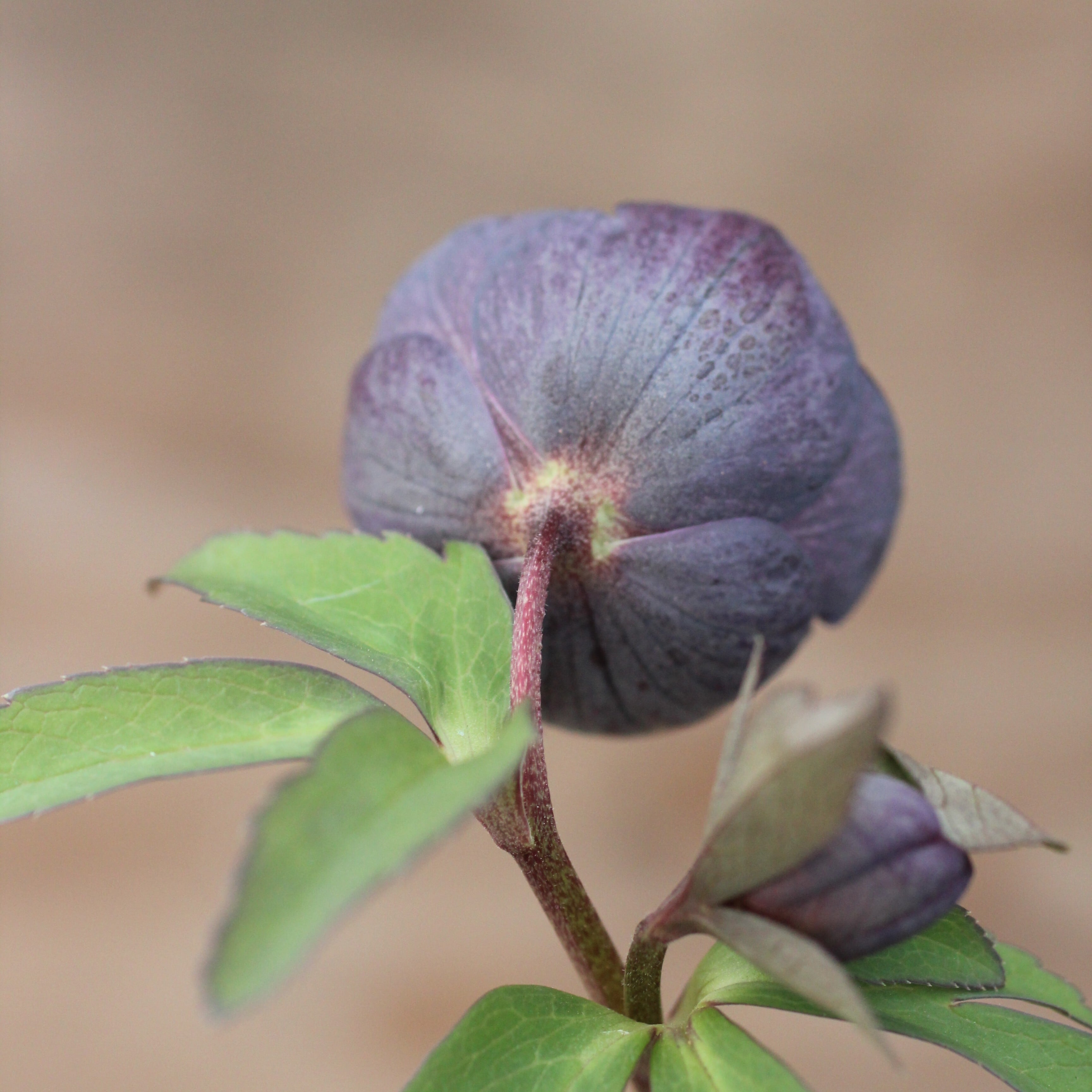 グリーンとグレープのバイカラーセミダブル。パープルでかすれたネクタリーがちょこんと付いて可愛らしさもある。たくさんのつぼみ付き。(1/27撮影)