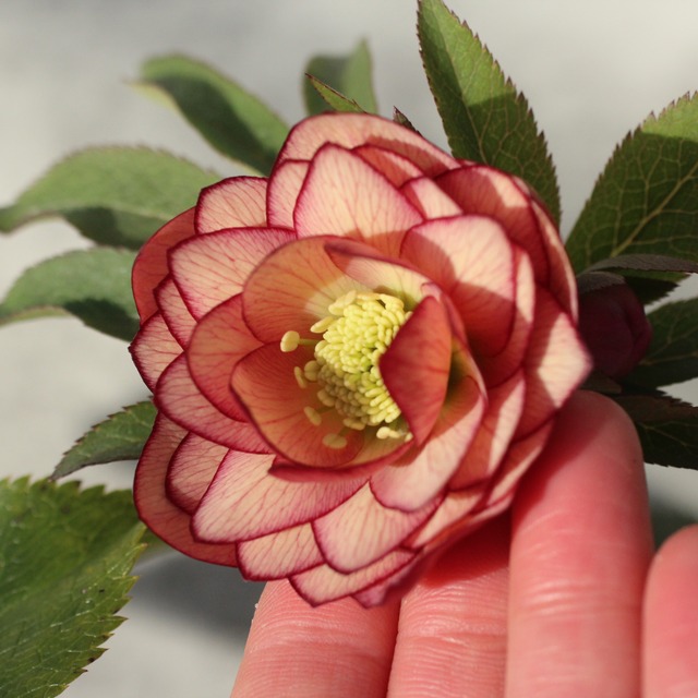 アプリコットの花弁に、繊細な赤いベインが美しい。花弁裏とつぼみの濃いピンクが果実のように瑞々しく可愛らしい。つぼみ付き。(1/31撮影)