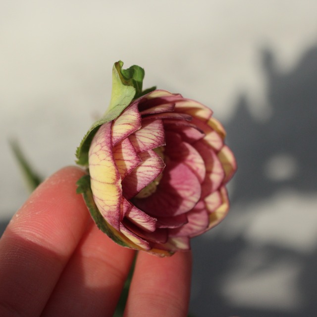 イエローの花弁に、全体をクレヨンで染めたようなピンクのかすり模様と濃く走るベインが美しい。つぼみ付き。(1/31撮影)