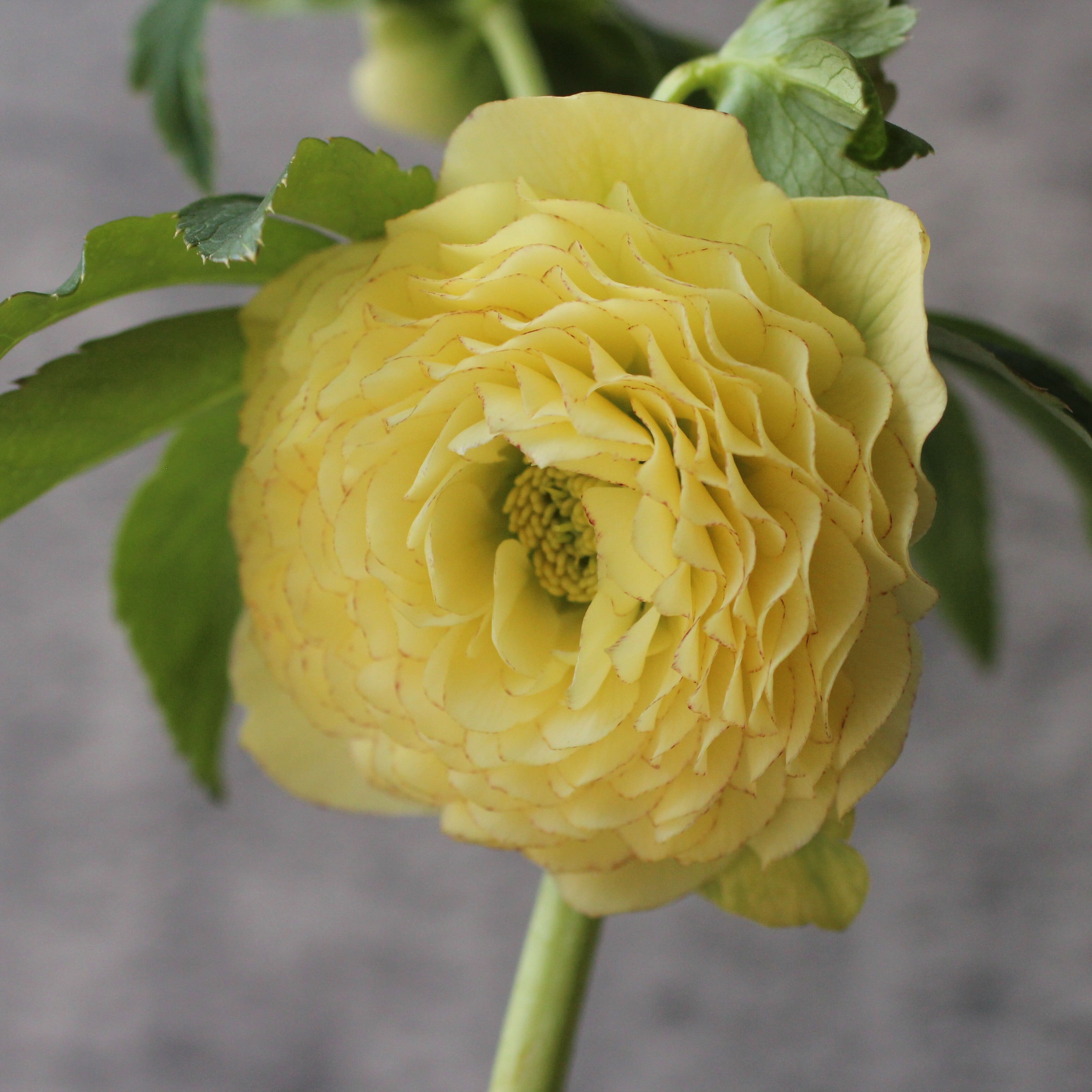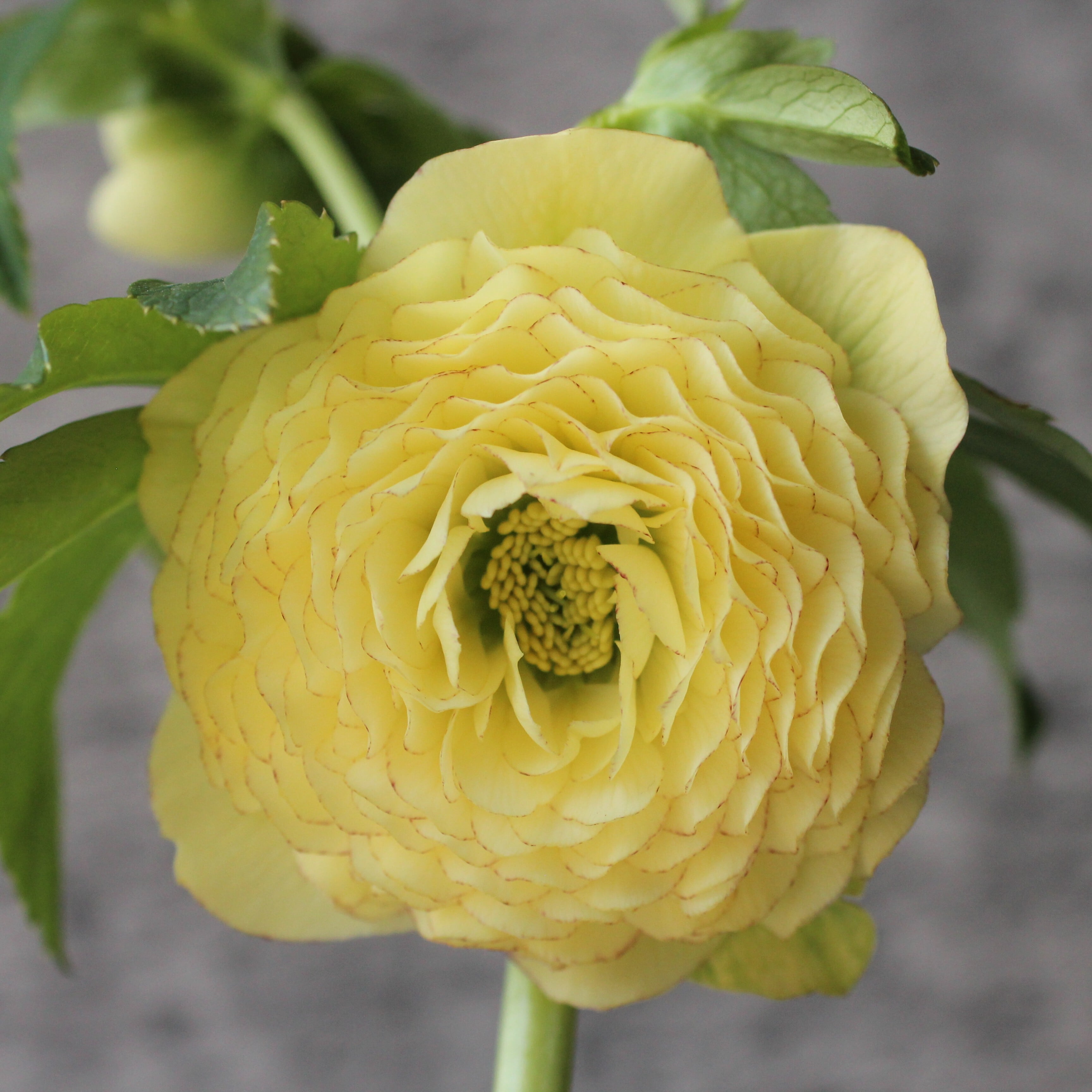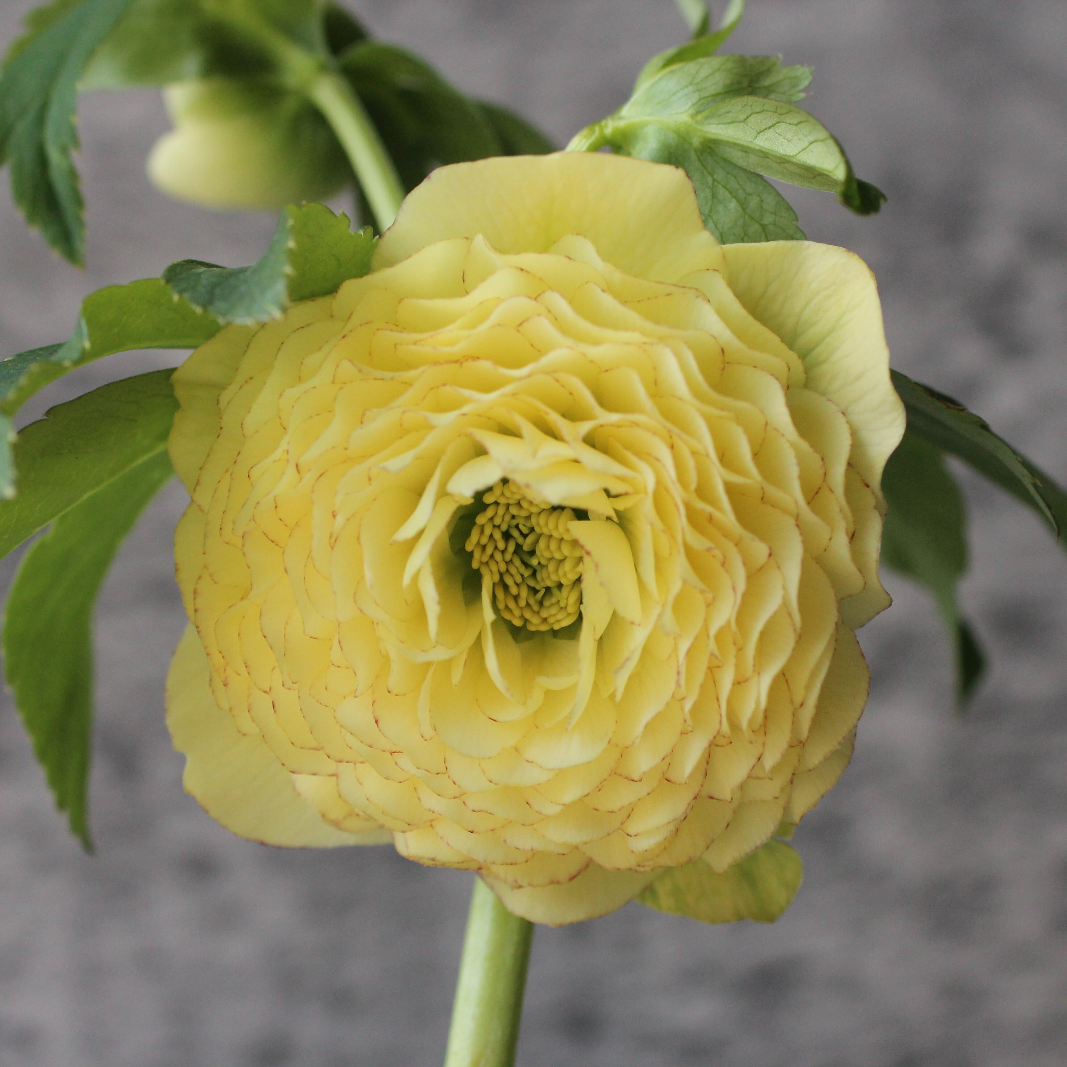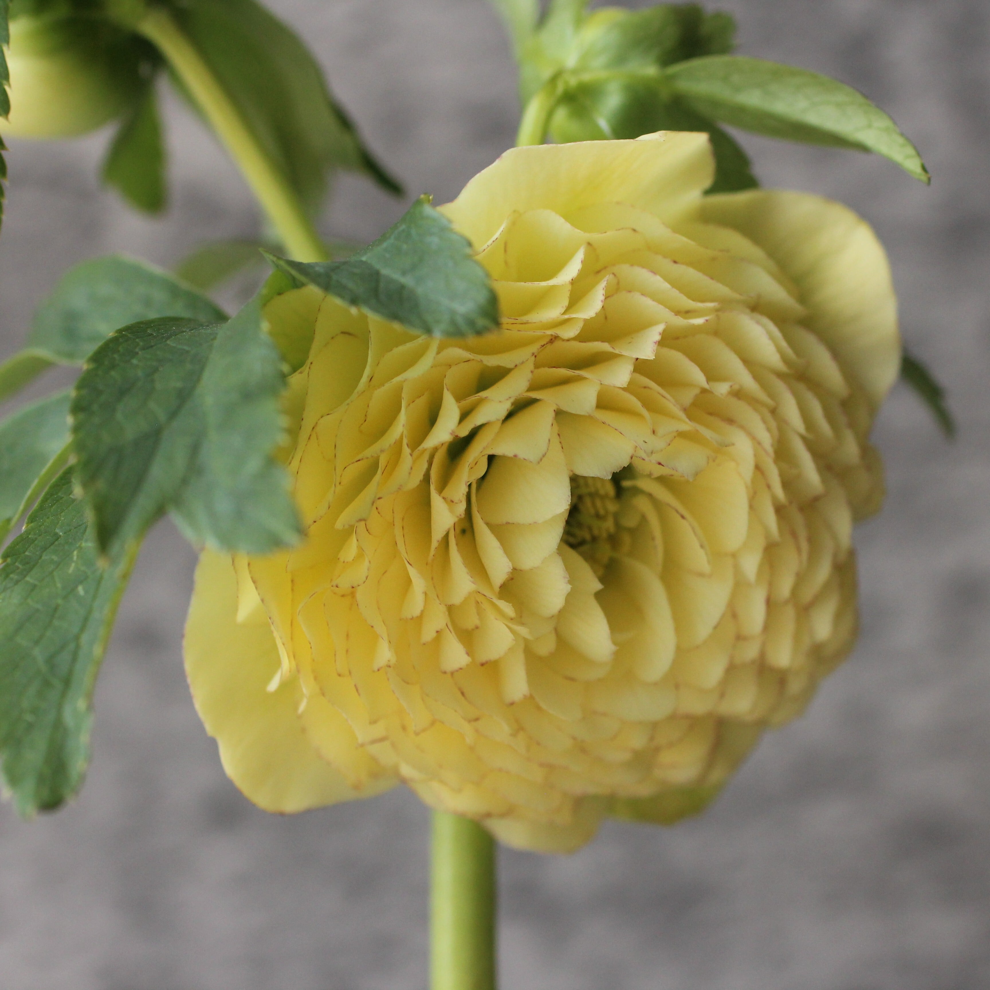 波打つクリームイエローの花弁は幾重にも重なり、極細いピンクの覆輪が入ってさらに美しい。つぼみ付き。(2/18撮影)