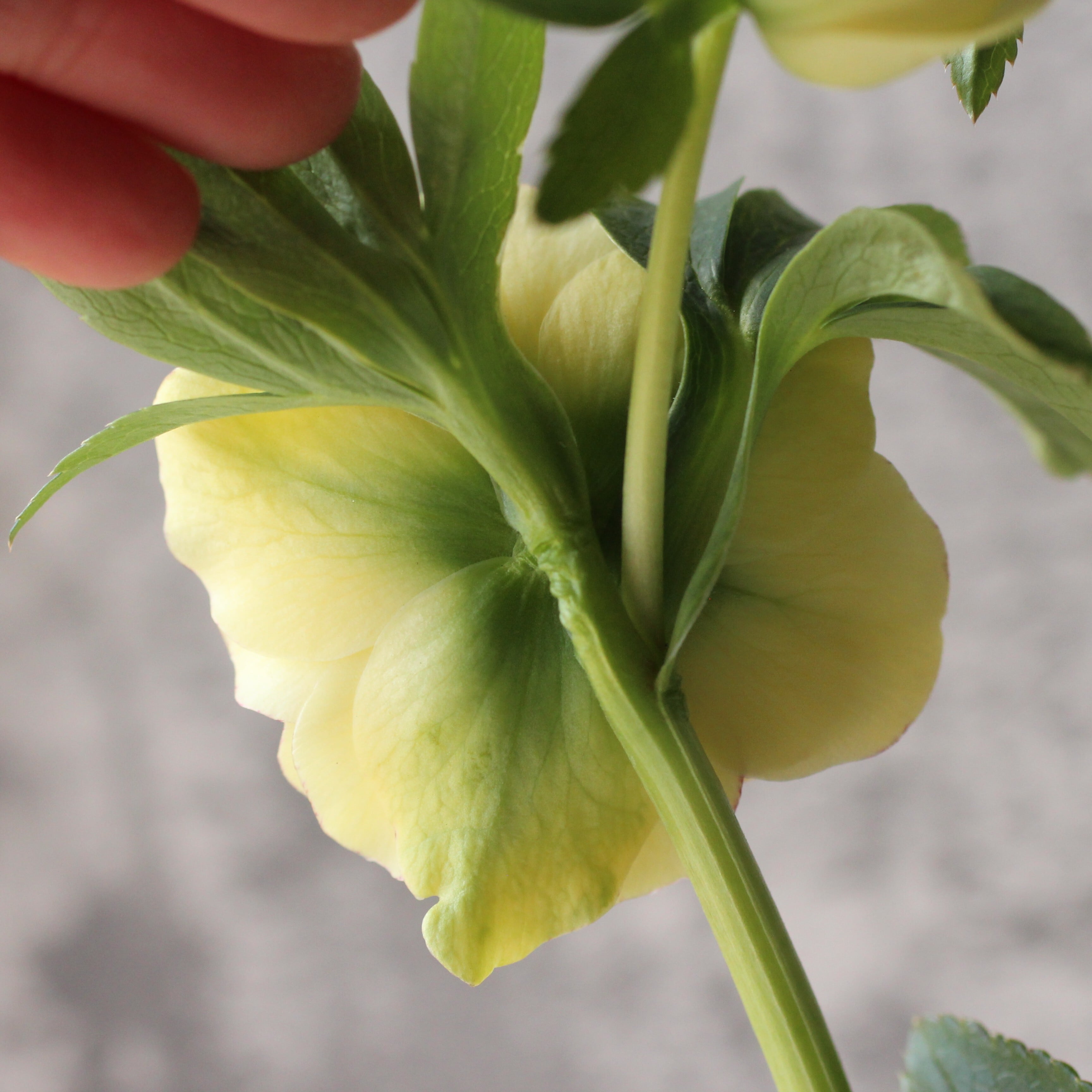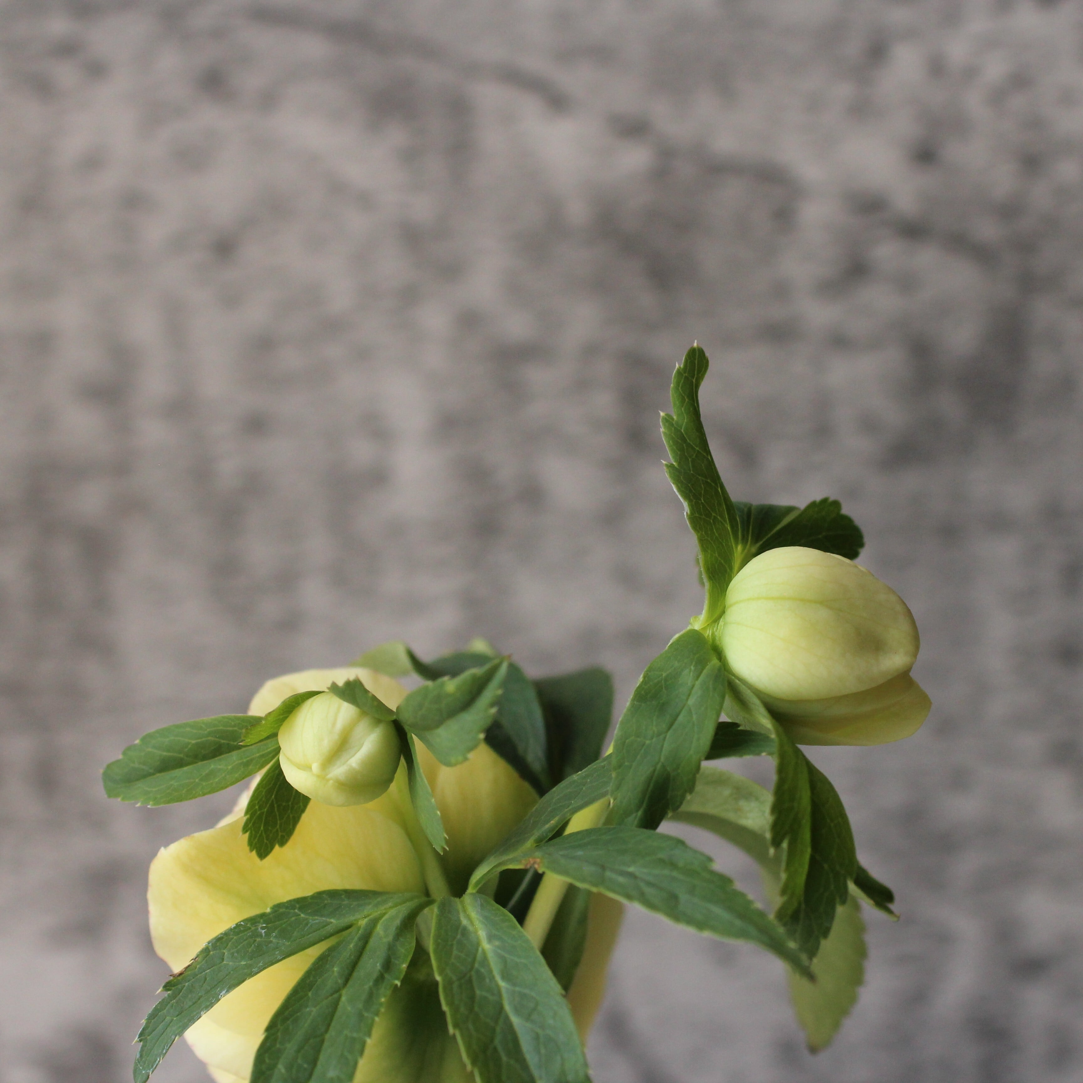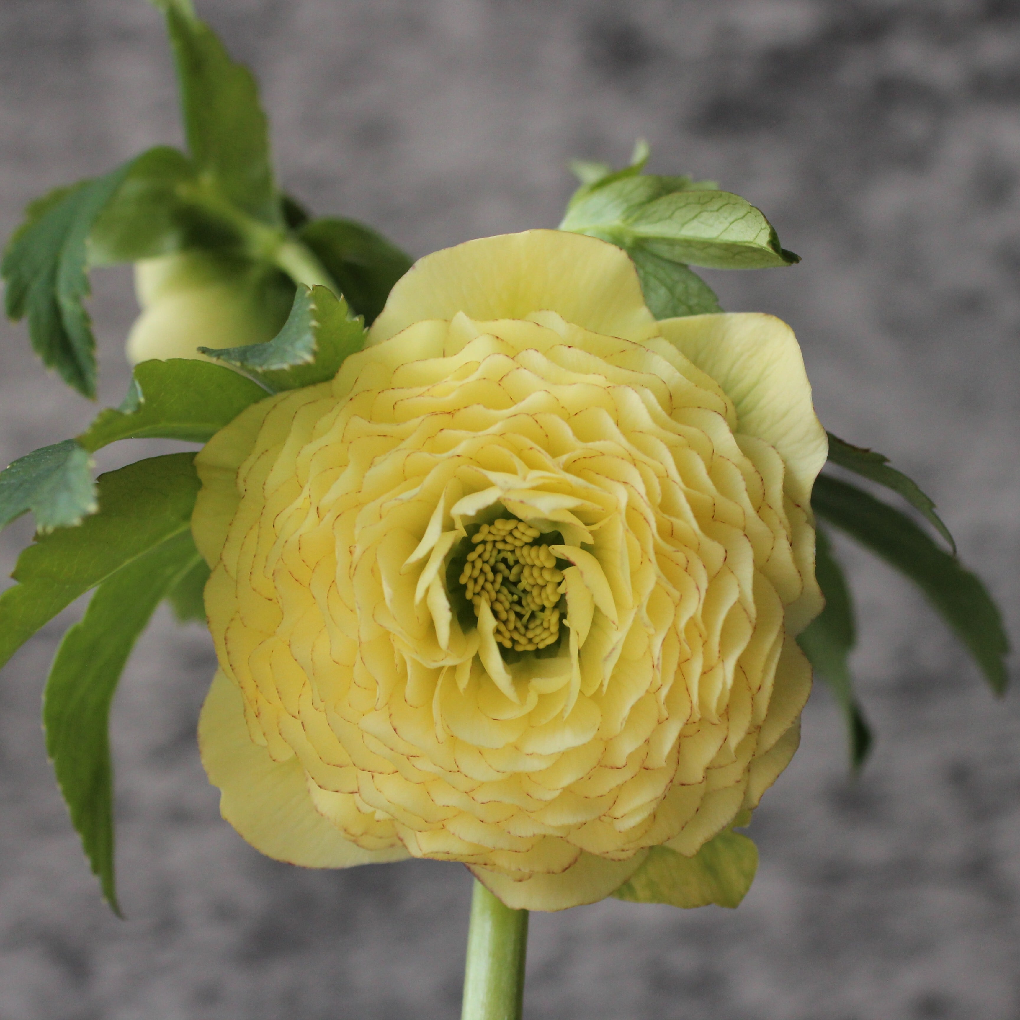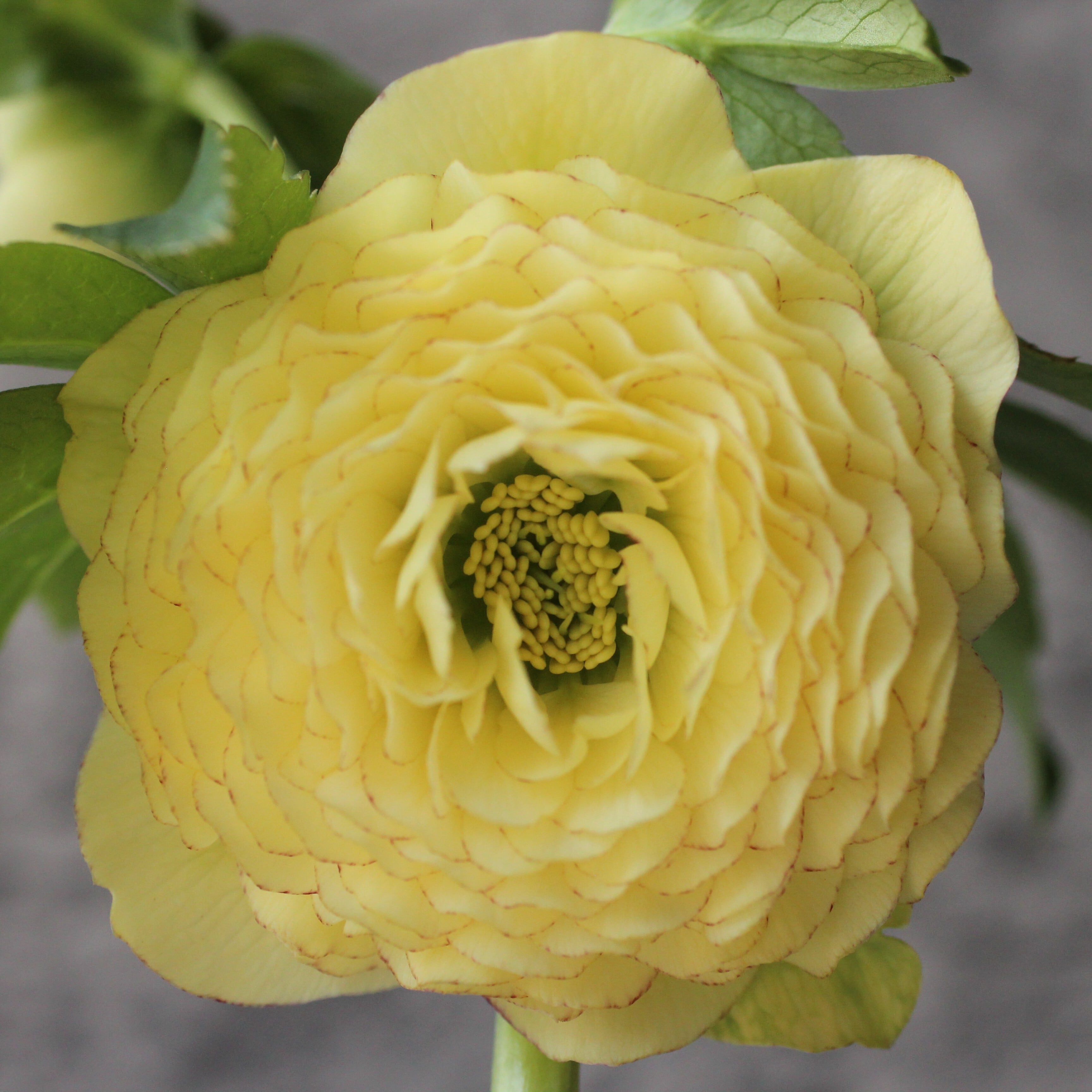 波打つクリームイエローの花弁は幾重にも重なり、極細いピンクの覆輪が入ってさらに美しい。つぼみ付き。(2/18撮影)