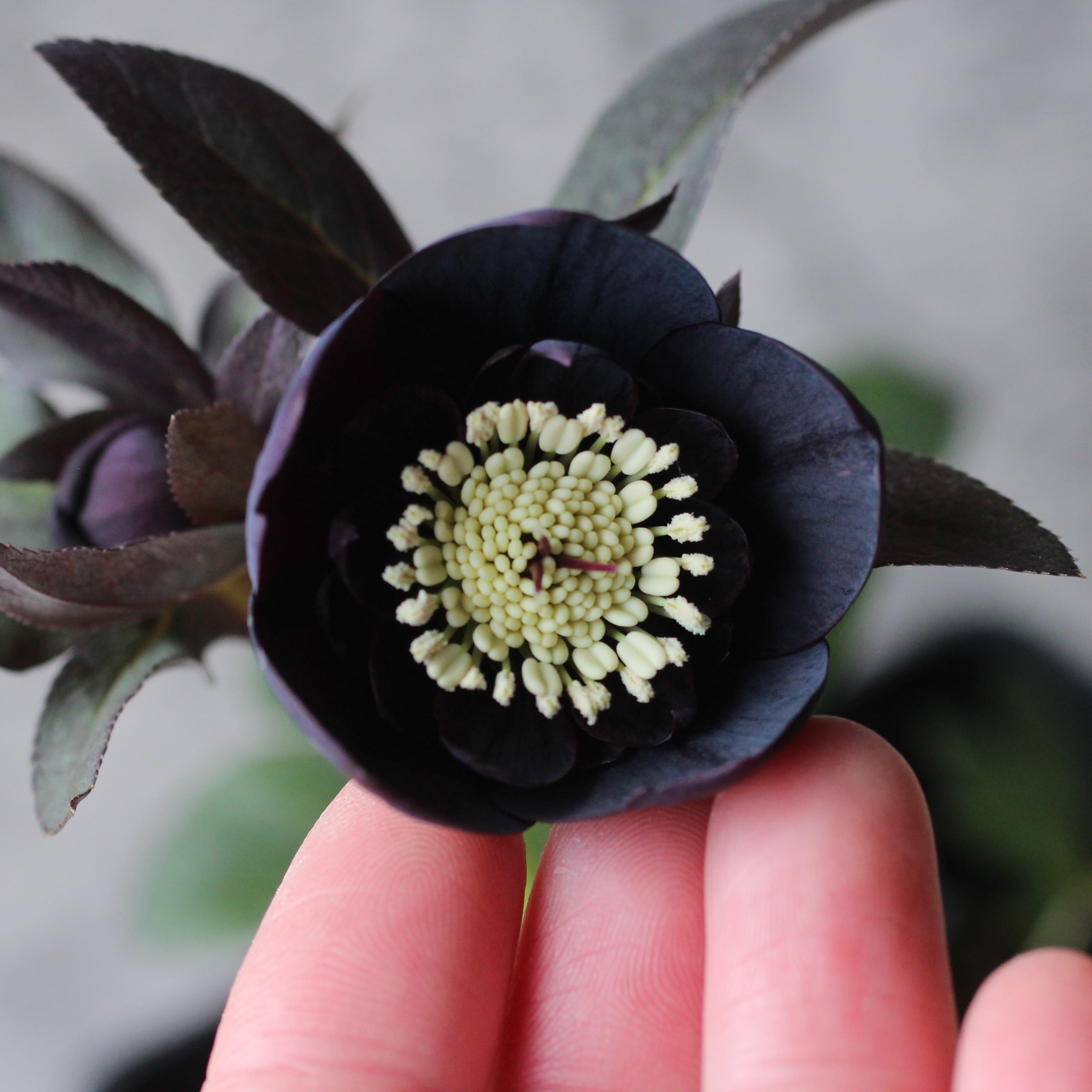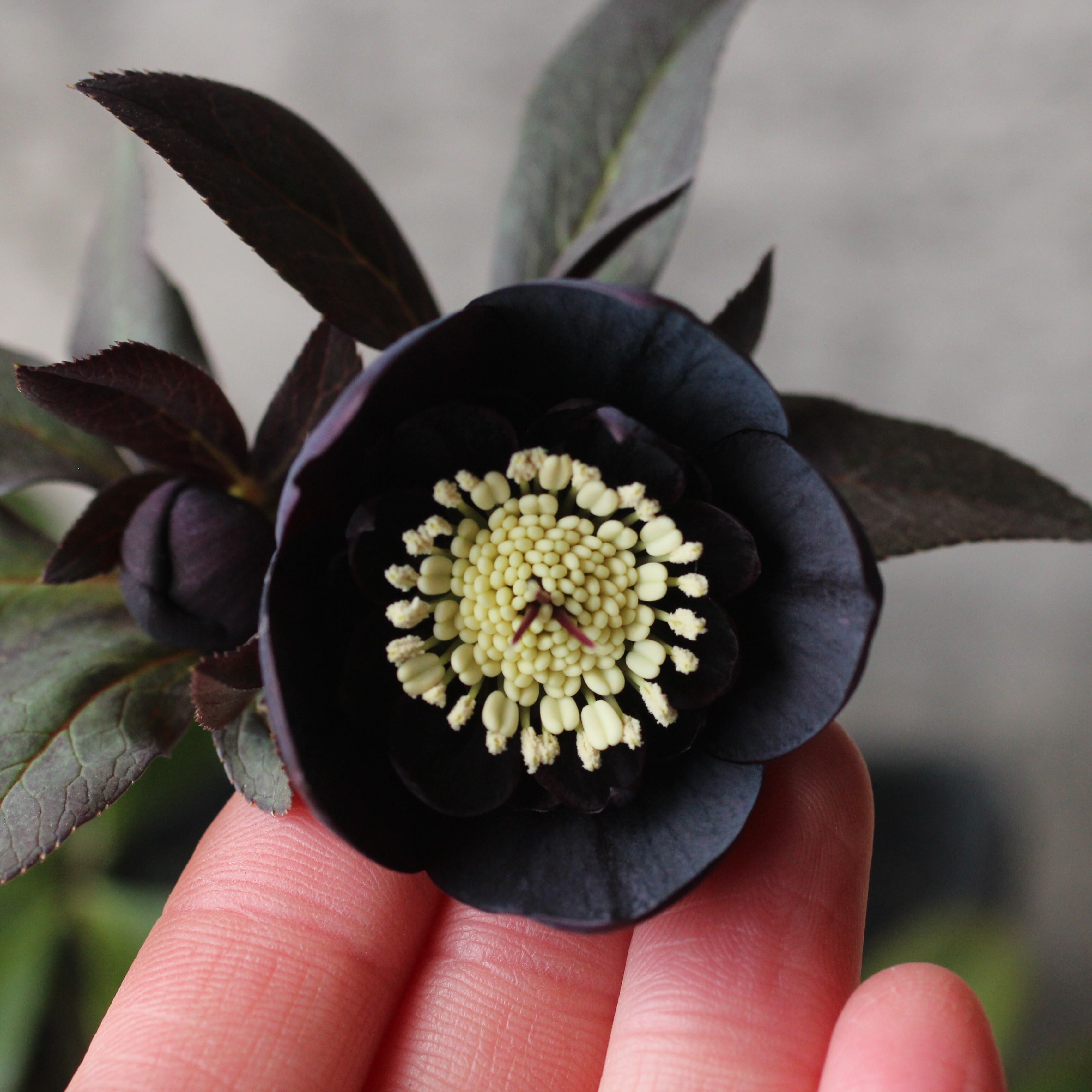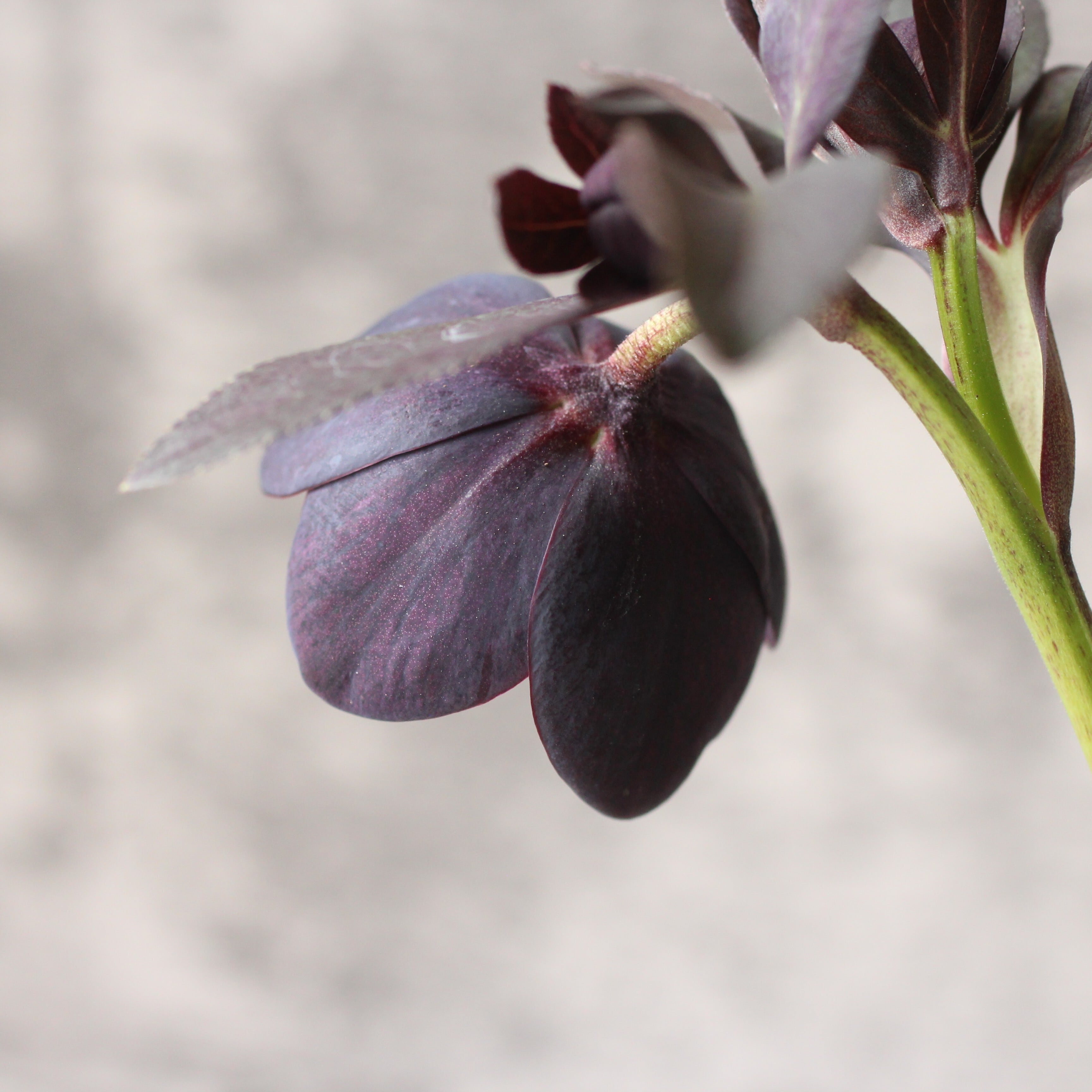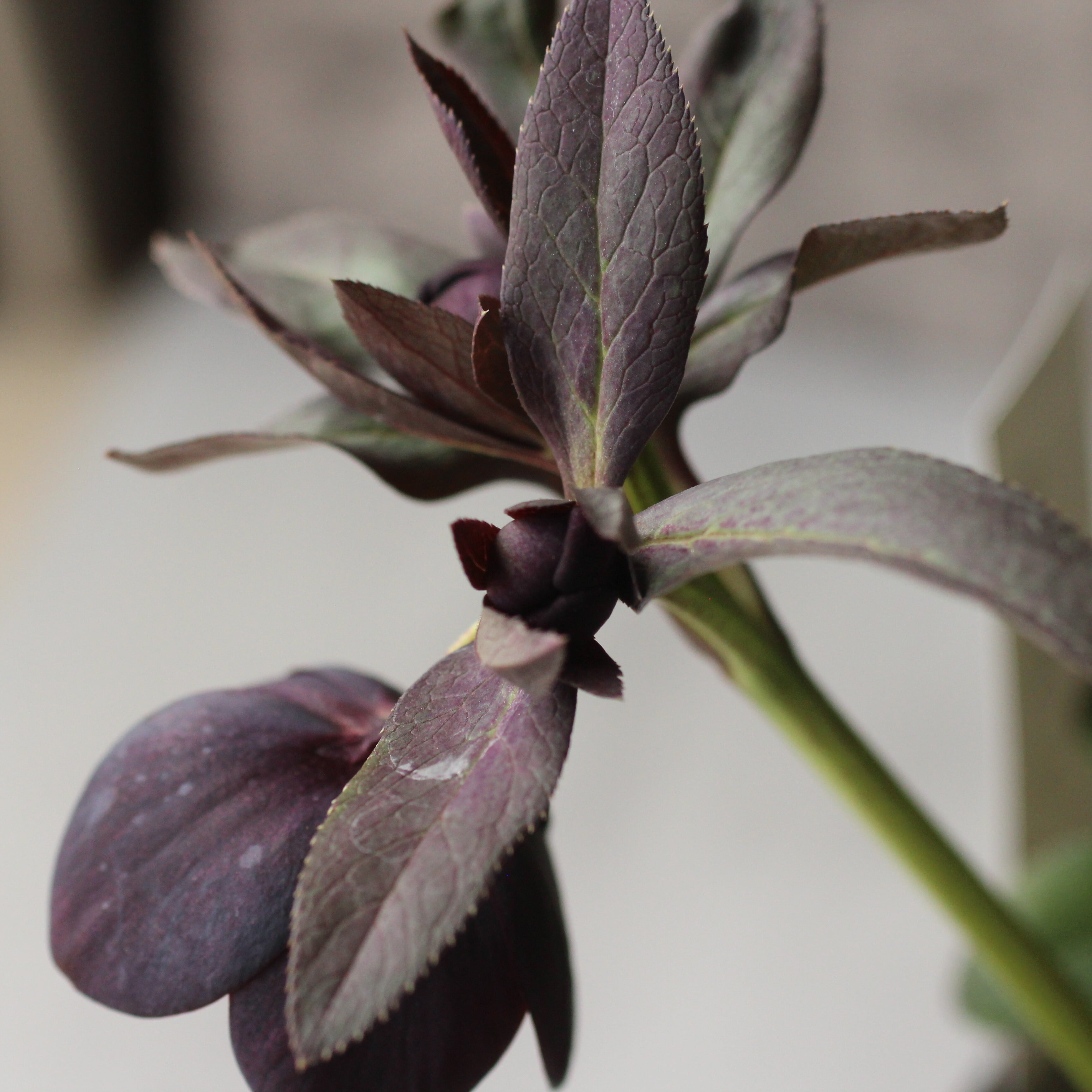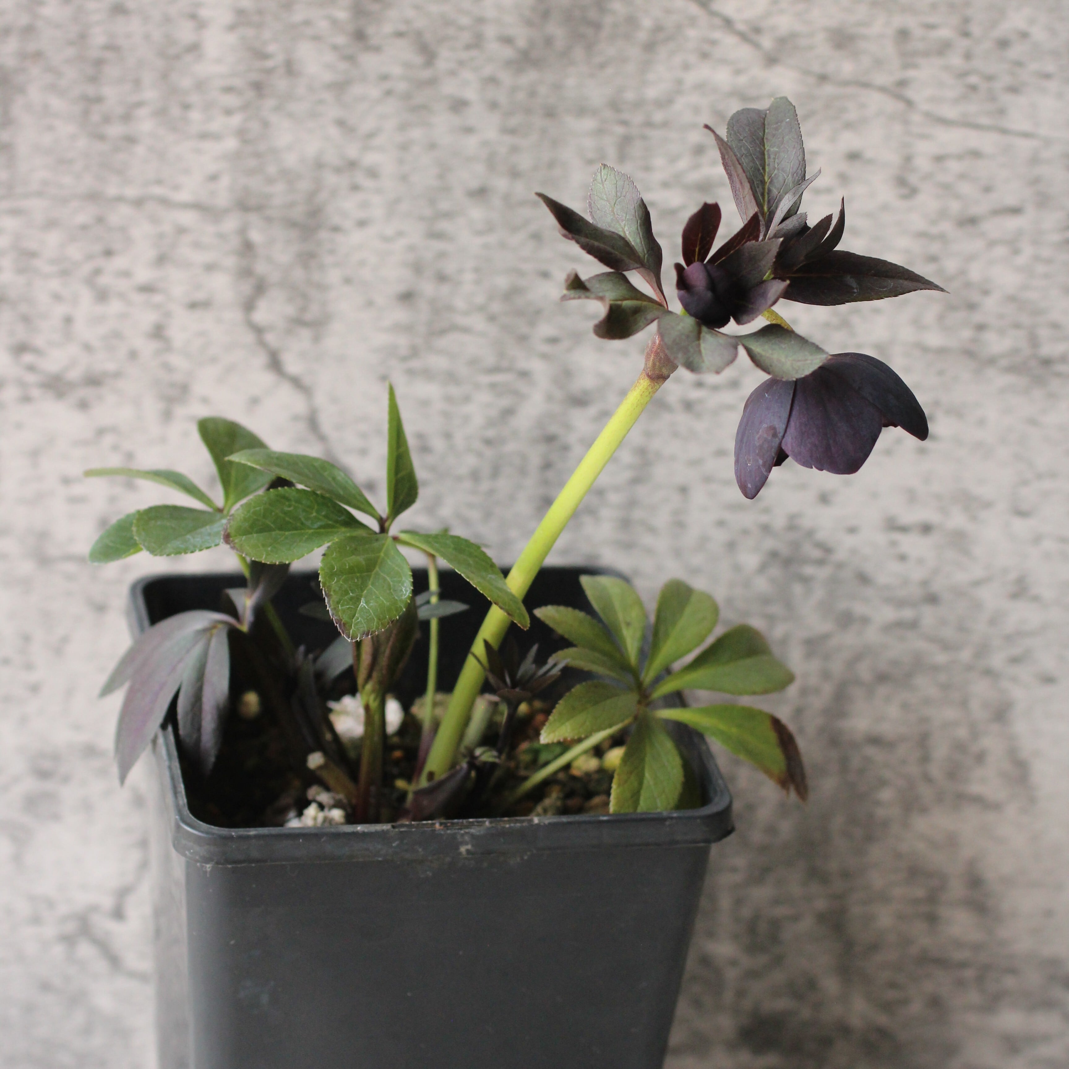 やや赤みのあるマットなブラックの花弁は小輪で、シルバーを帯びてメタリックな印象。筒状ネクタリー。つぼみ付き。(2/18撮影)