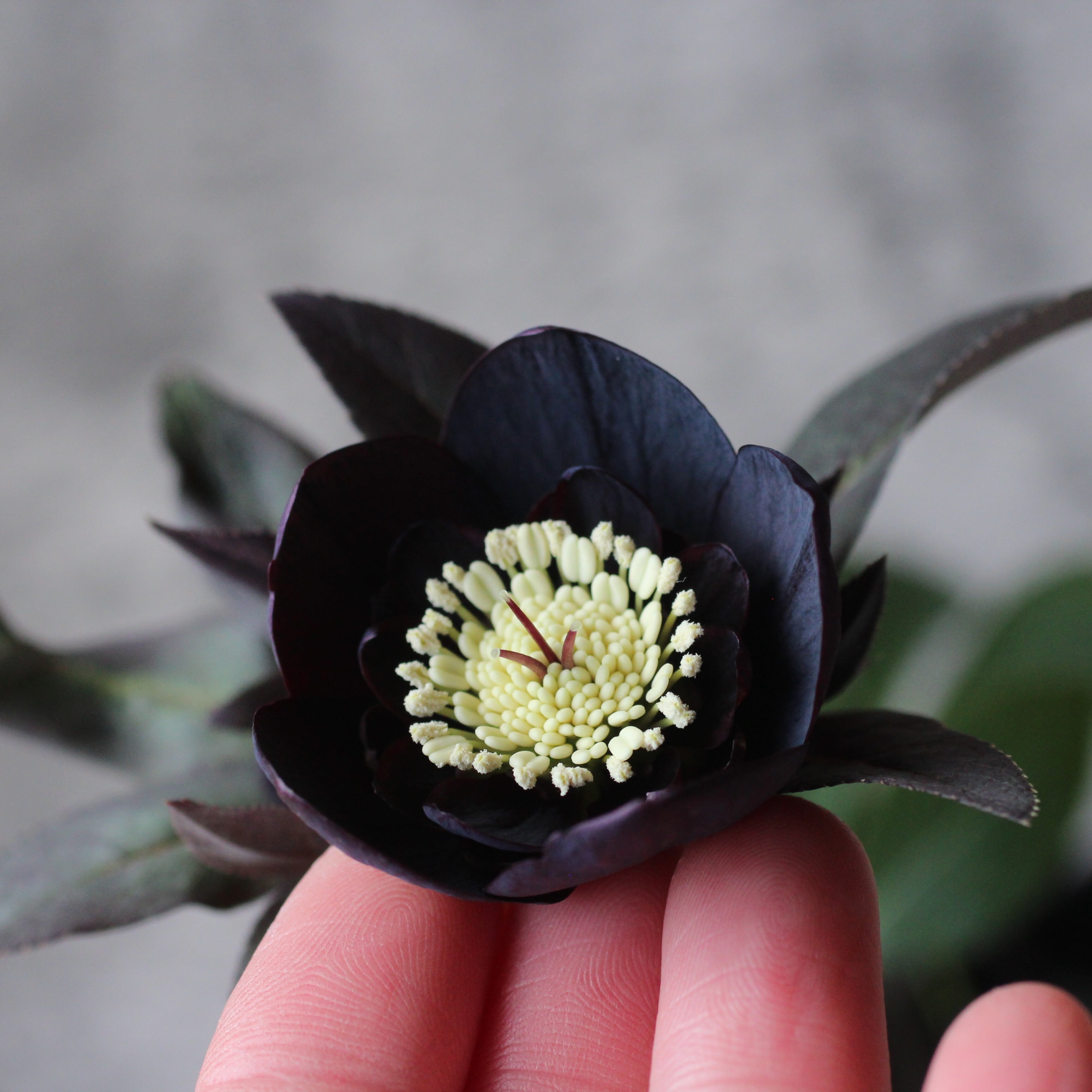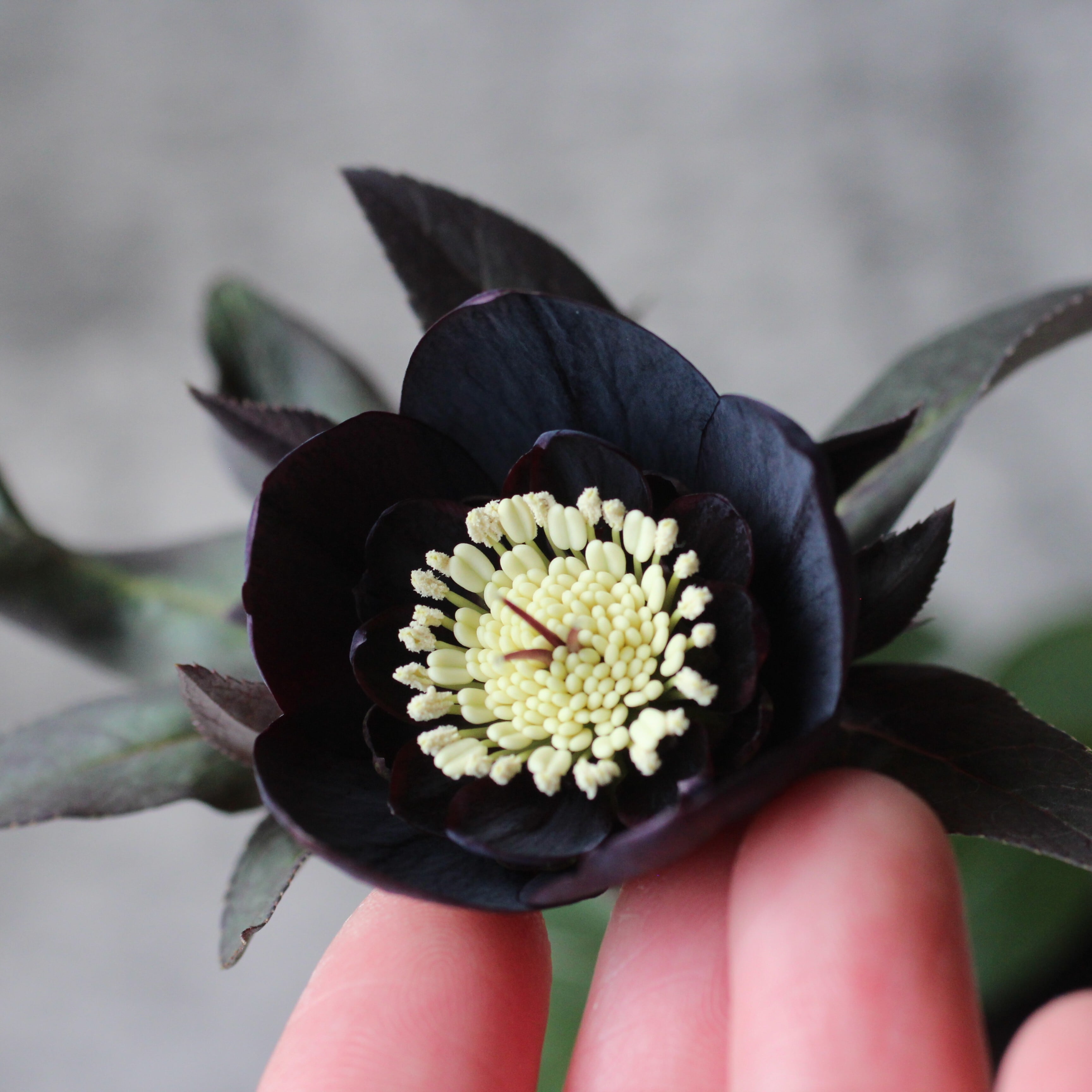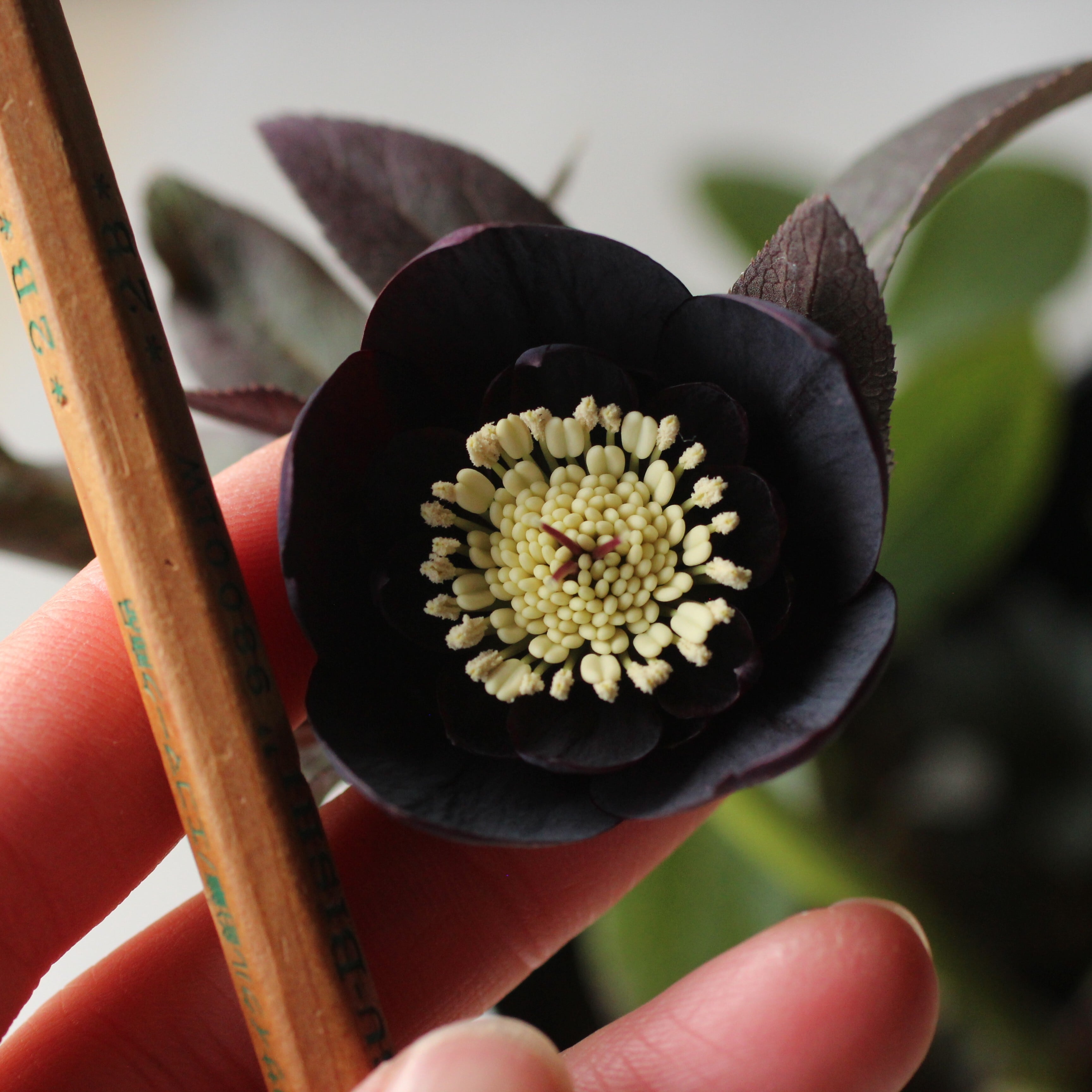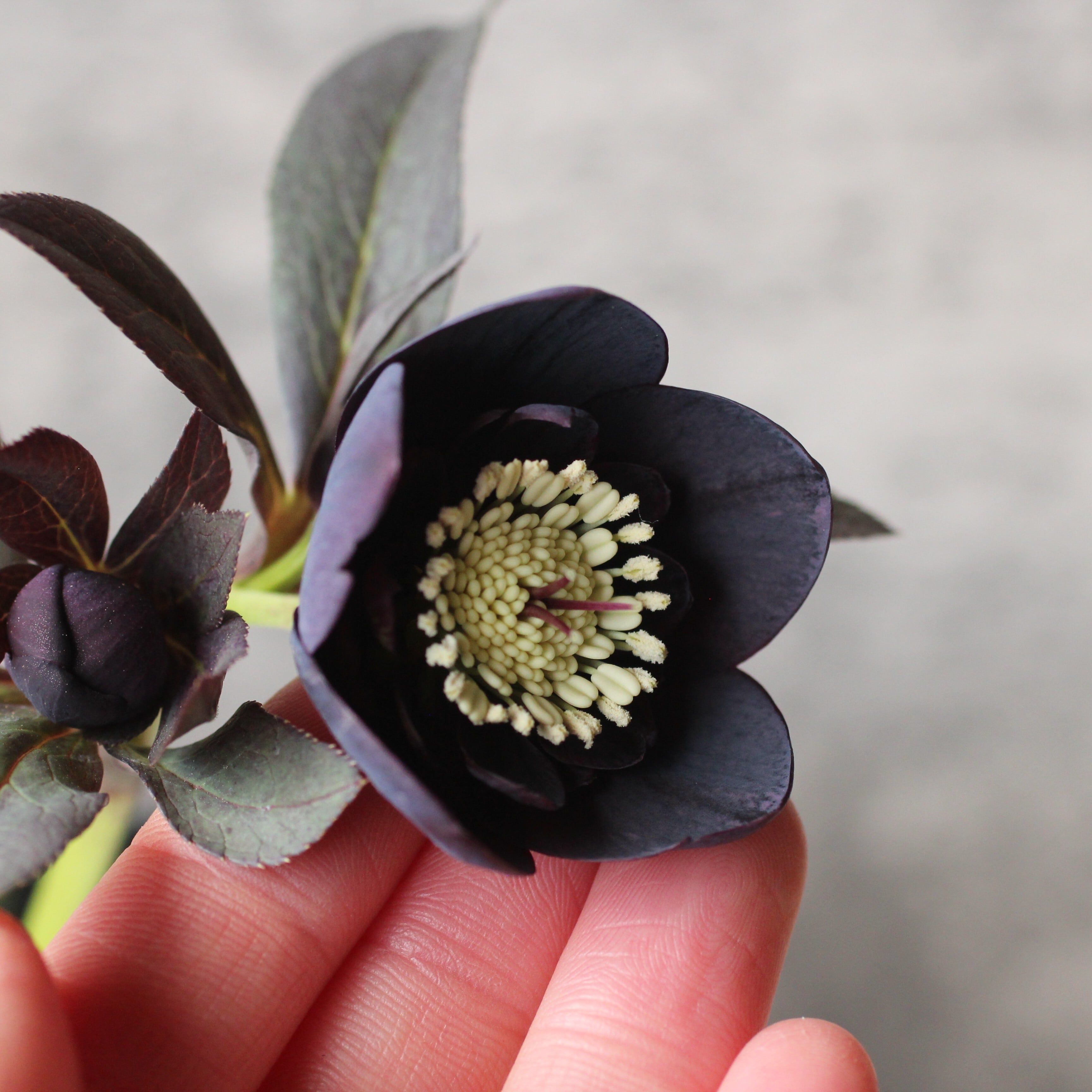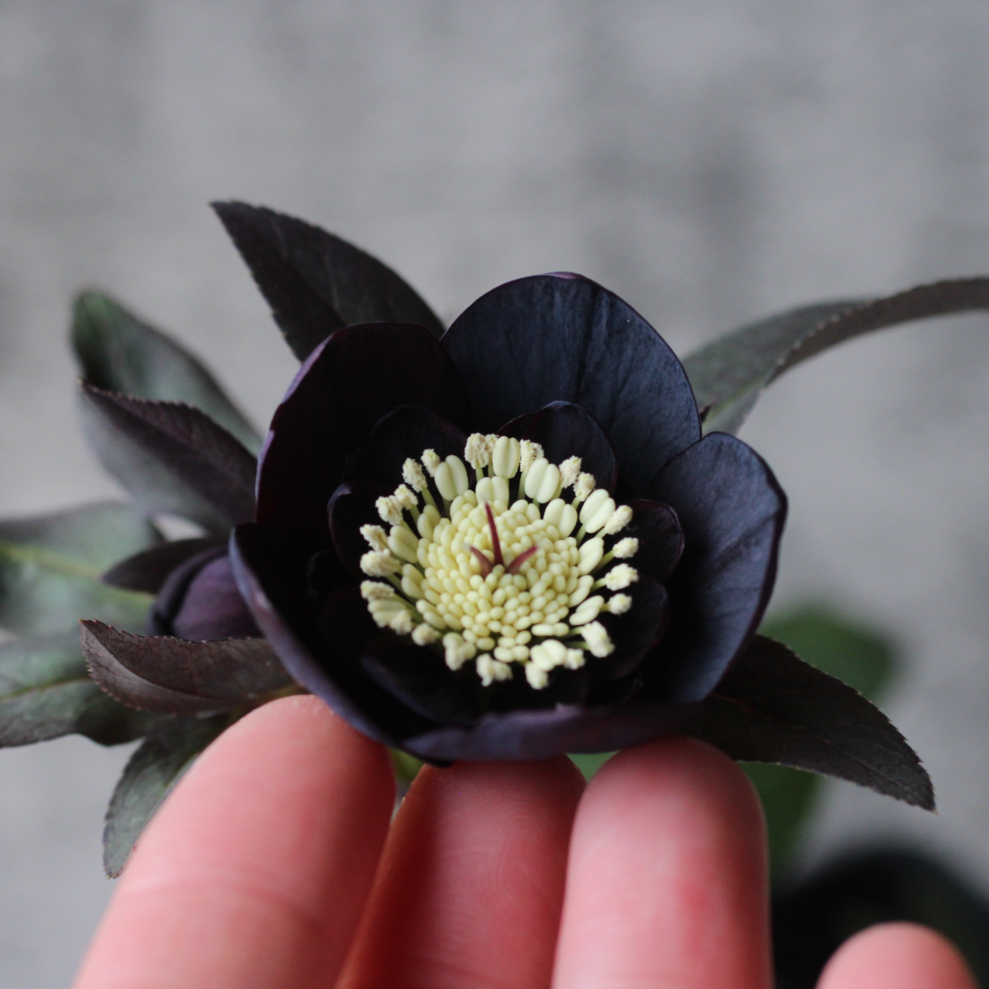 やや赤みのあるマットなブラックの花弁は小輪で、シルバーを帯びてメタリックな印象。筒状ネクタリー。つぼみ付き。(2/18撮影)