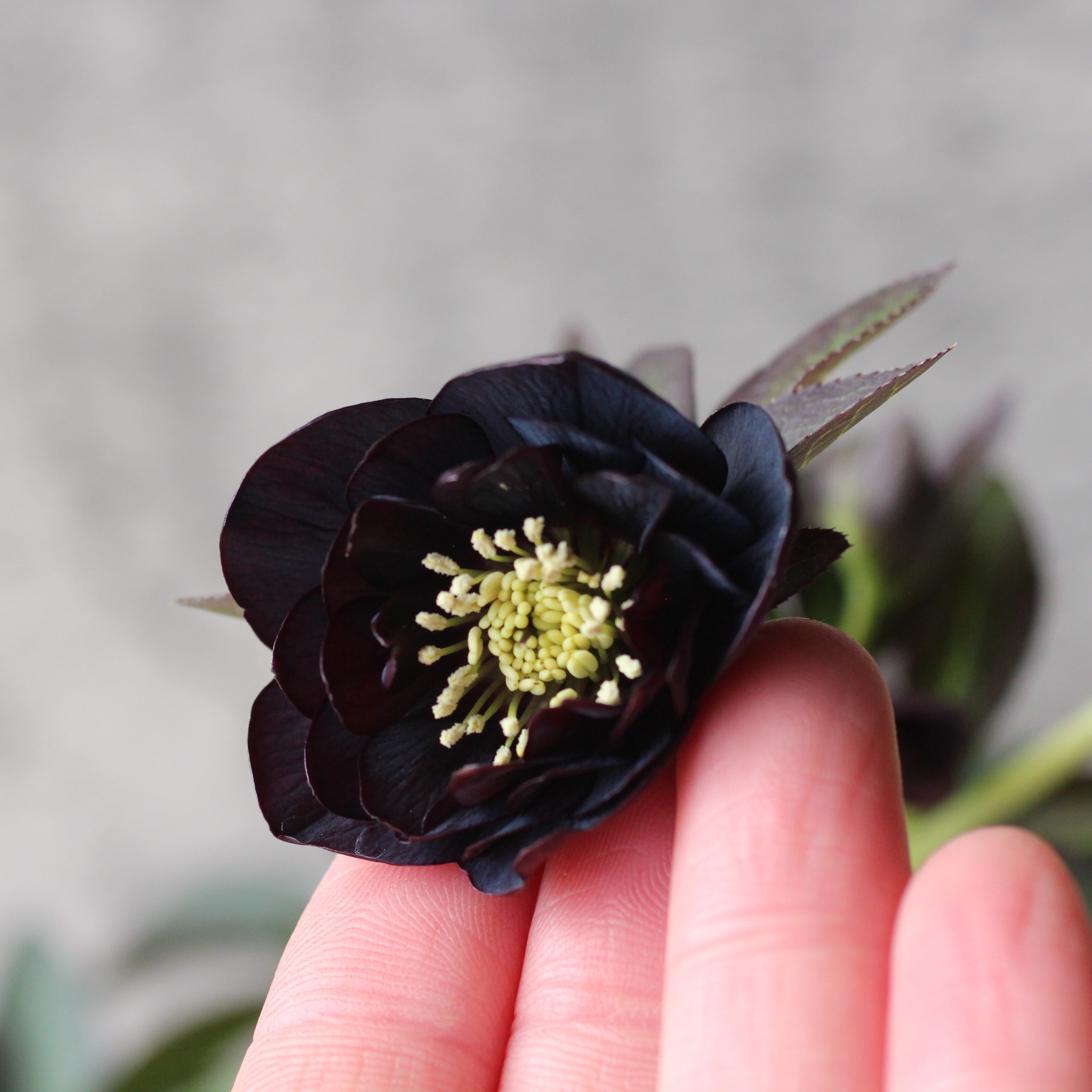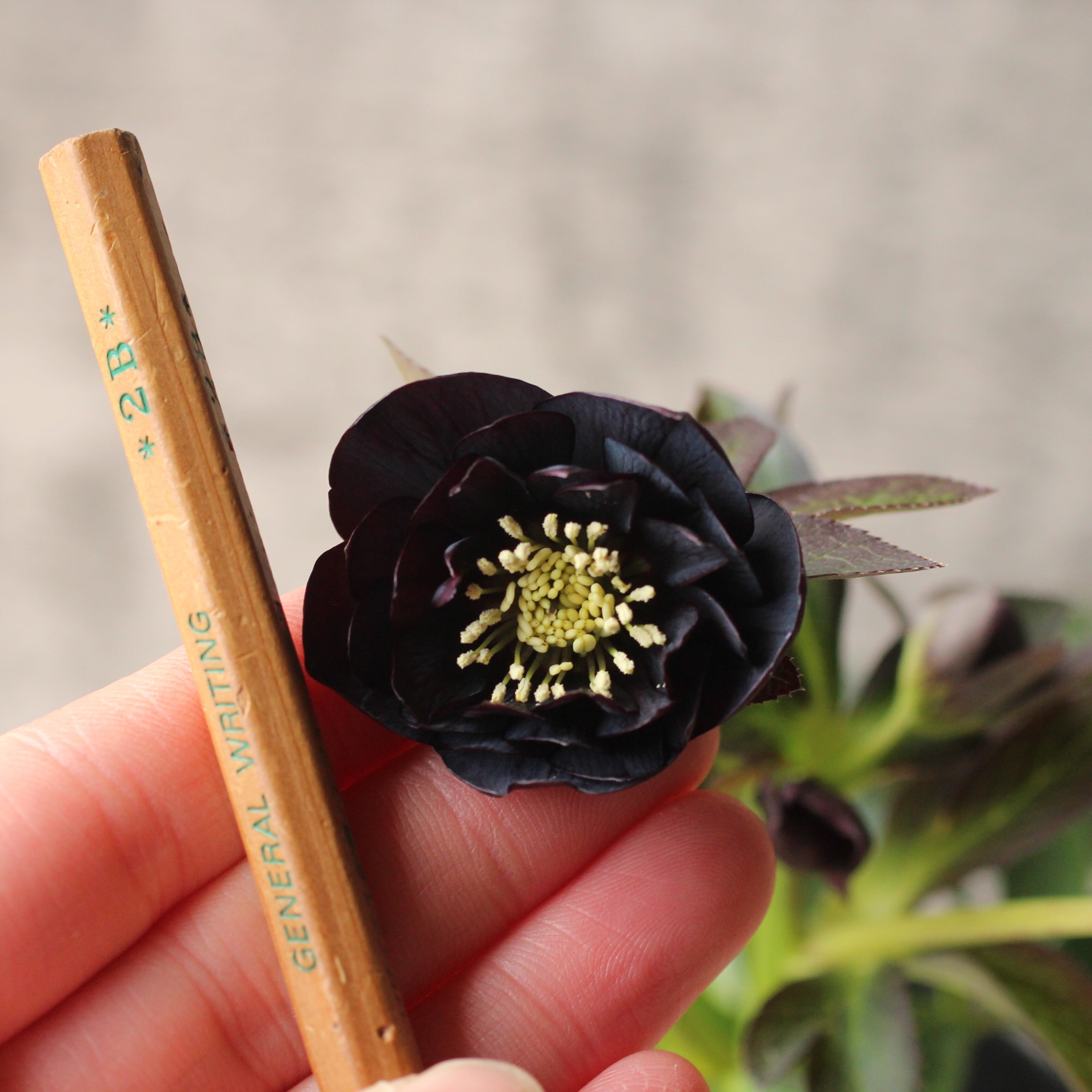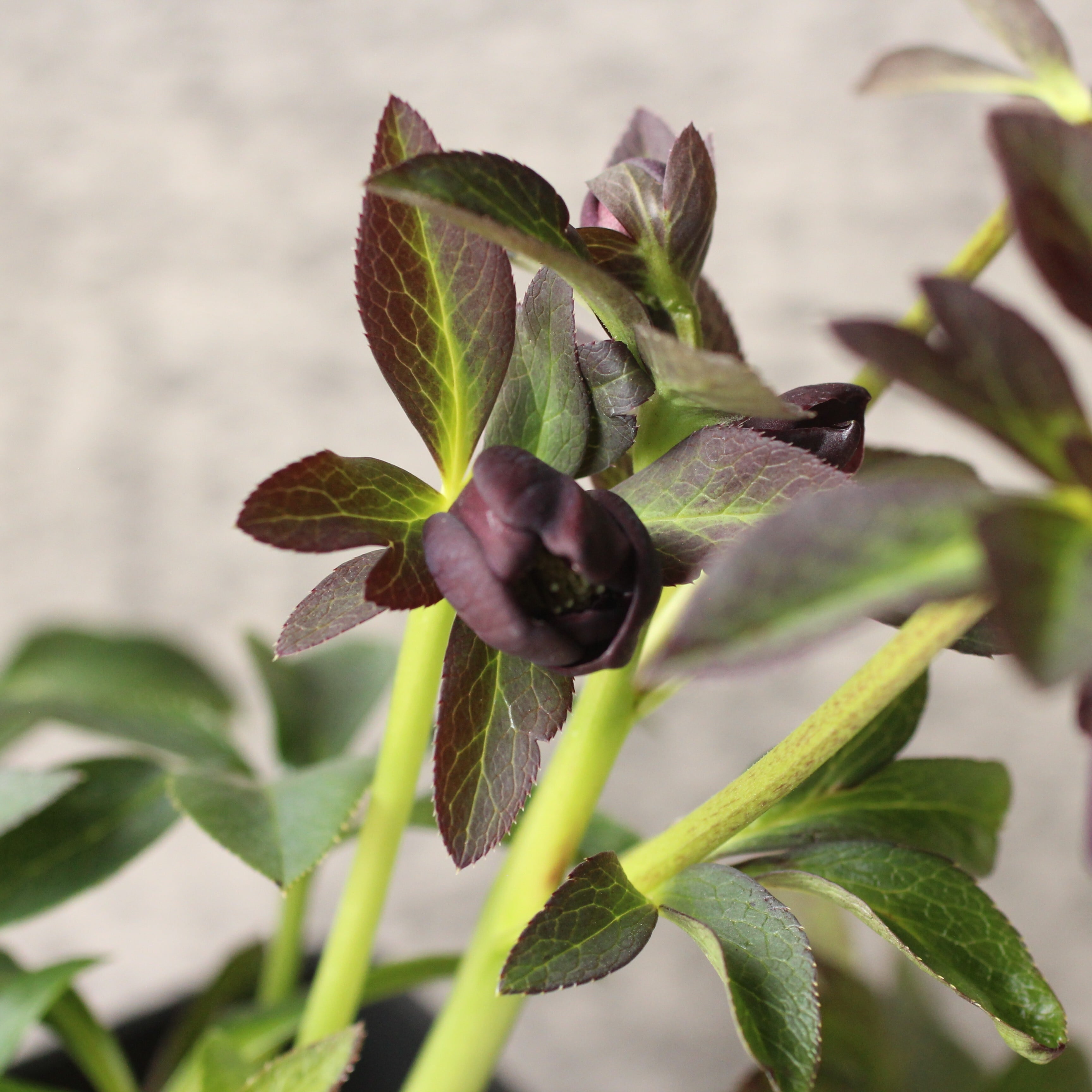 やや赤みのあるマットなブラックの花弁は極小輪で、シルバーを帯びてメタリックな印象。柔らかな質感の花弁が魅力。つぼみ付き。(2/18撮影)