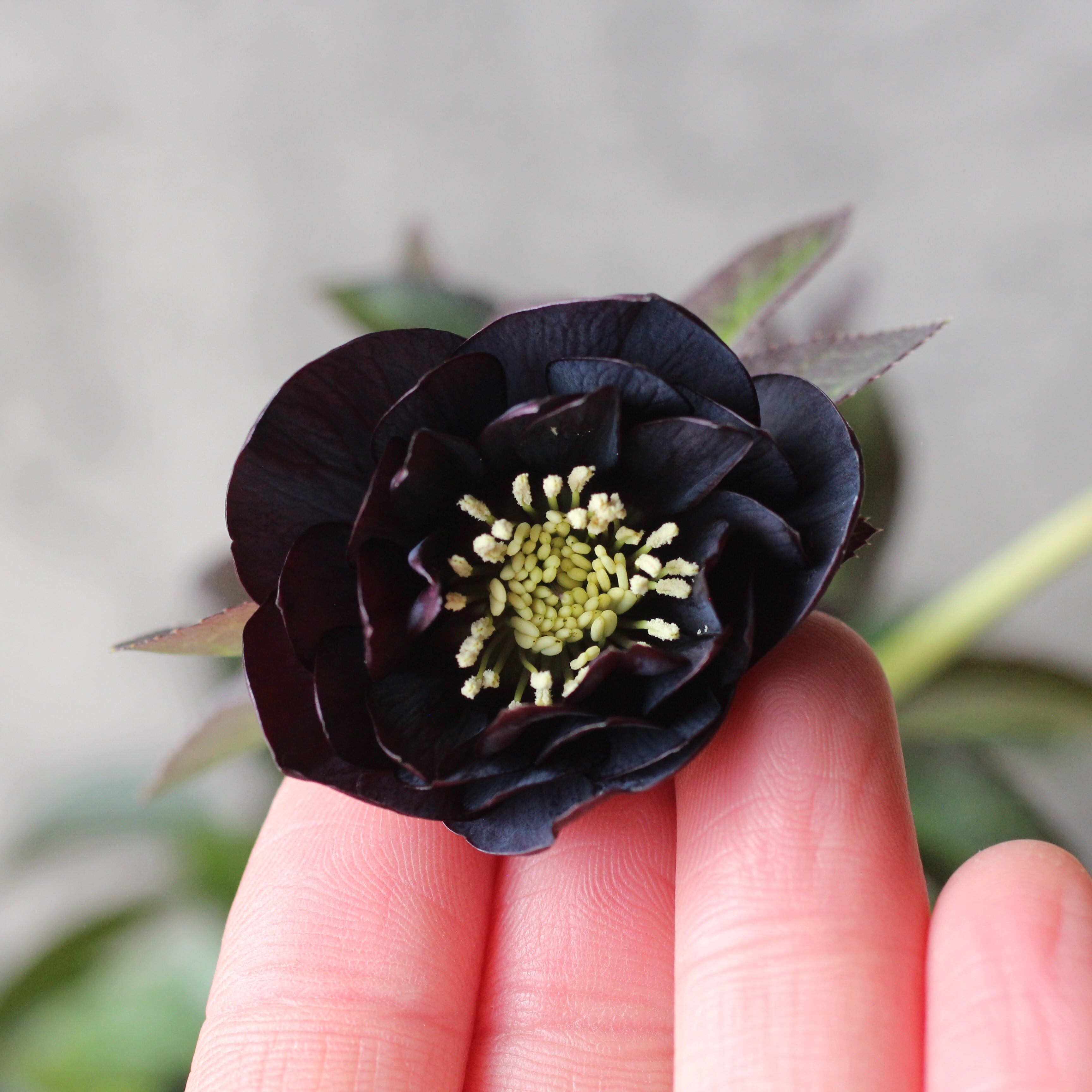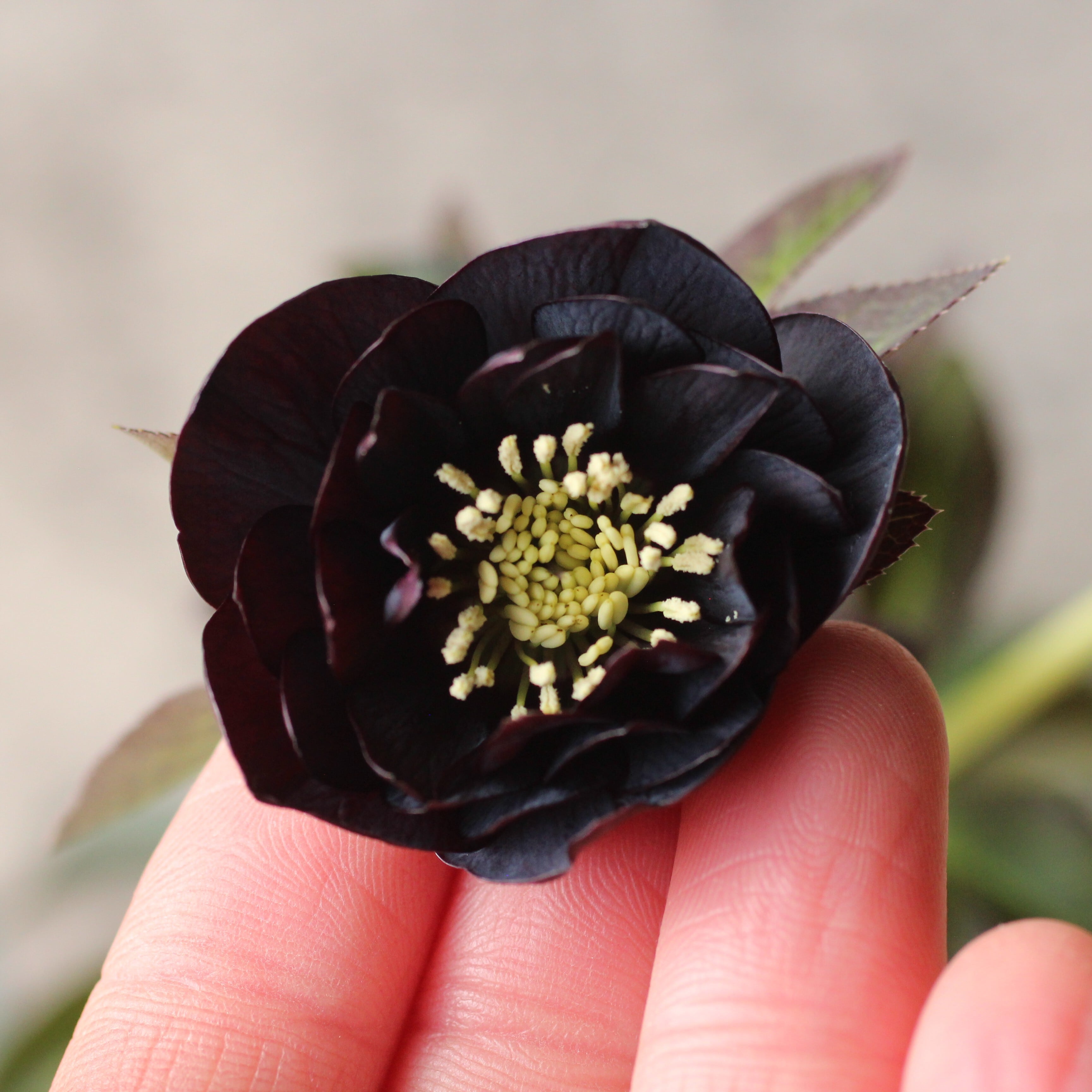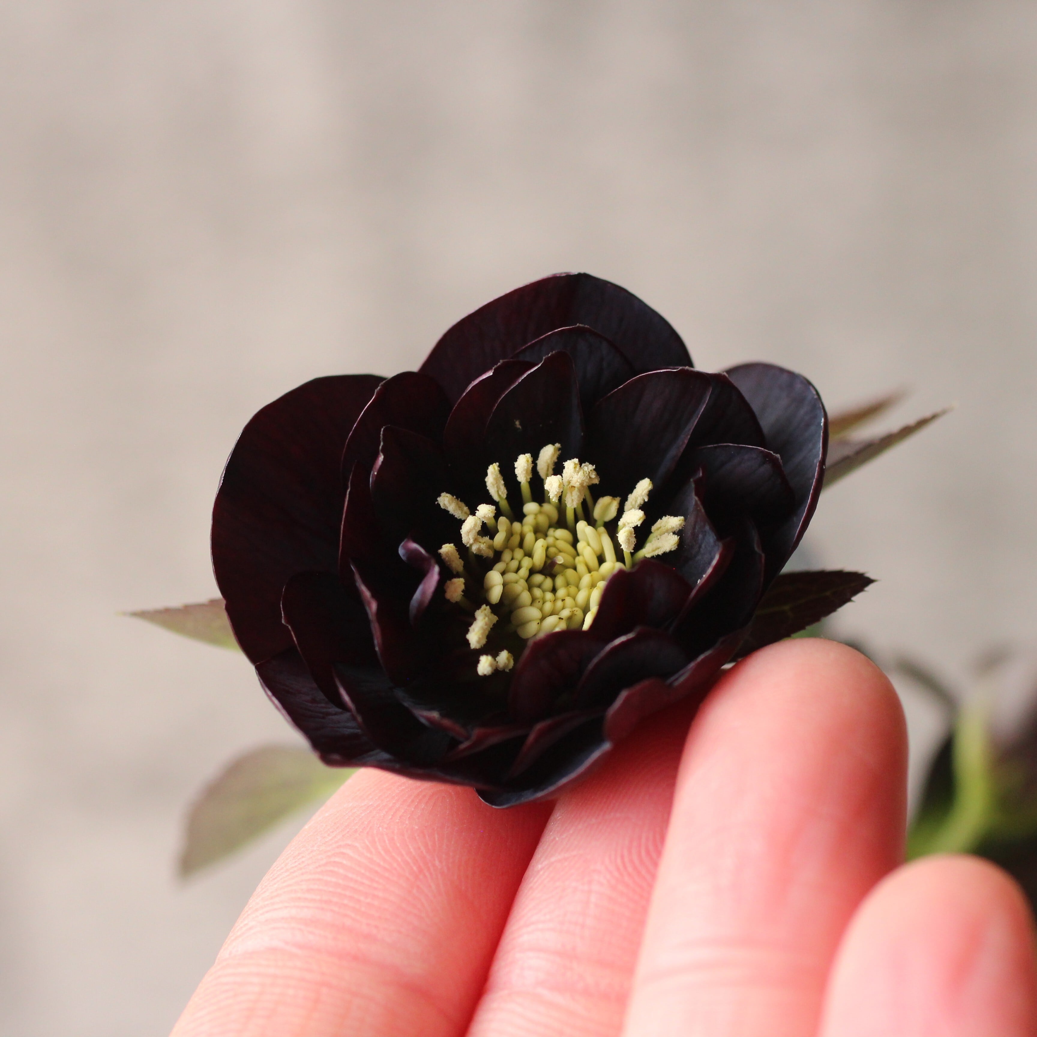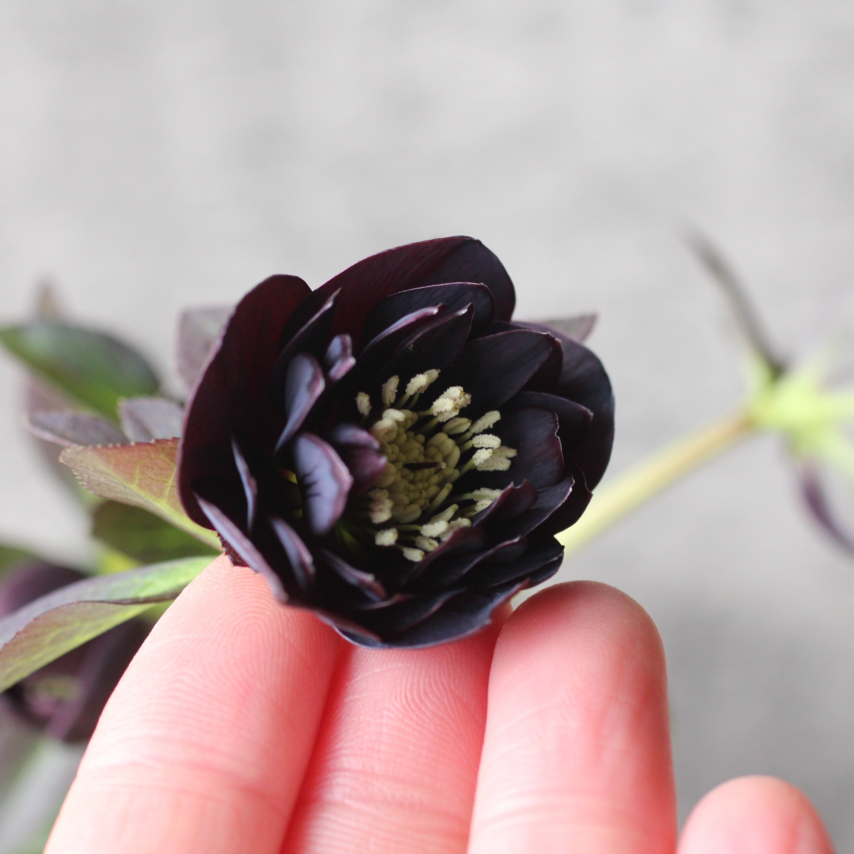 やや赤みのあるマットなブラックの花弁は極小輪で、シルバーを帯びてメタリックな印象。柔らかな質感の花弁が魅力。つぼみ付き。(2/18撮影)