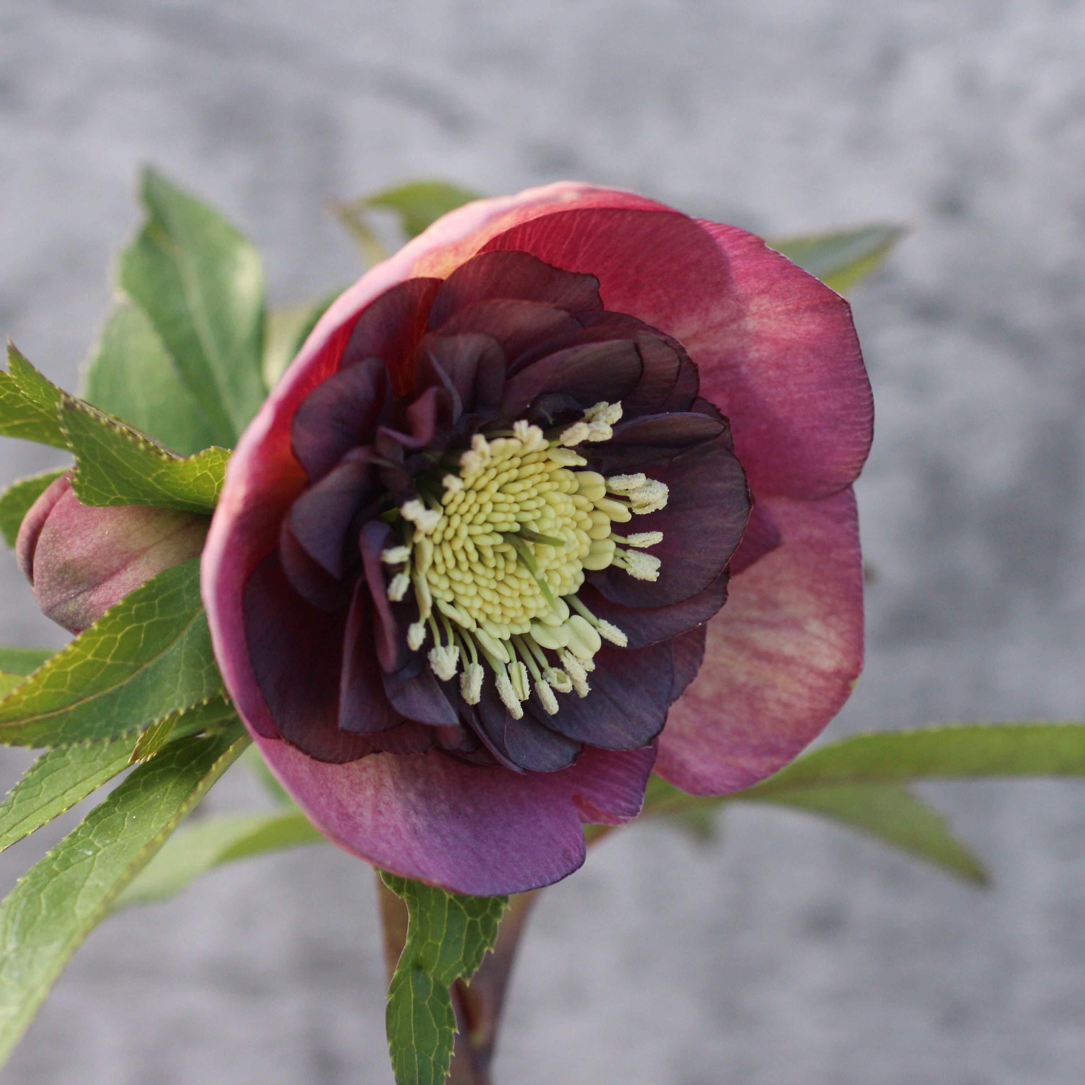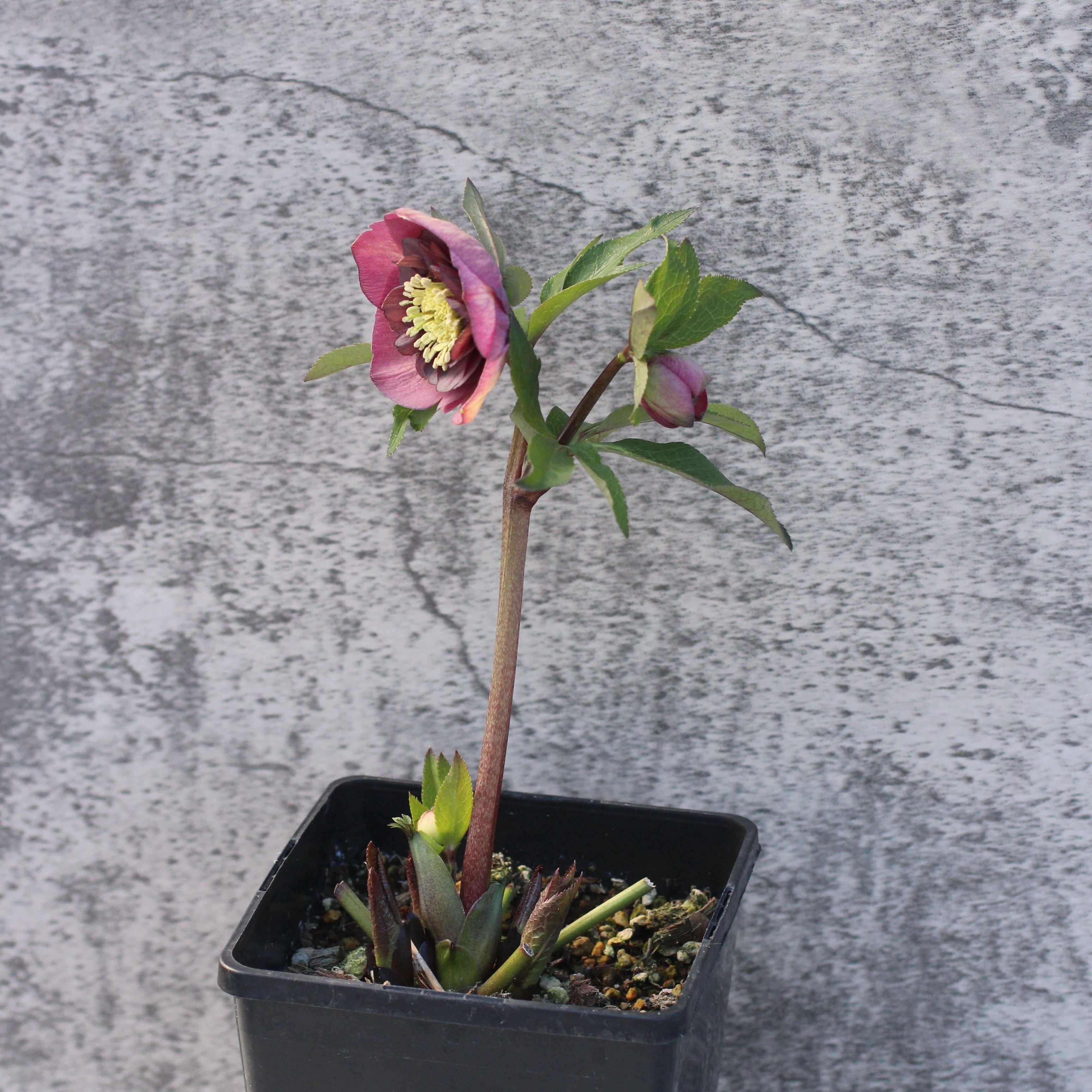 珍しいくすみパープルの筒状ネクタリーがアンティークな雰囲気を醸し出すセミダブル。淑女のドレスのように淑やかで気品がある。つぼみ付き。(2/20撮影)