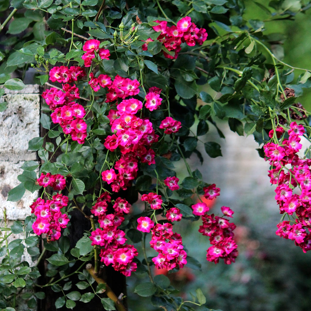 紅色に白目が入る色彩でインパクトがあり、人目を惹きつける。浅いカップ状の一重咲きで、花は大きな房になって開花し花付きがとても良い。花持ちが良く、春以降も時々返り咲く。枝は細くしなやかで、トゲが少なく扱いやすい品種。誘引がとてもしやすく、伸長力があるので、壁面やパーゴラには最適。樹勢が強く、耐病性もあり、初心者にも向く。