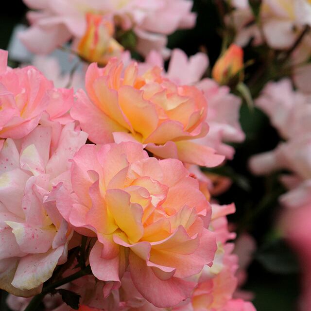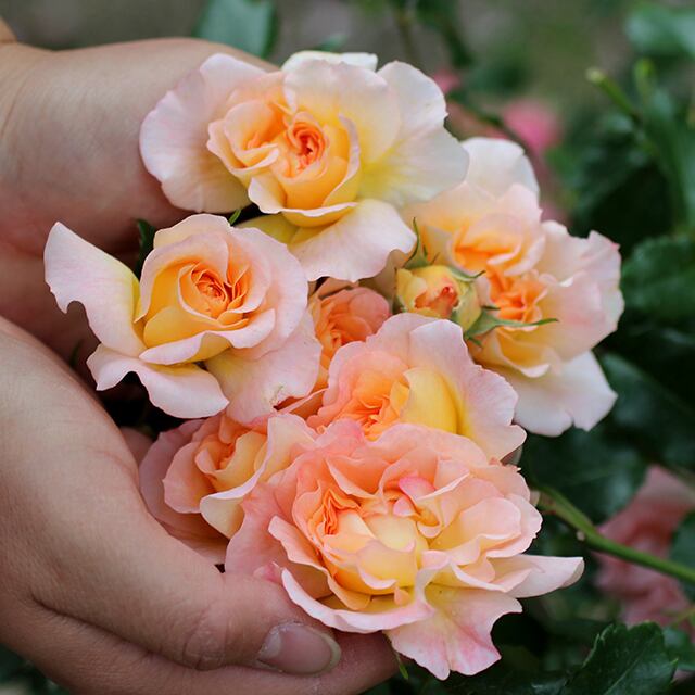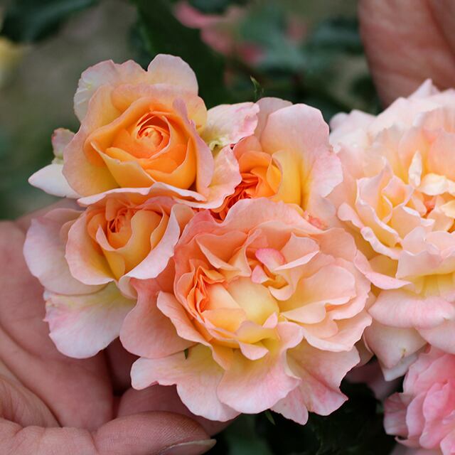 オレンジ・ピンクの花は、開花とともにアプリコット色に変化し、波を打つ花弁が印象的な品種。数輪から大きめの房になり、花付きが良く、春以降も次々と開花する。横張り性で、しなやかな枝は広がるように伸び、他の植物との混植にも向く。耐病性に優れ、初心者向き。第7回ぎふ国際ローズコンテスト銀賞受賞の品種であり、同時に世界バラ会連合(WFRS)賞・財団法人日本ばら会(JRS)賞を受賞。