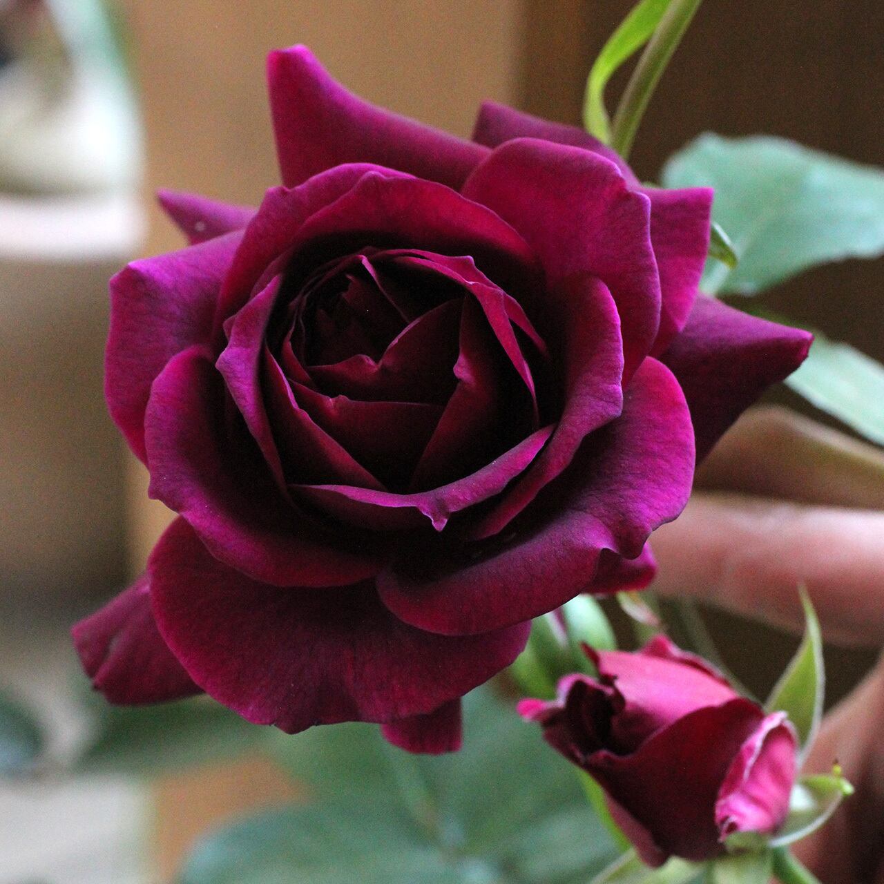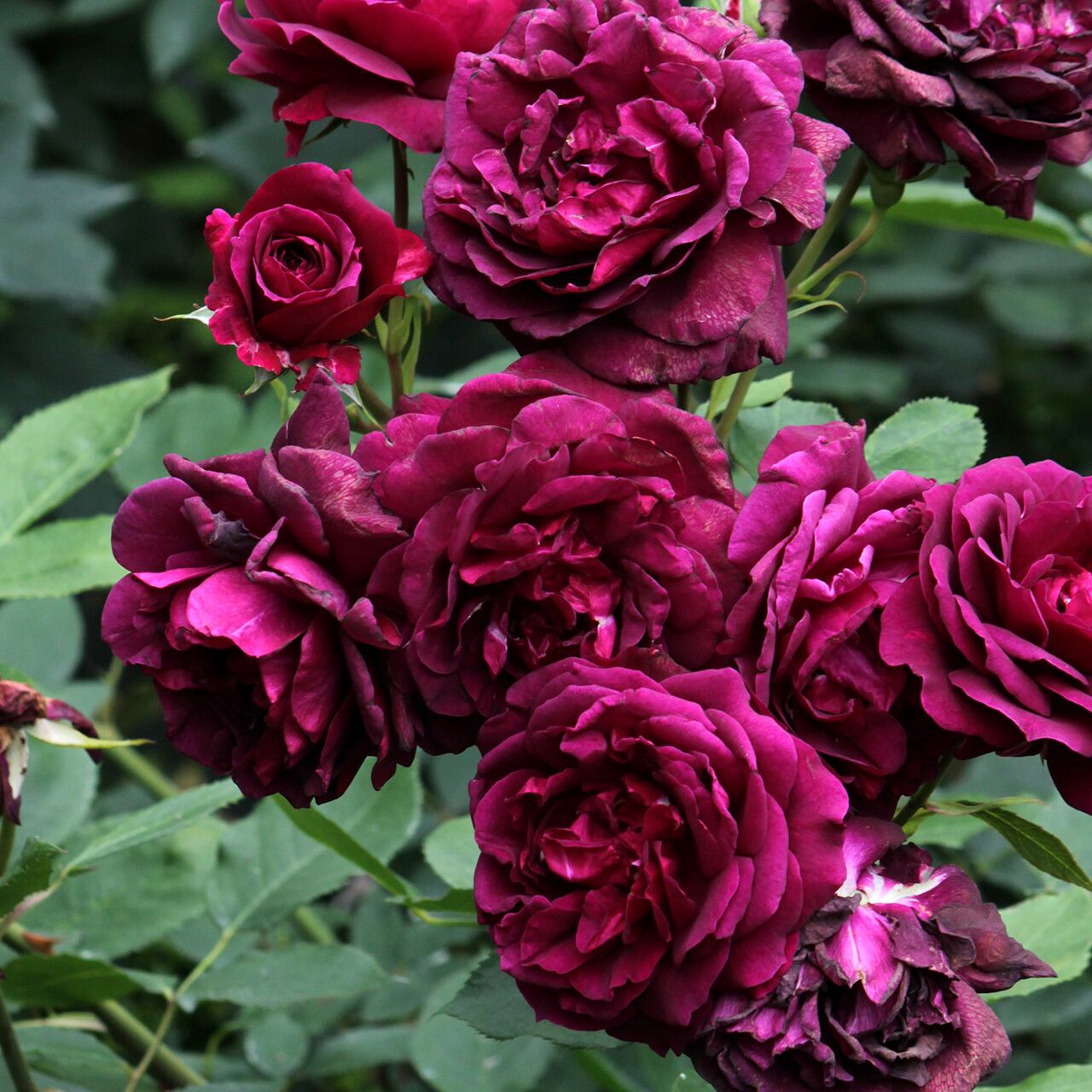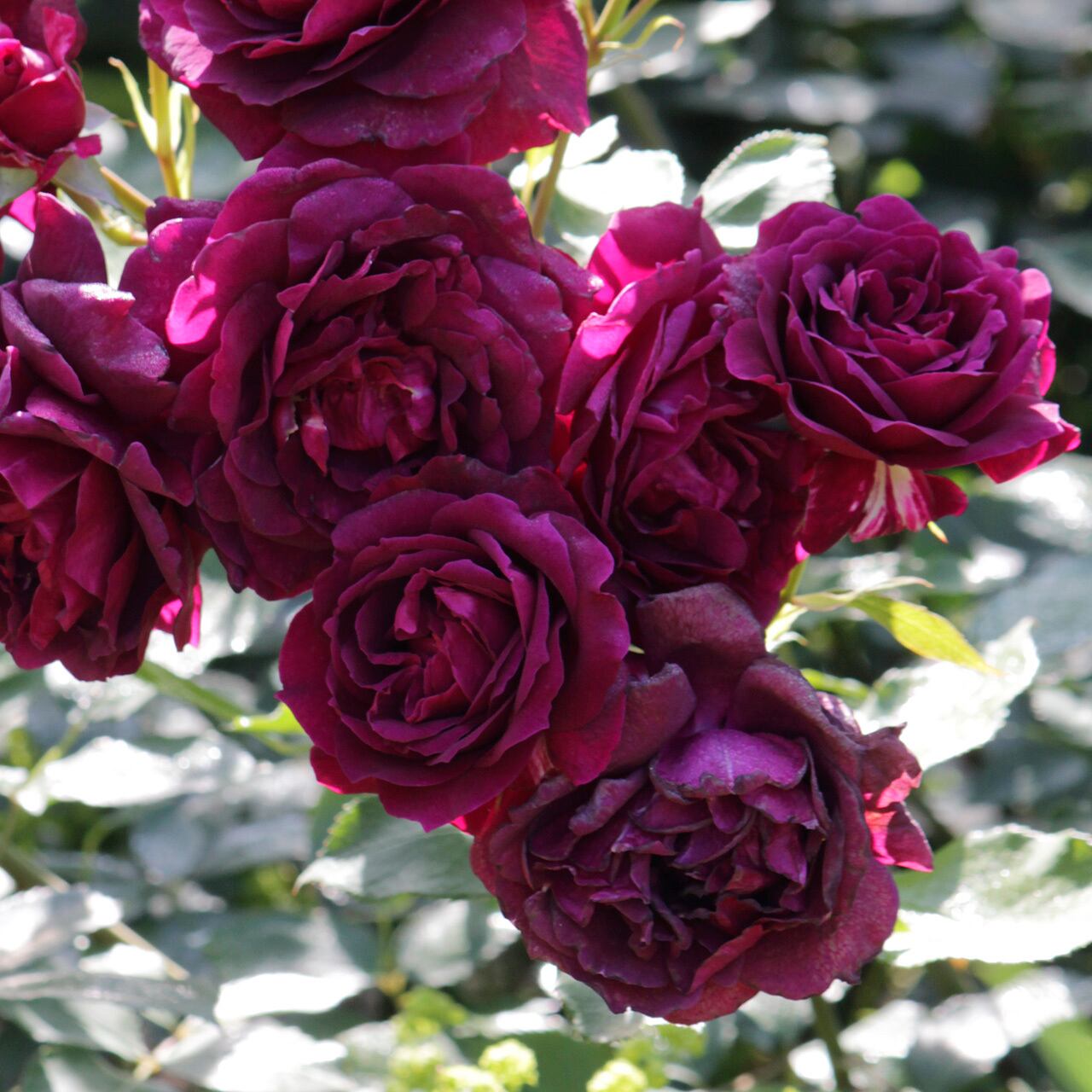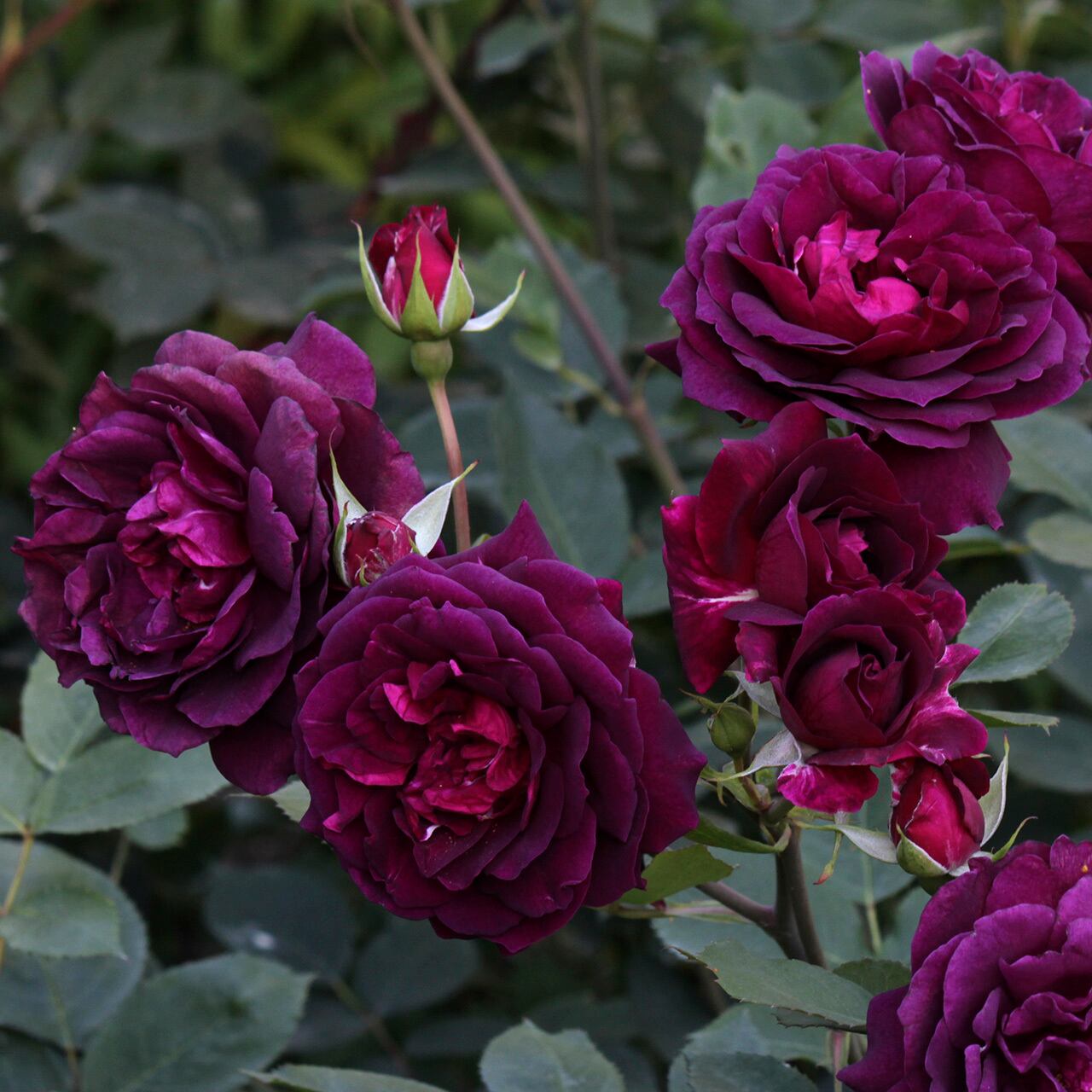 紫みを強く含む黒赤色で、開花後にブルーイングをして見事なロイヤル・パープルに変化する。早咲き性のため、気温の低い時期に開花するので他の同色系品種よりも発色が良く、花保ちが良いためブルーイング後の美しい色彩を長く楽しめる。花には典型的な濃厚なダマスク系の香りがあり、その香りは「さわやかなフルーツと粉っぽさと密の甘さ、こくのあるクローブがバラらしい香りと調和した華やかで芳醇な香り」と評されている。数輪の房咲きになり、花付きがとても良い品種。株は適度にまとまり、枝はしなやかさがあり、広がりを見せ、混植でも他の植物とよく馴染む。従来の黒バラのように樹型が暴れることがなく、トゲが少なく扱いやすいのも特徴。本品種の最大の魅力である深みのある色彩を出させるには、鉢栽培にして開花後に半日陰に移動させたり、建物の東面などに植えるのがおすすめ。樹勢が強く、初心者にも向く。第5回国際香りのばら新品種コンクール金賞、同新潟県知事賞(ベスト・フレグランス賞)、同国土交通大臣賞(ベスト・ローズ賞)を受賞。