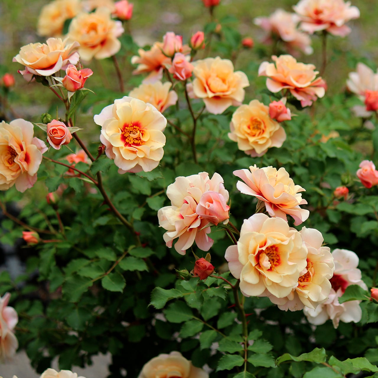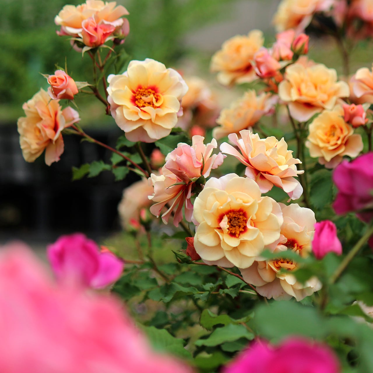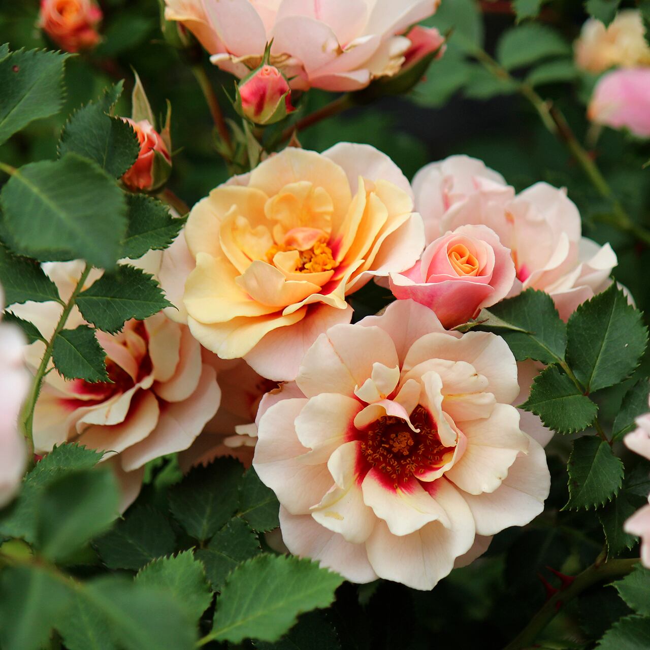 花弁の縁がやわらかく波打つ花は、オレンジ、アイボリー、ピンクと環境により様々な表情を見せる。花の中心に入る濃いクランベリーピンクのアイが魅力。花付きが良く、特に春は株全体に花を付け、とても華やか。株はやや横張りで、コンパクトにまとまるため鉢植えにも向く。